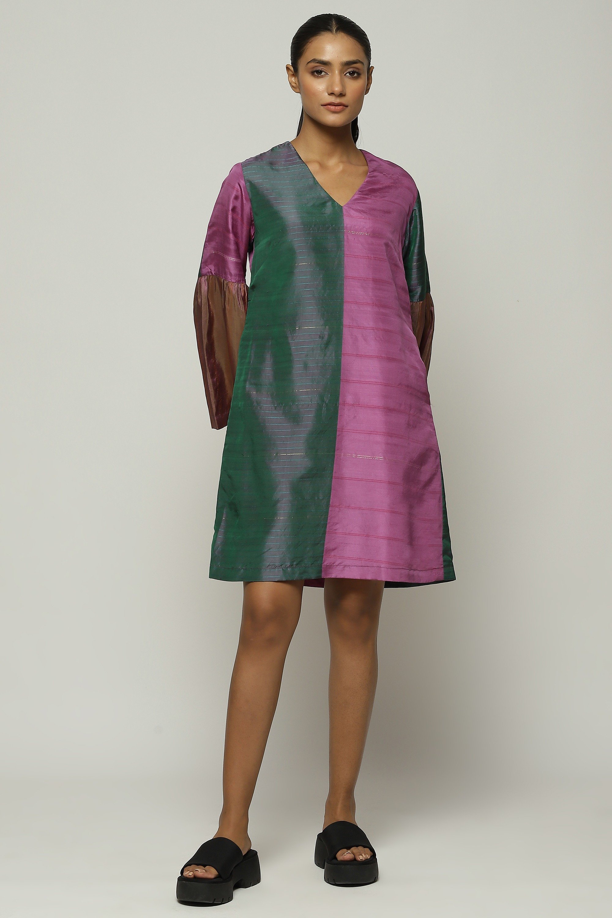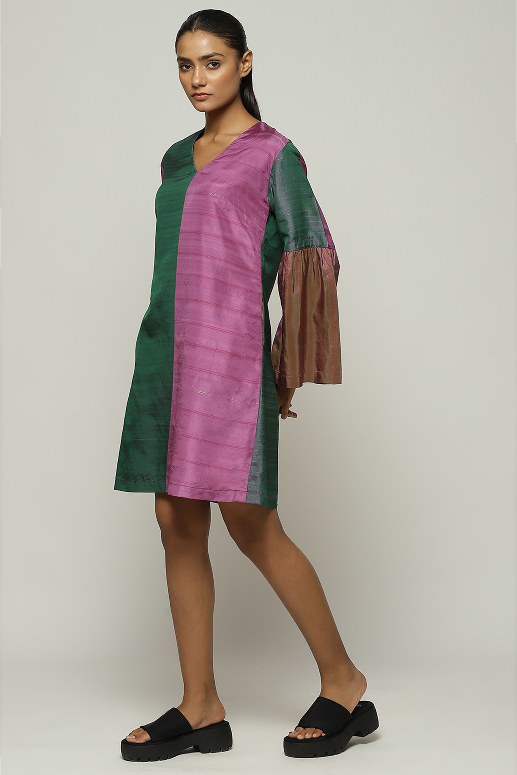 GREEN MULTICOLOUR WOVEN STRIPES DRESS
