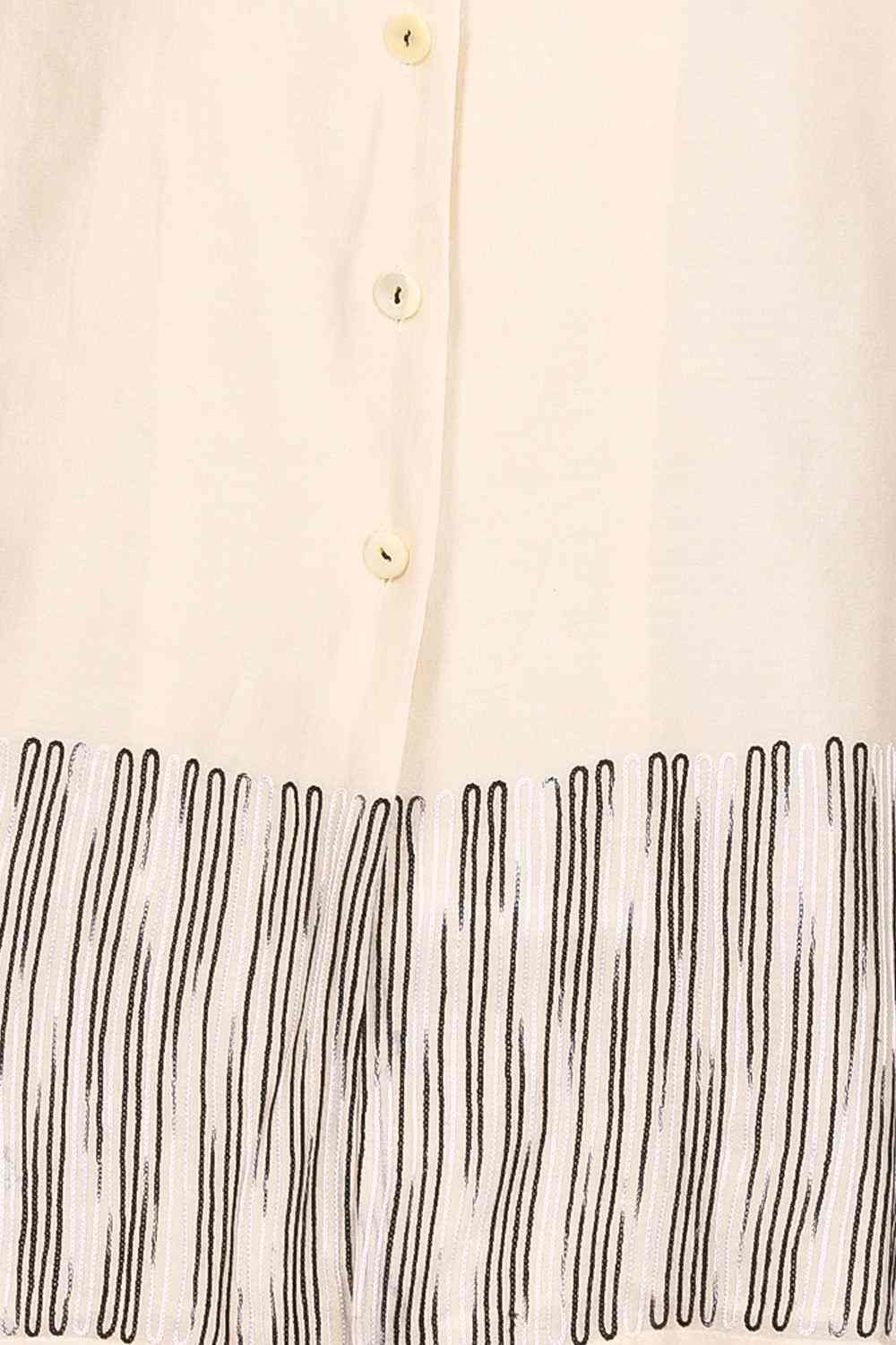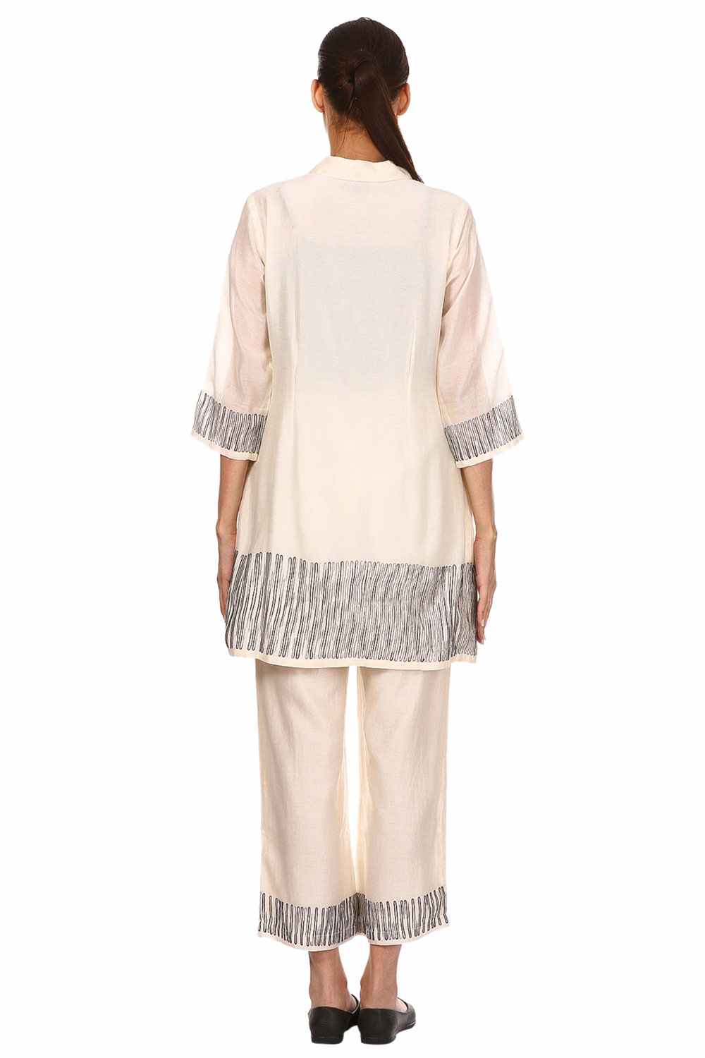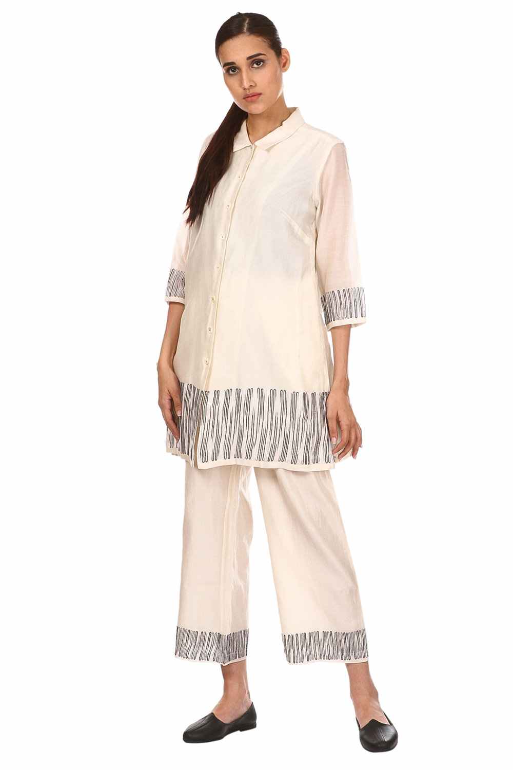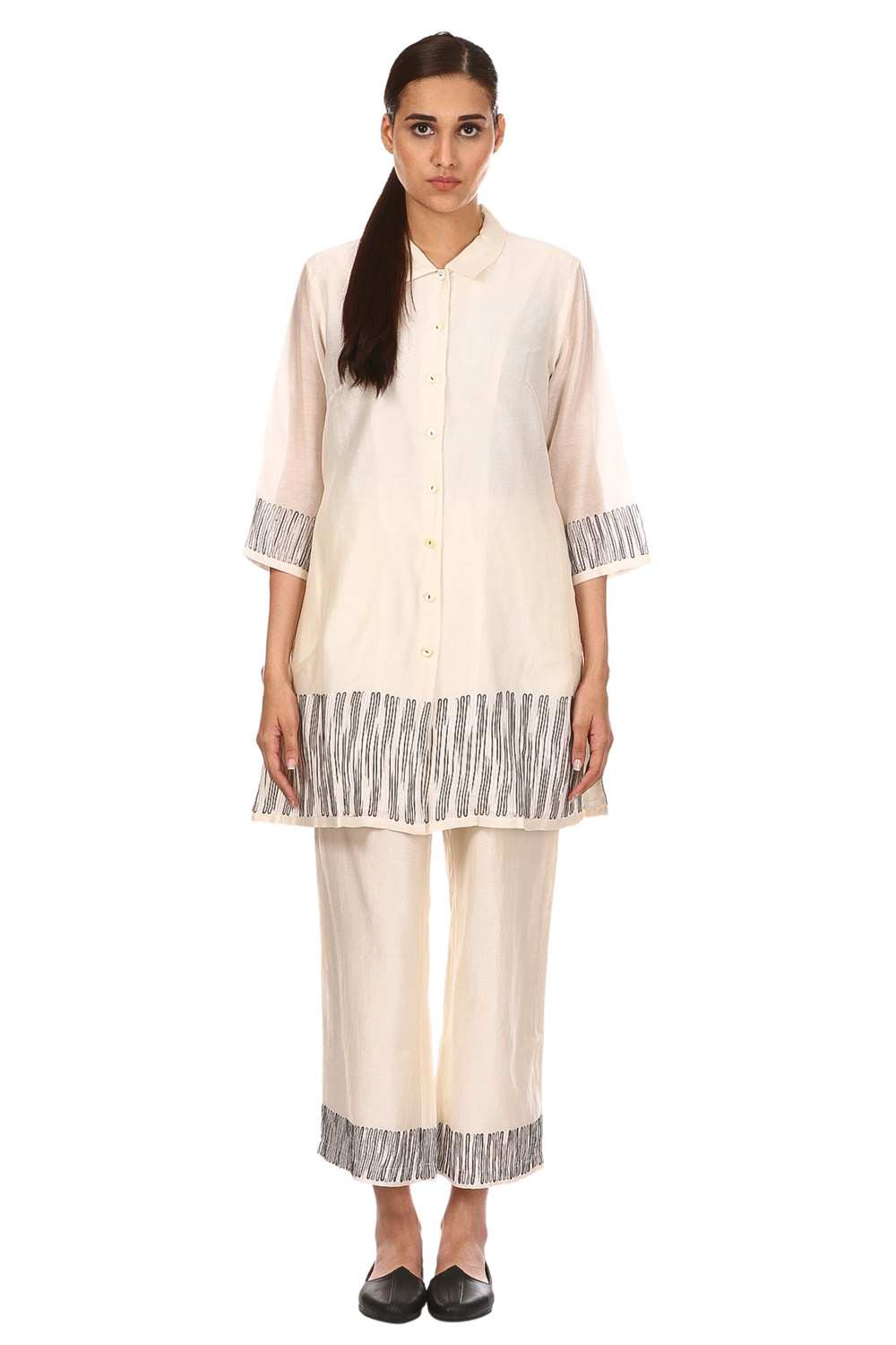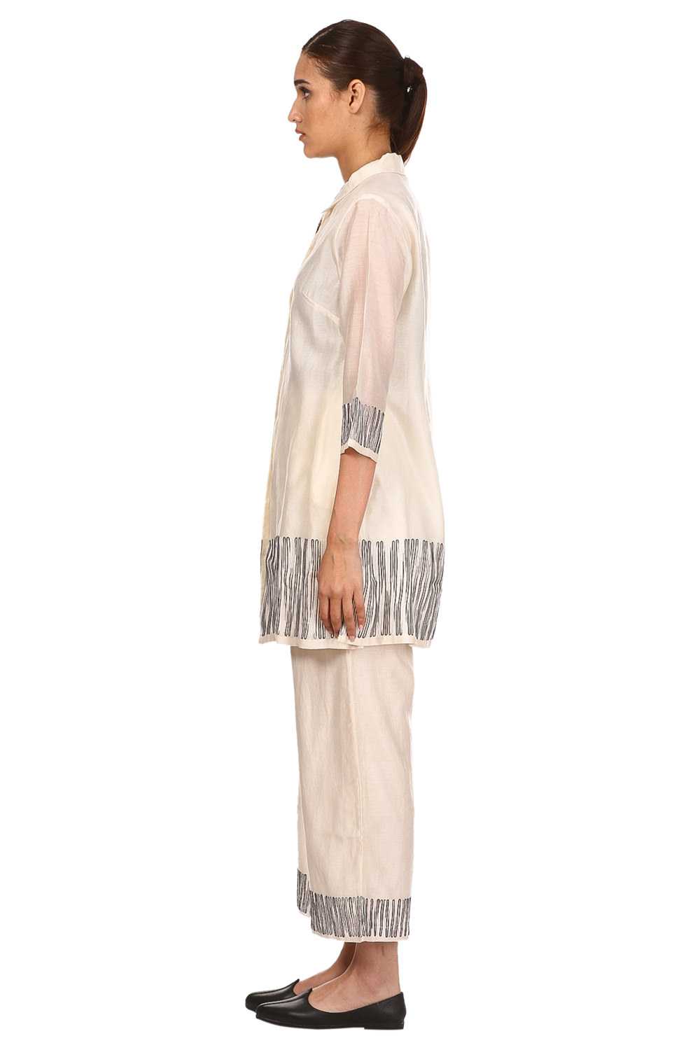 Button Down Tunic And Straight Pants Coordinate Set. Ombre Aari Embroidery At Hem And Sleeve Ends. Special Mother Of Pearl Buttons. Available In One More Colour Option.