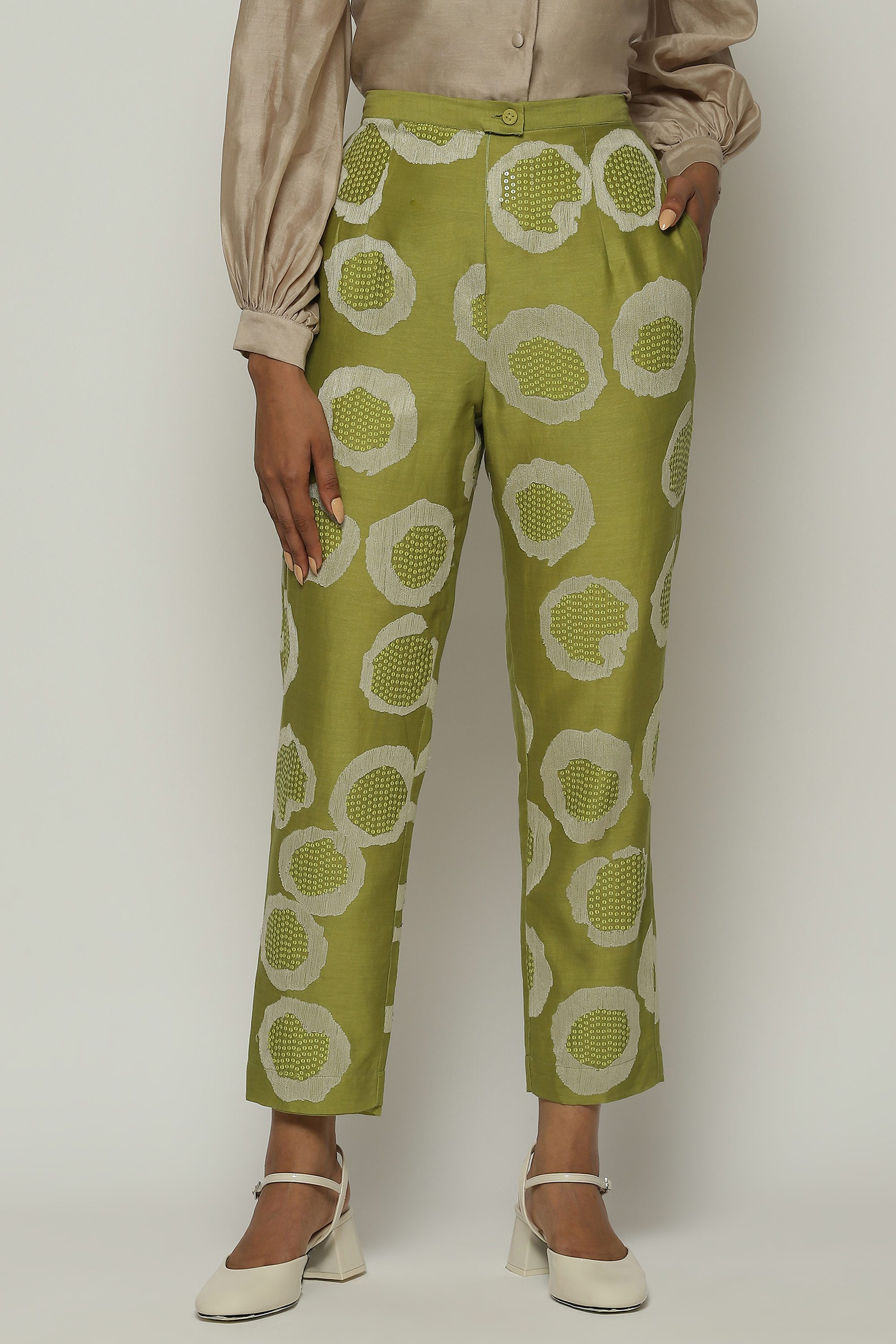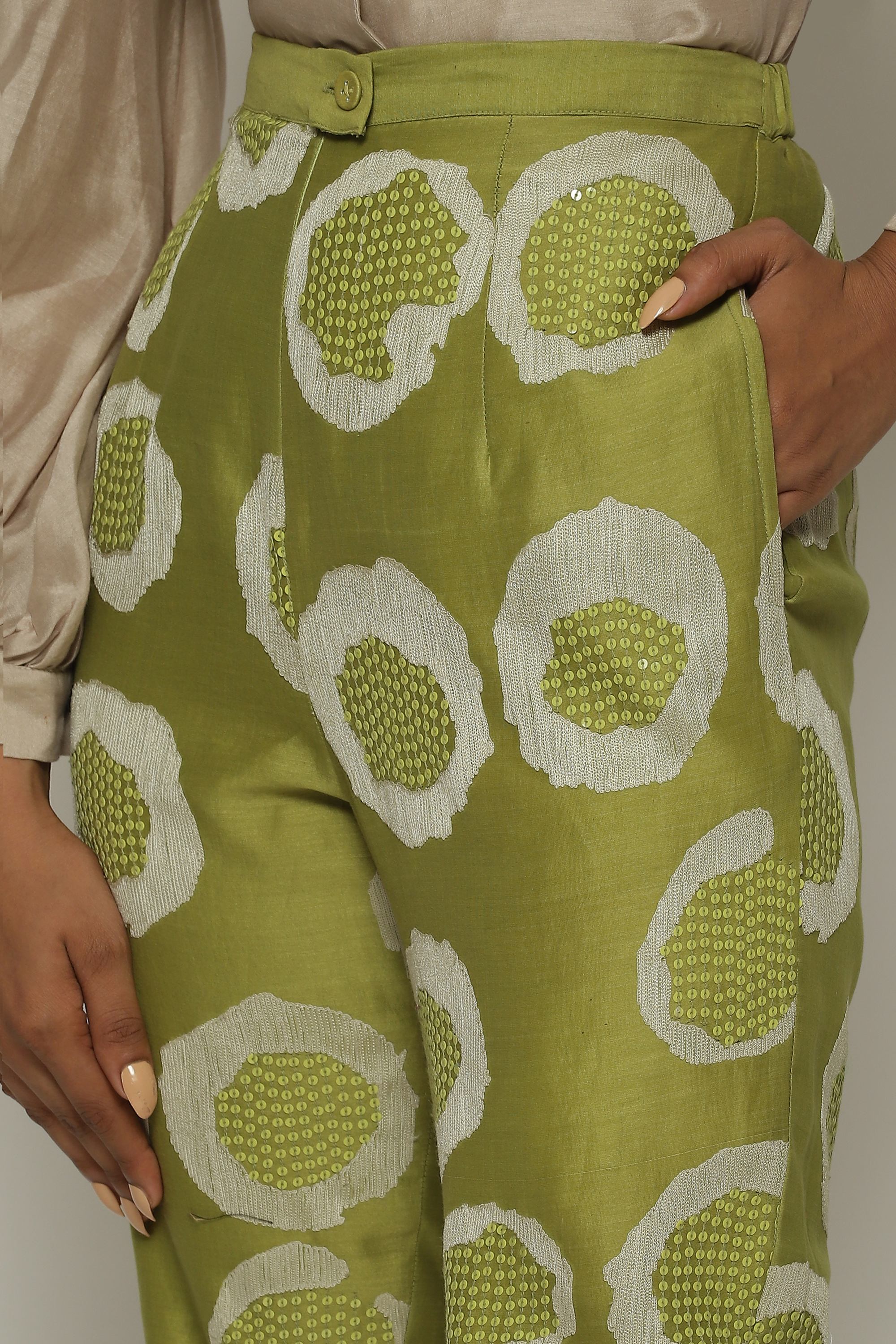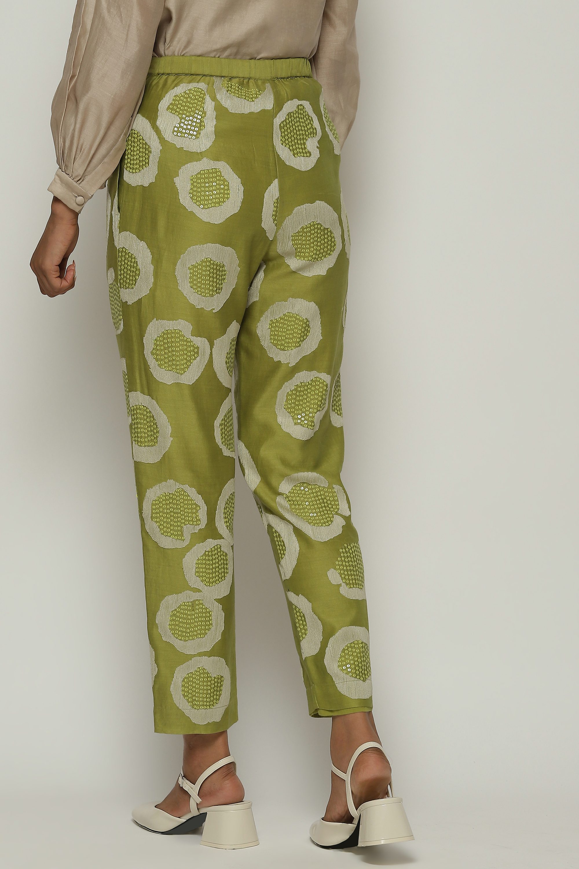 A pair of tapered amla pants, featuring sequins and aari rings.