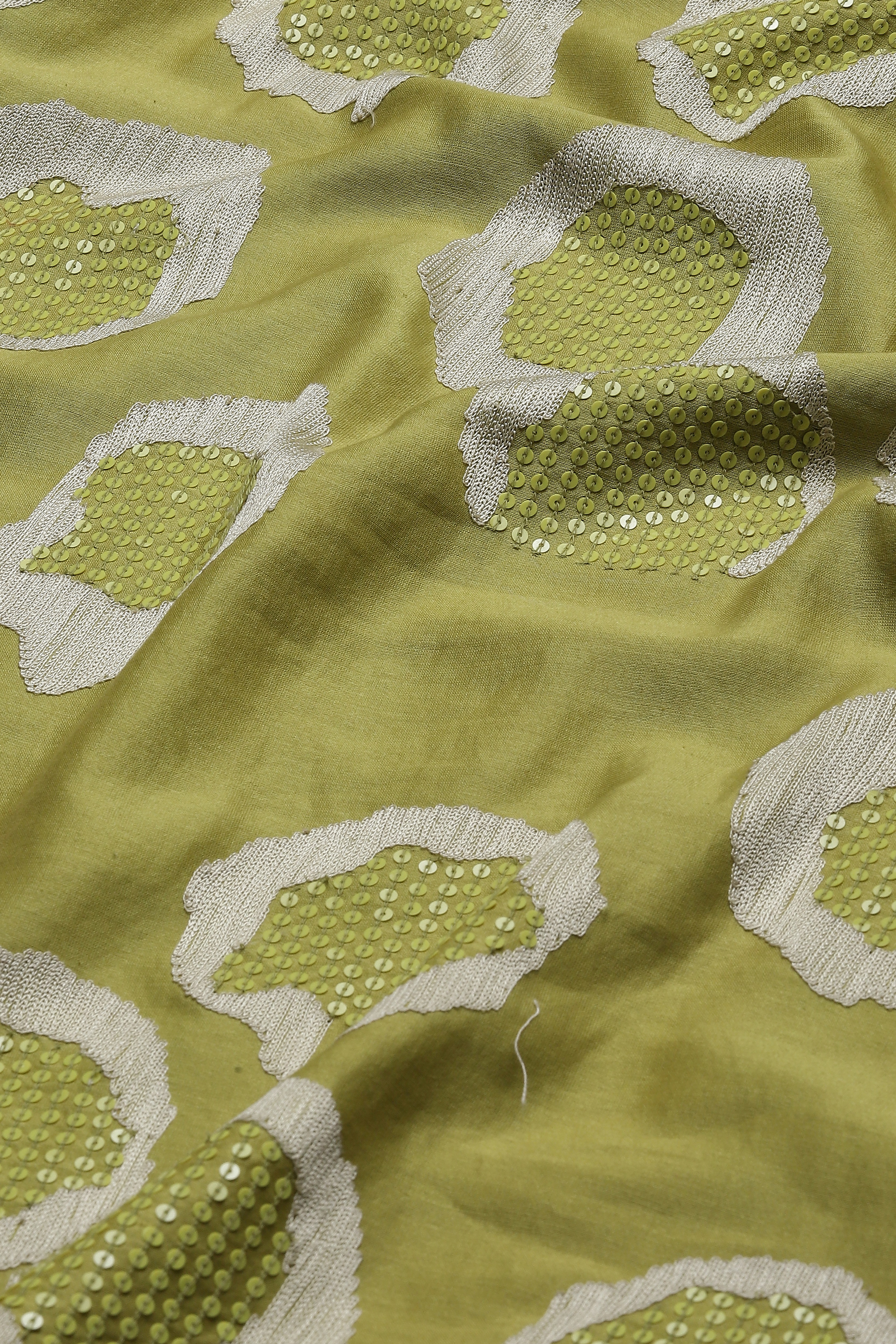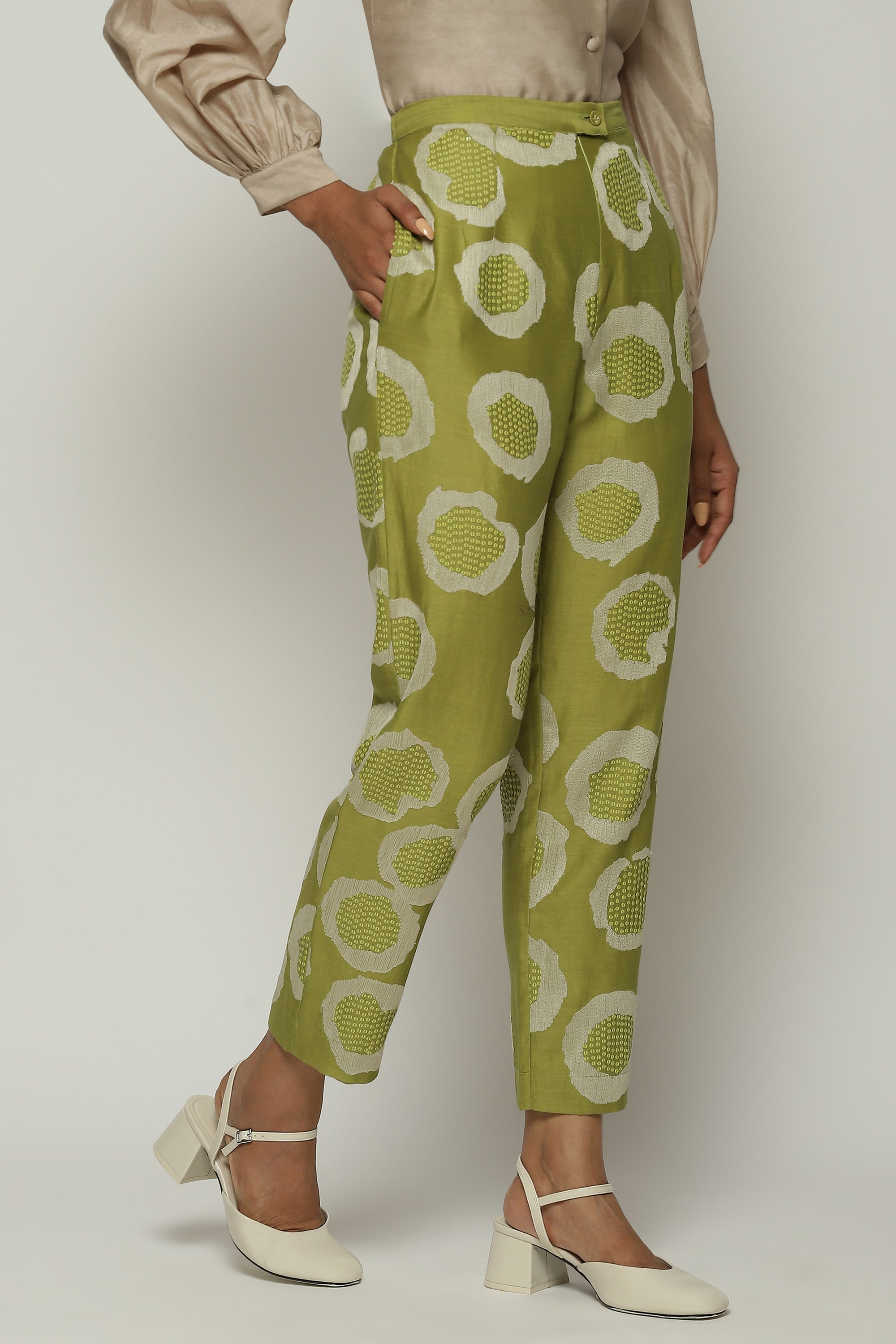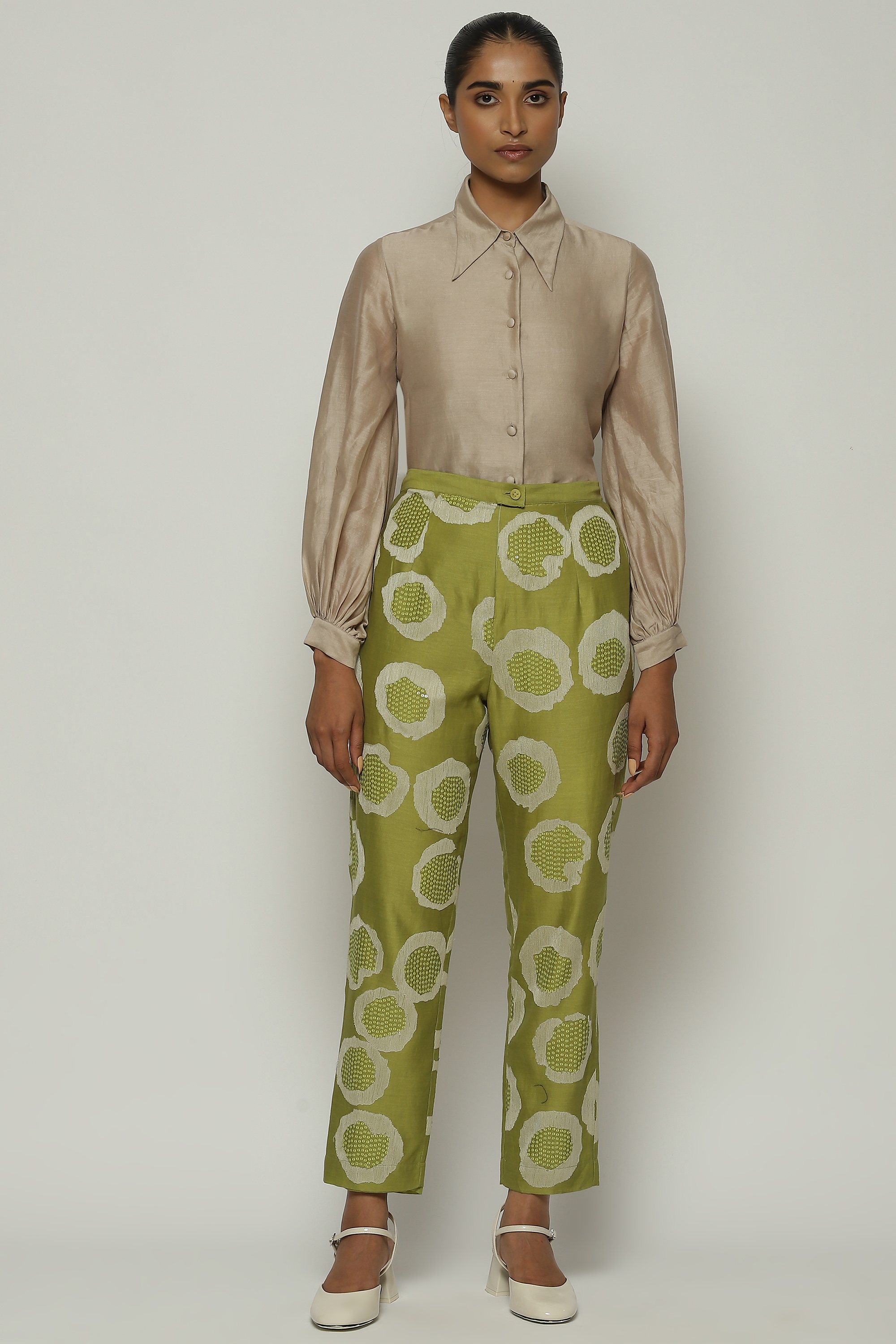 A pair of tapered amla pants, featuring sequins and aari rings.