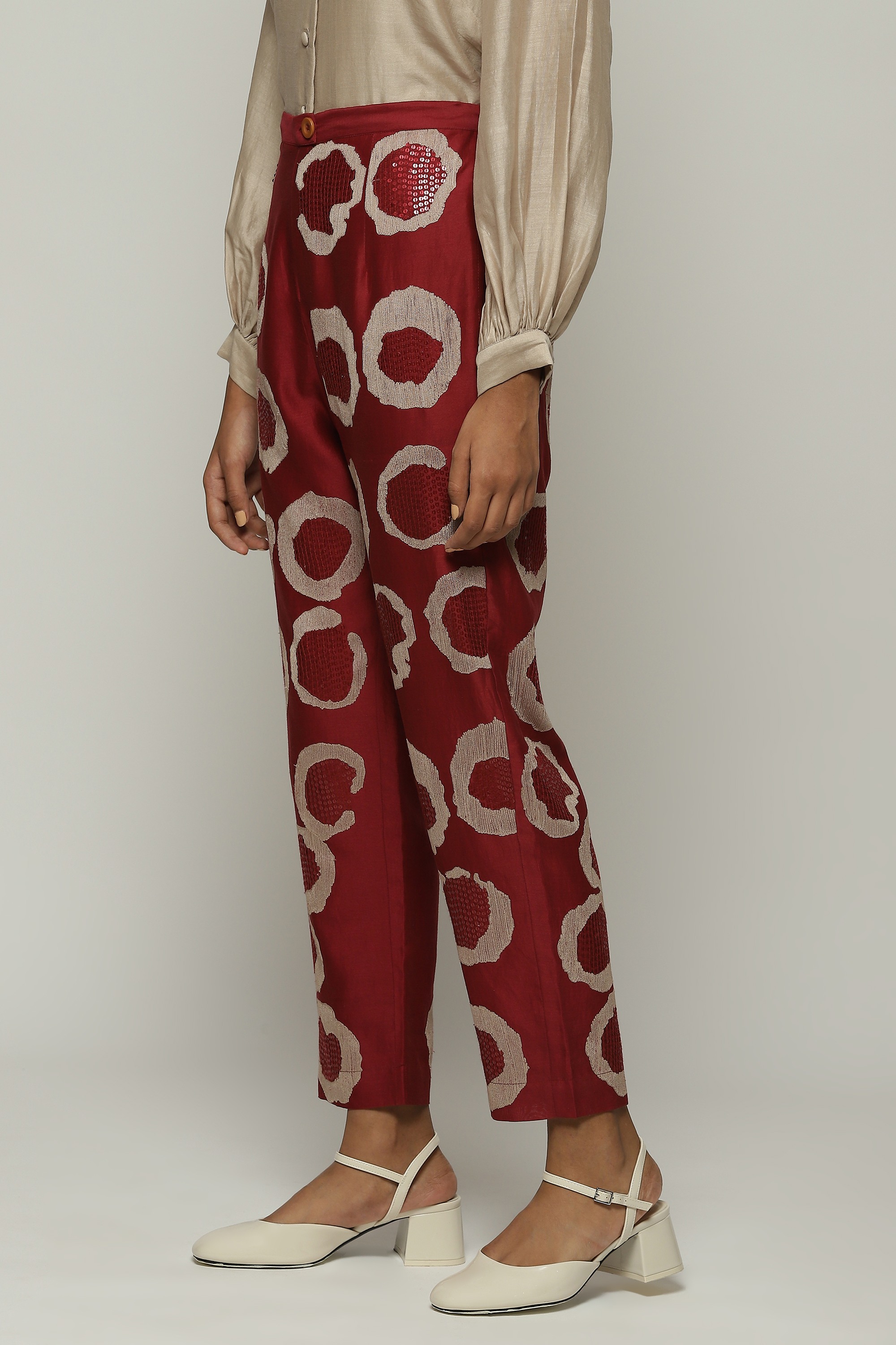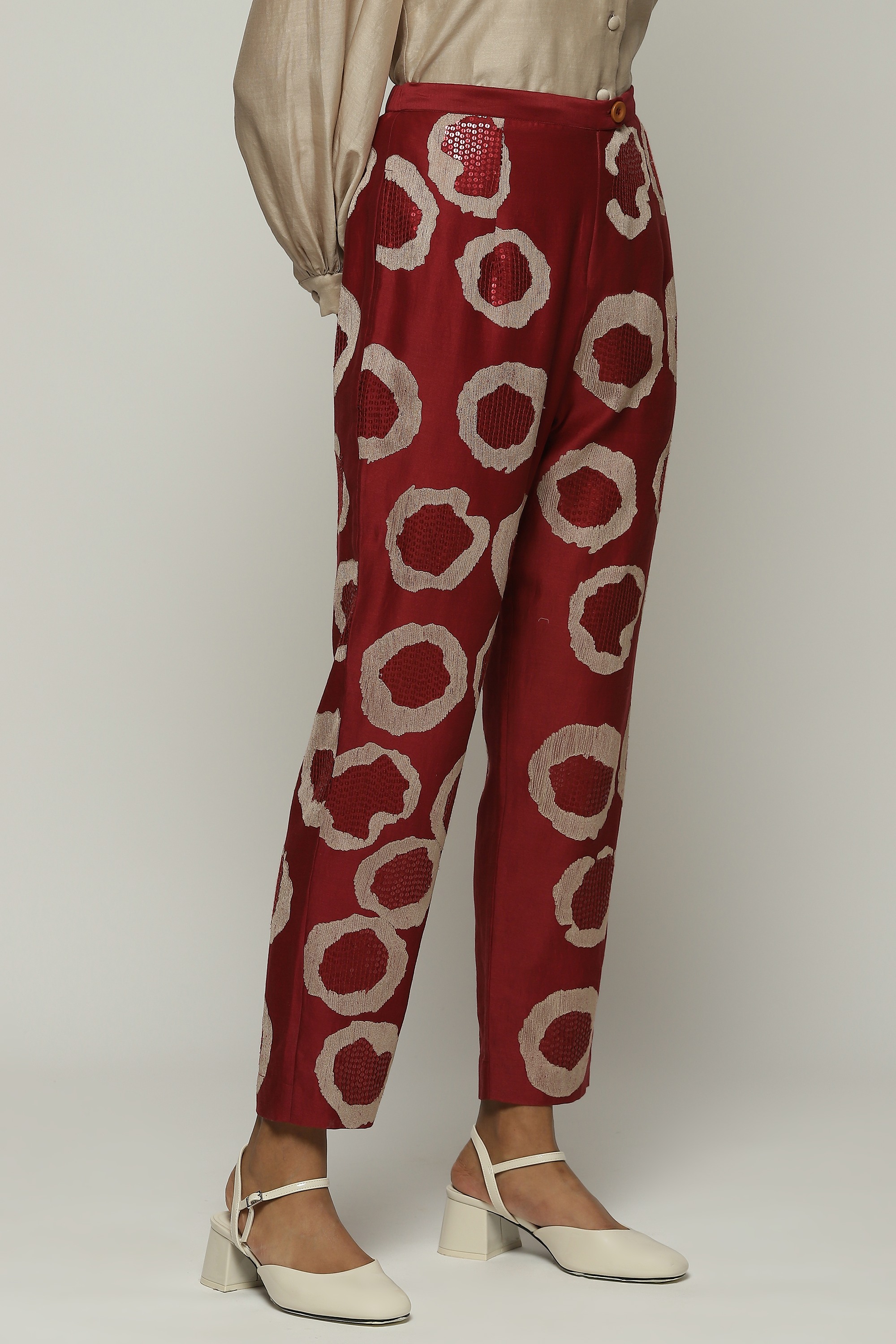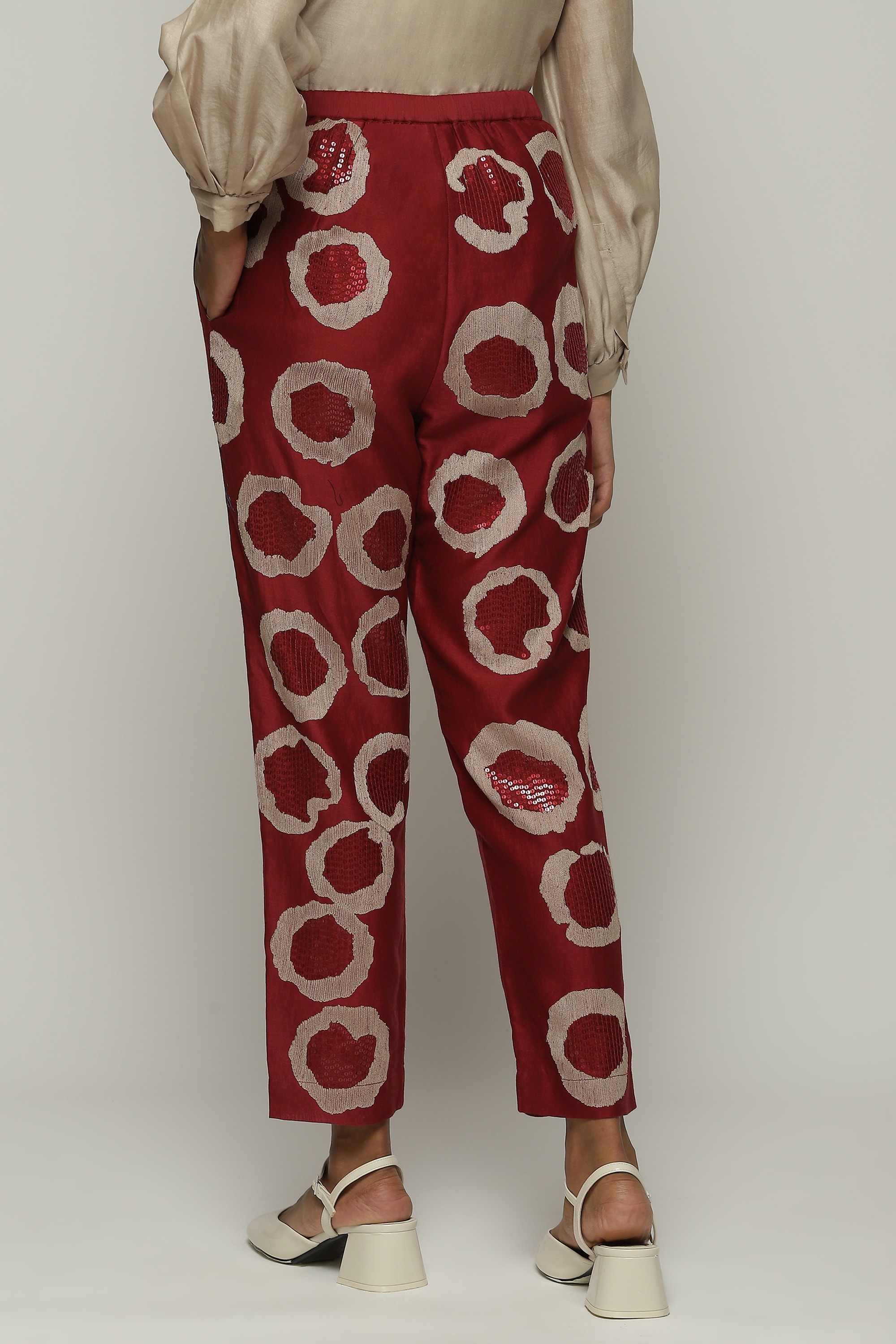 A pair of tapered pants in the hues of a fine wine, embroidered with sequins and aari rings.