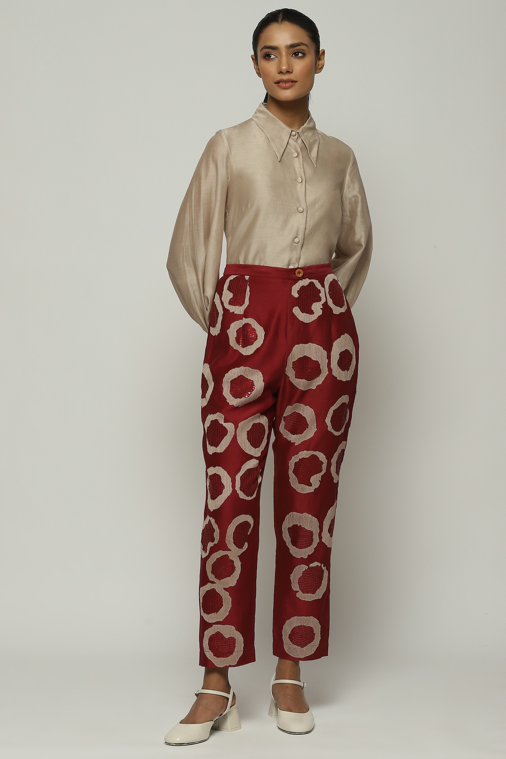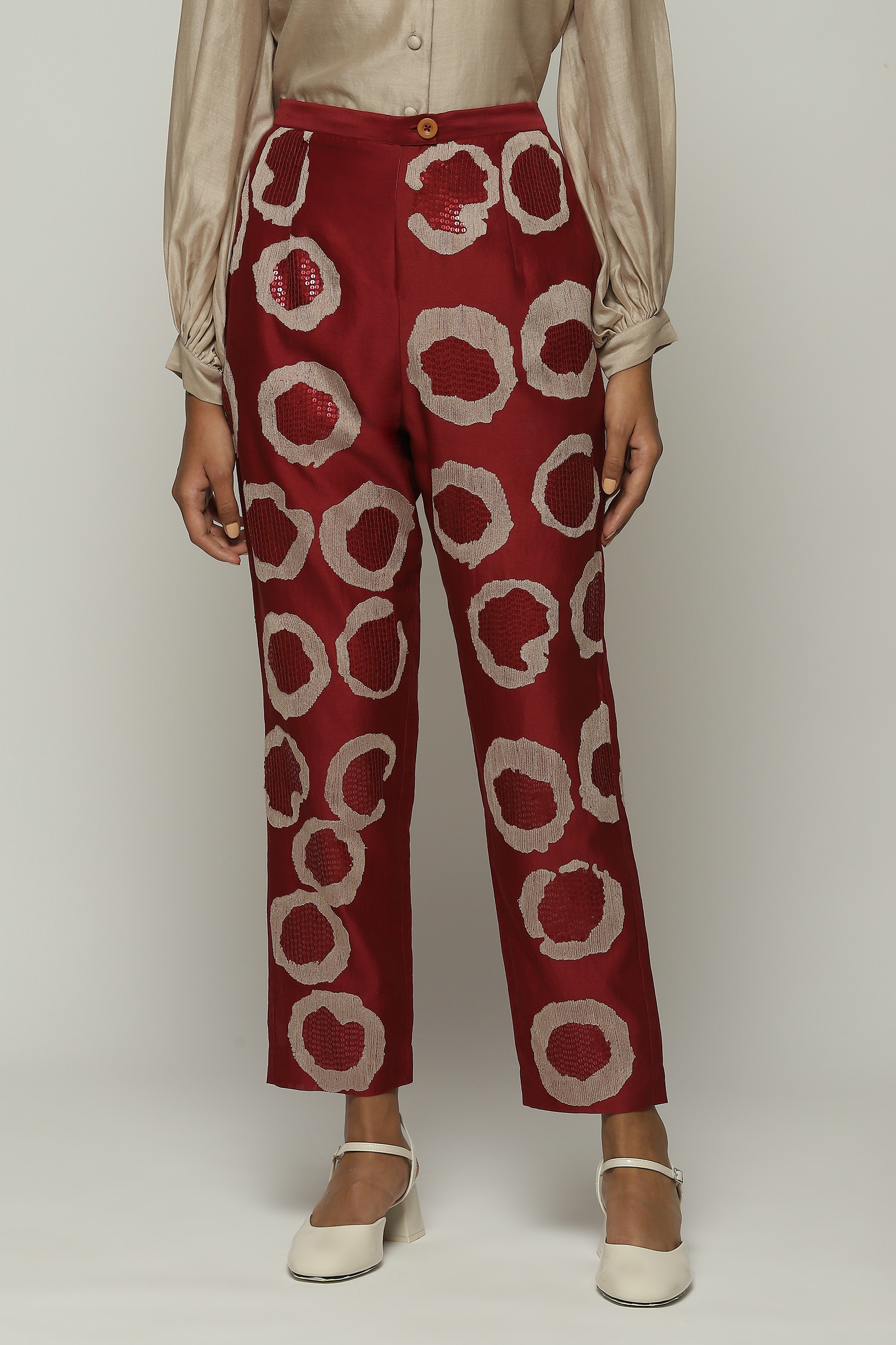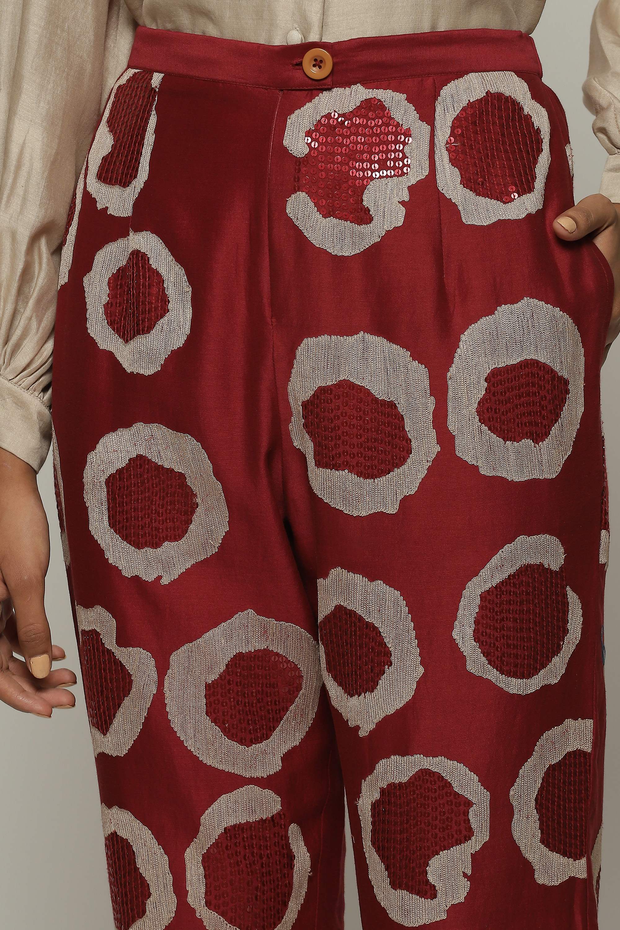 A pair of tapered pants in the hues of a fine wine, embroidered with sequins and aari rings.