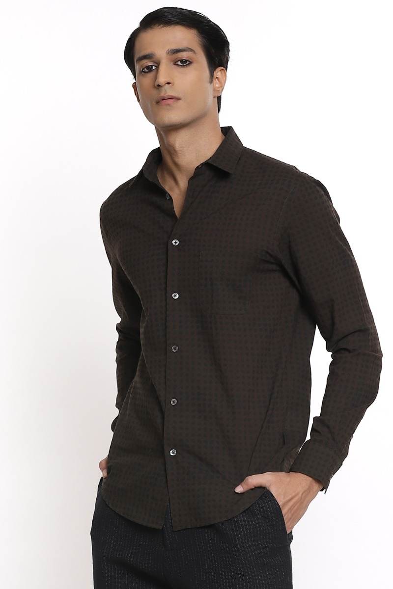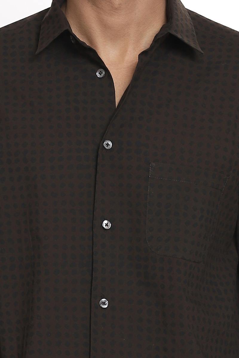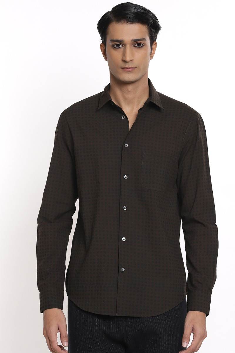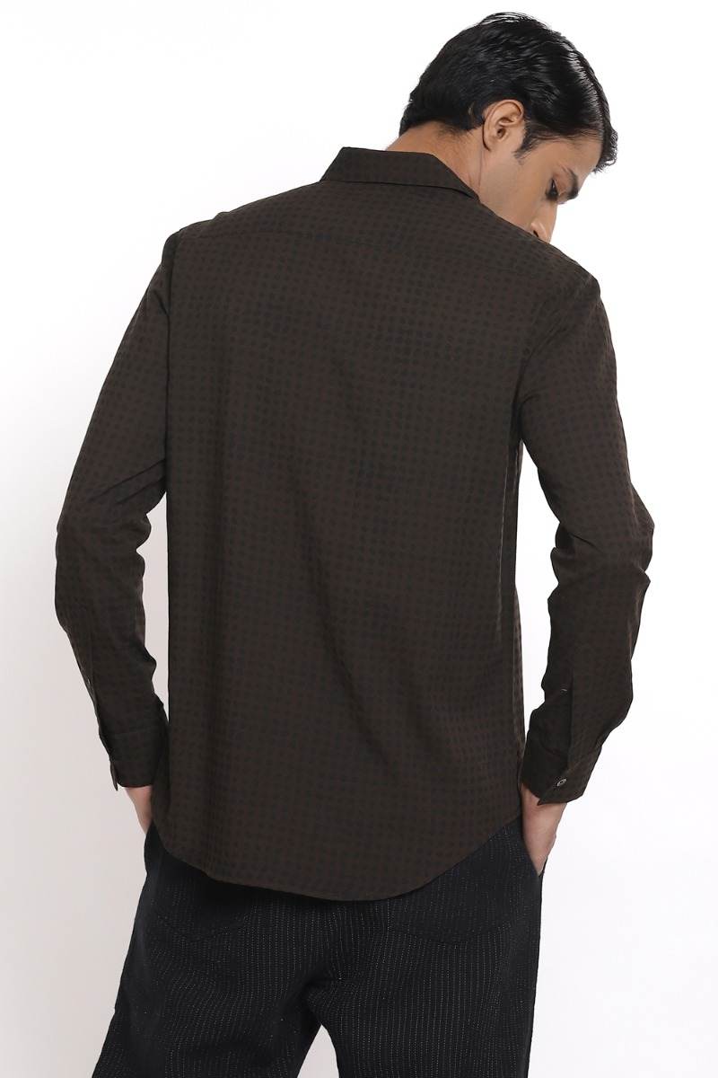 Coffee With Allover Black Dot Print. Abraham And Thakore Shirts For Men Have Been Crafted In Lightweight Natural Textiles In Regular And Slim Fits, Employing Various Traditional Textiles Techniques.