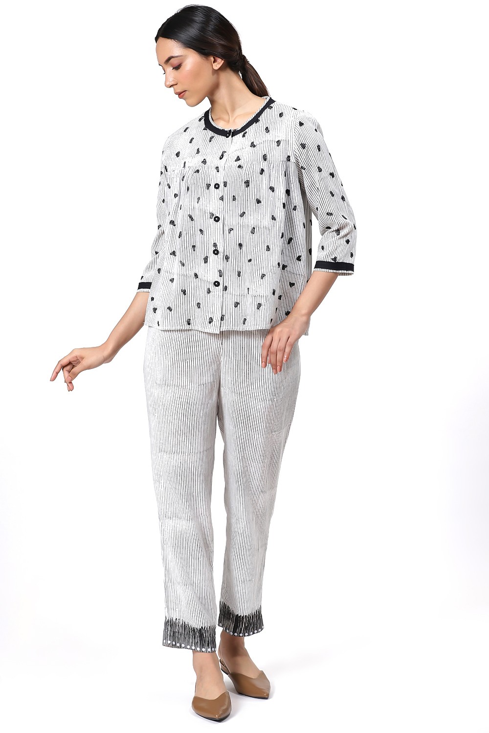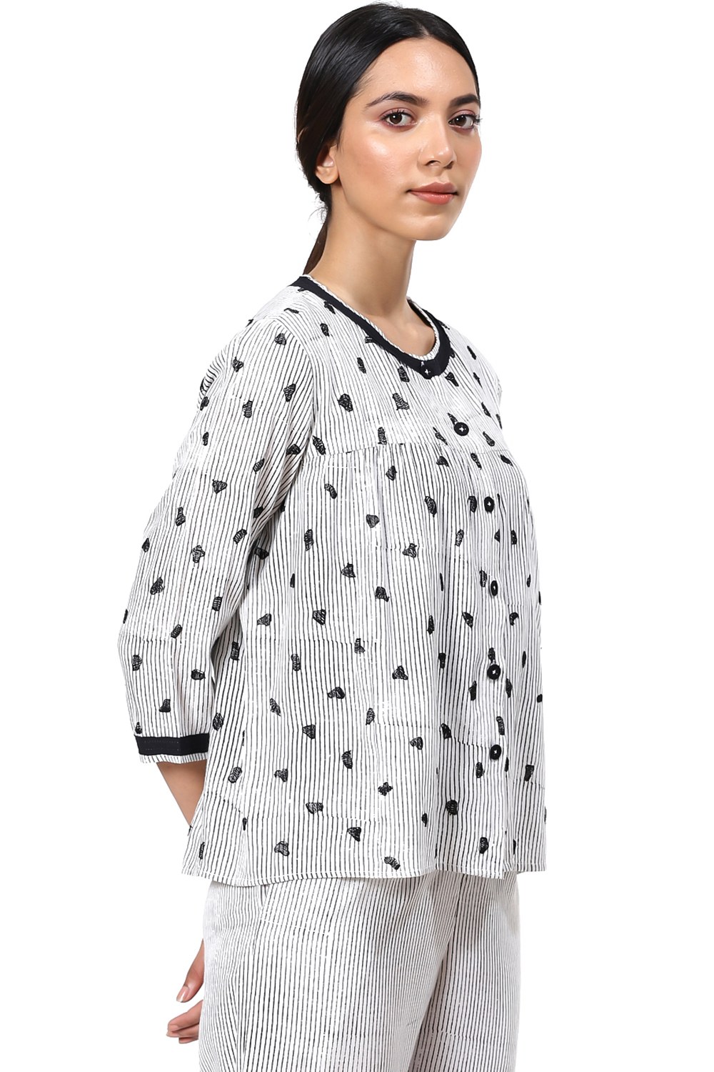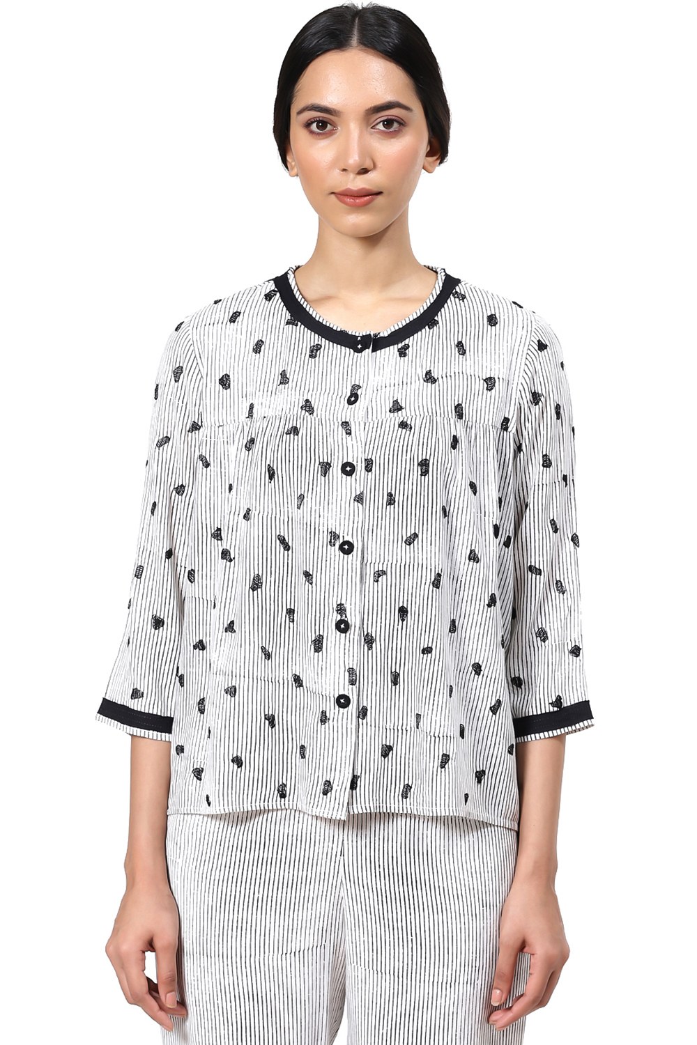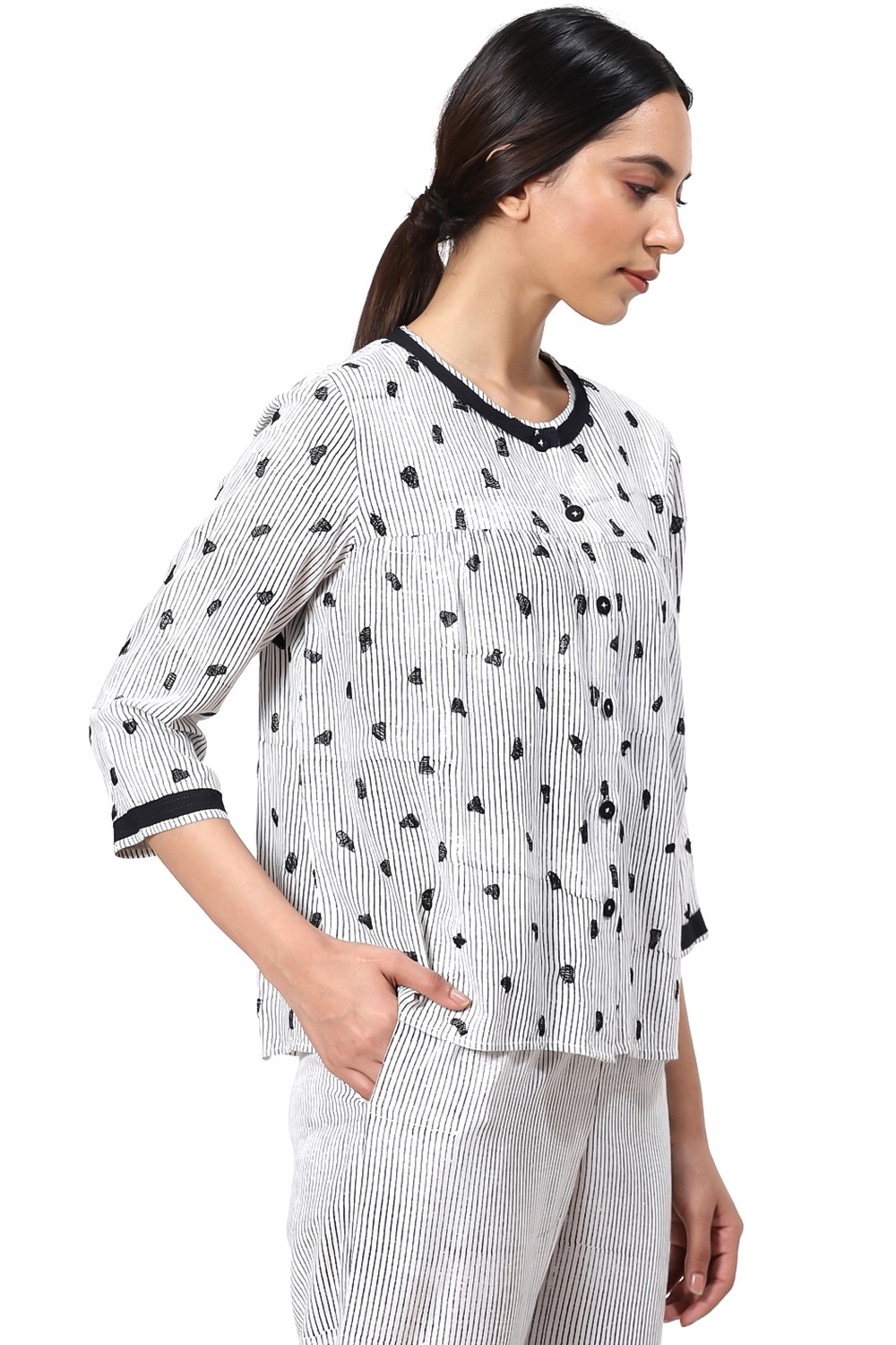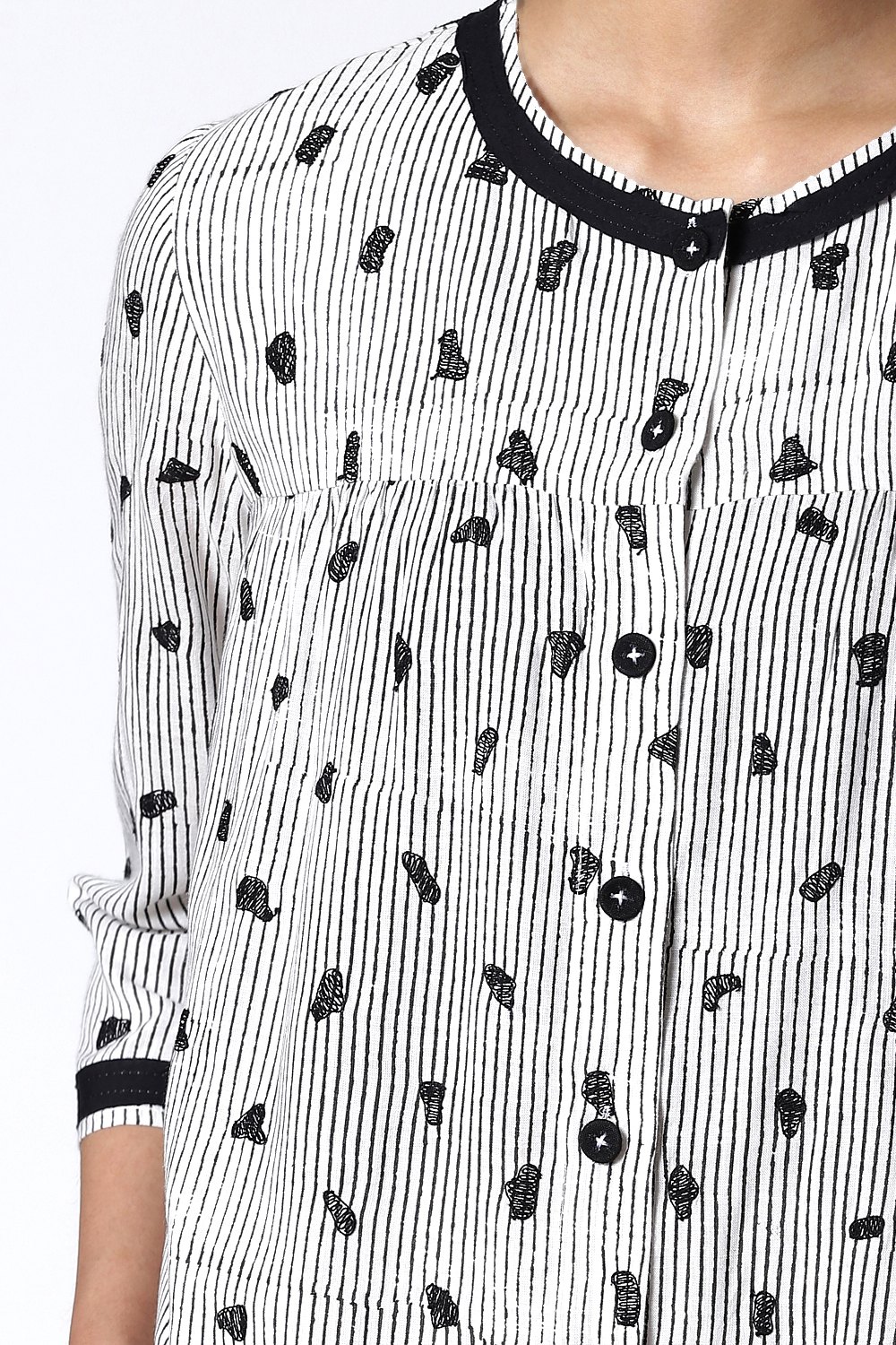 An All Time Favourite Kedia Top, Black And White Animal Dot Embroidery, Crafted From A Cellulose Blend Fabric. An Effortless Daytime Top To Work. Balance The Fluid Shape By Wearing Yours Over Straight Pants. Add Flat Sandals For A Cool Look.