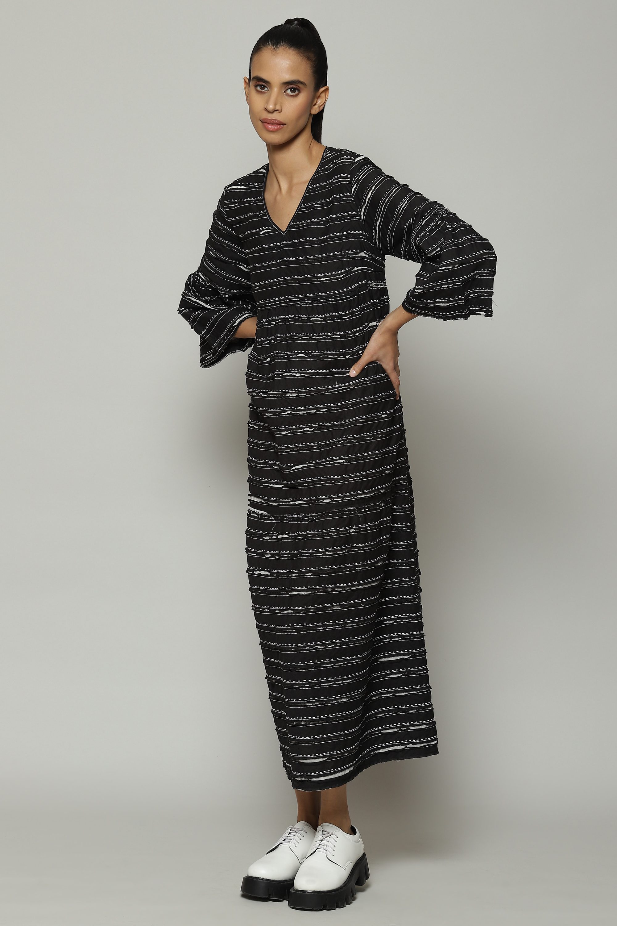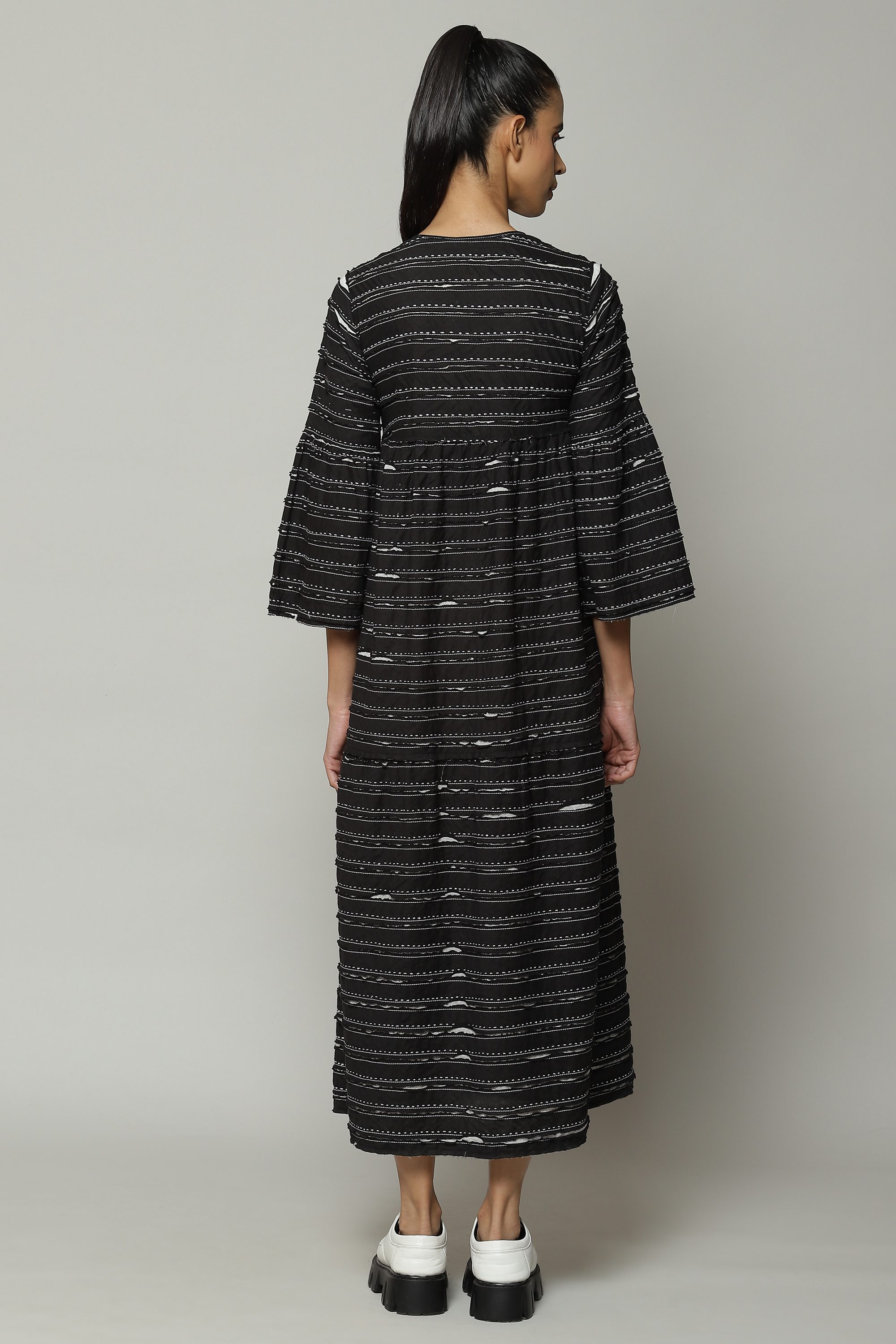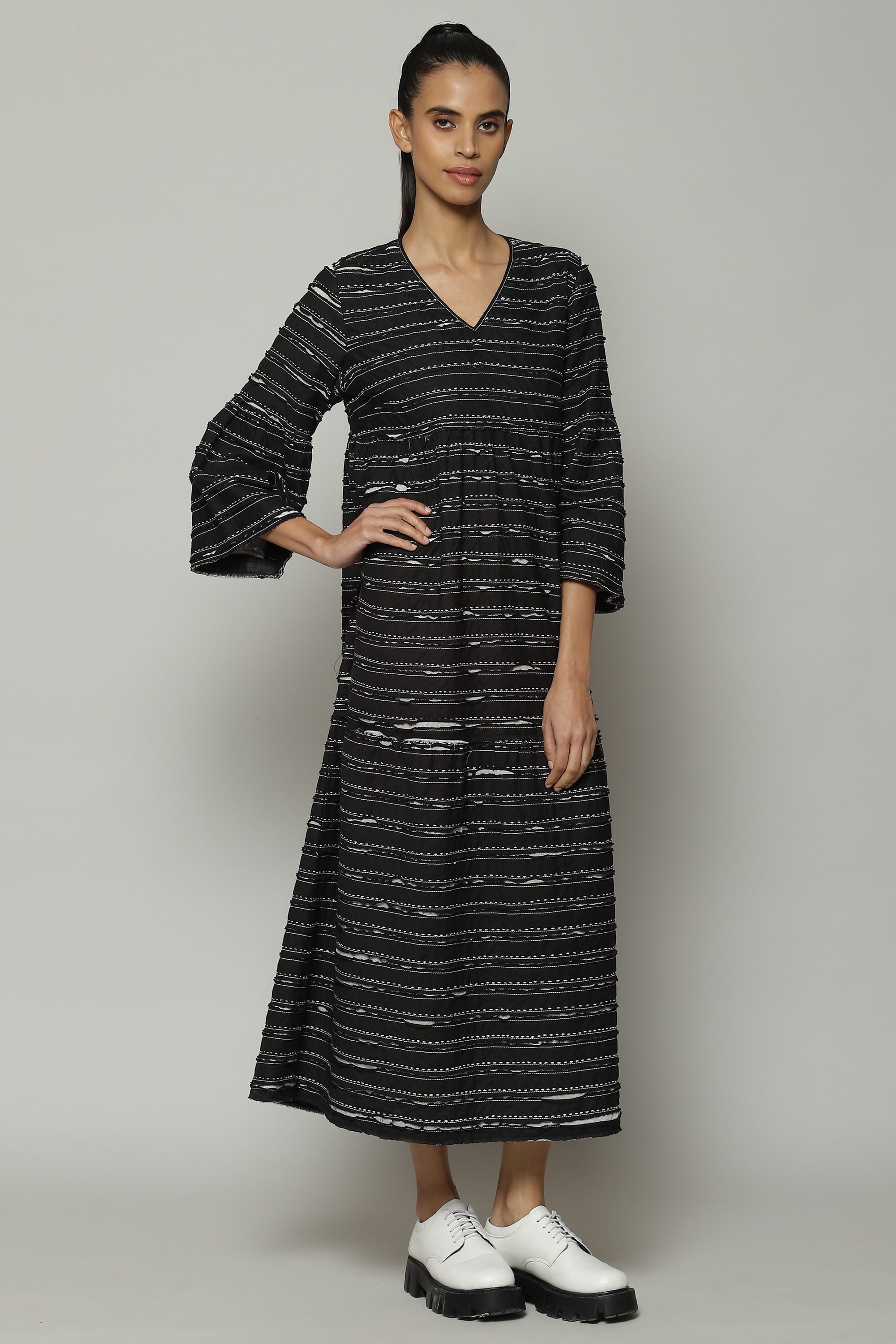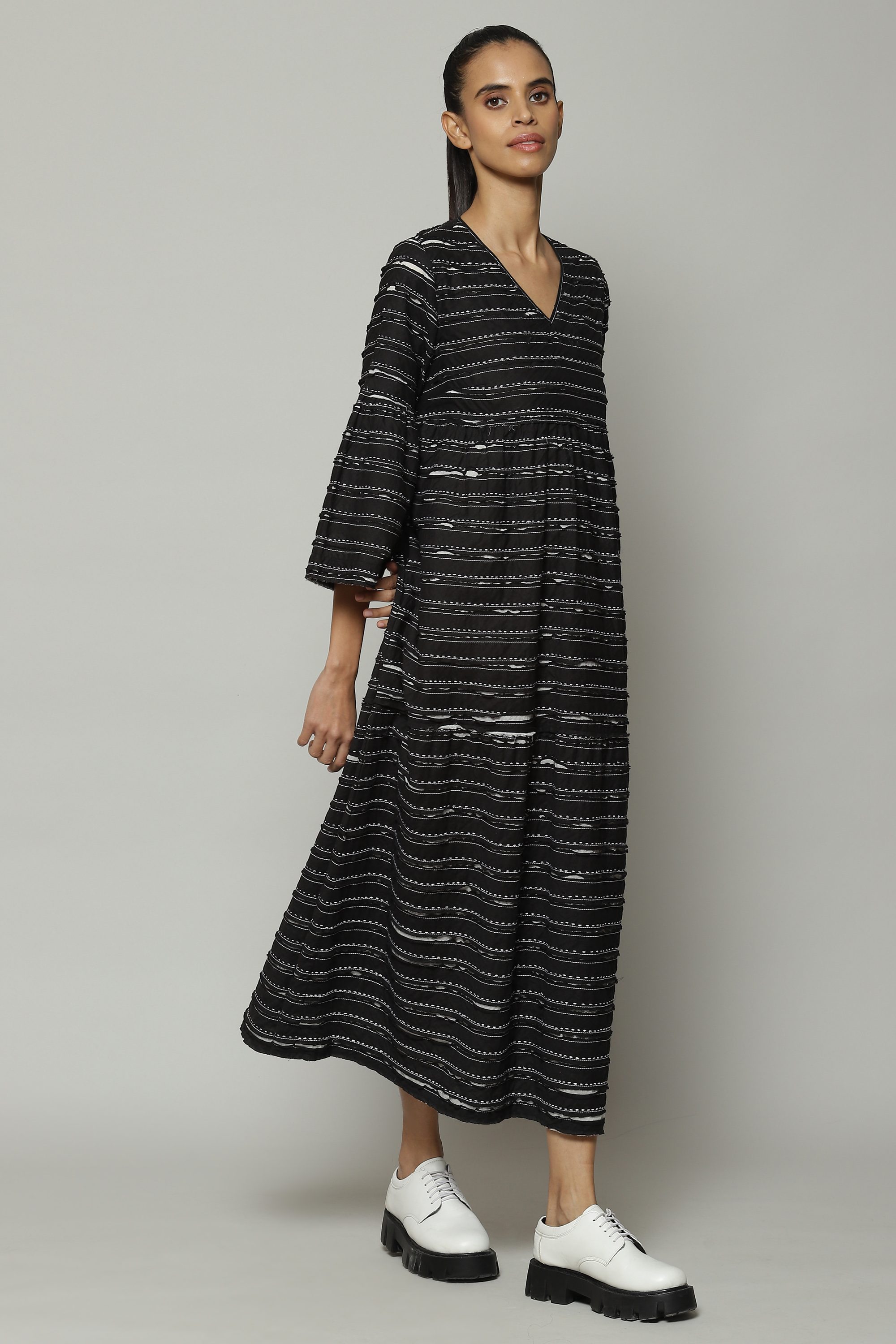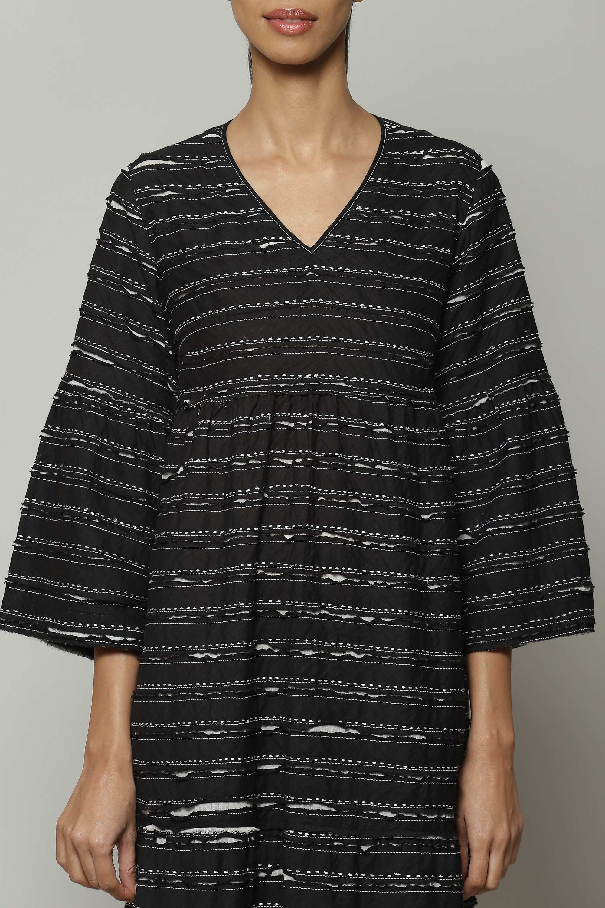 A striking black dress. Silk embroidery runs all the way around this soft cotton voile that has been cut after appliqué. Ideal for friendly, summer gatherings.