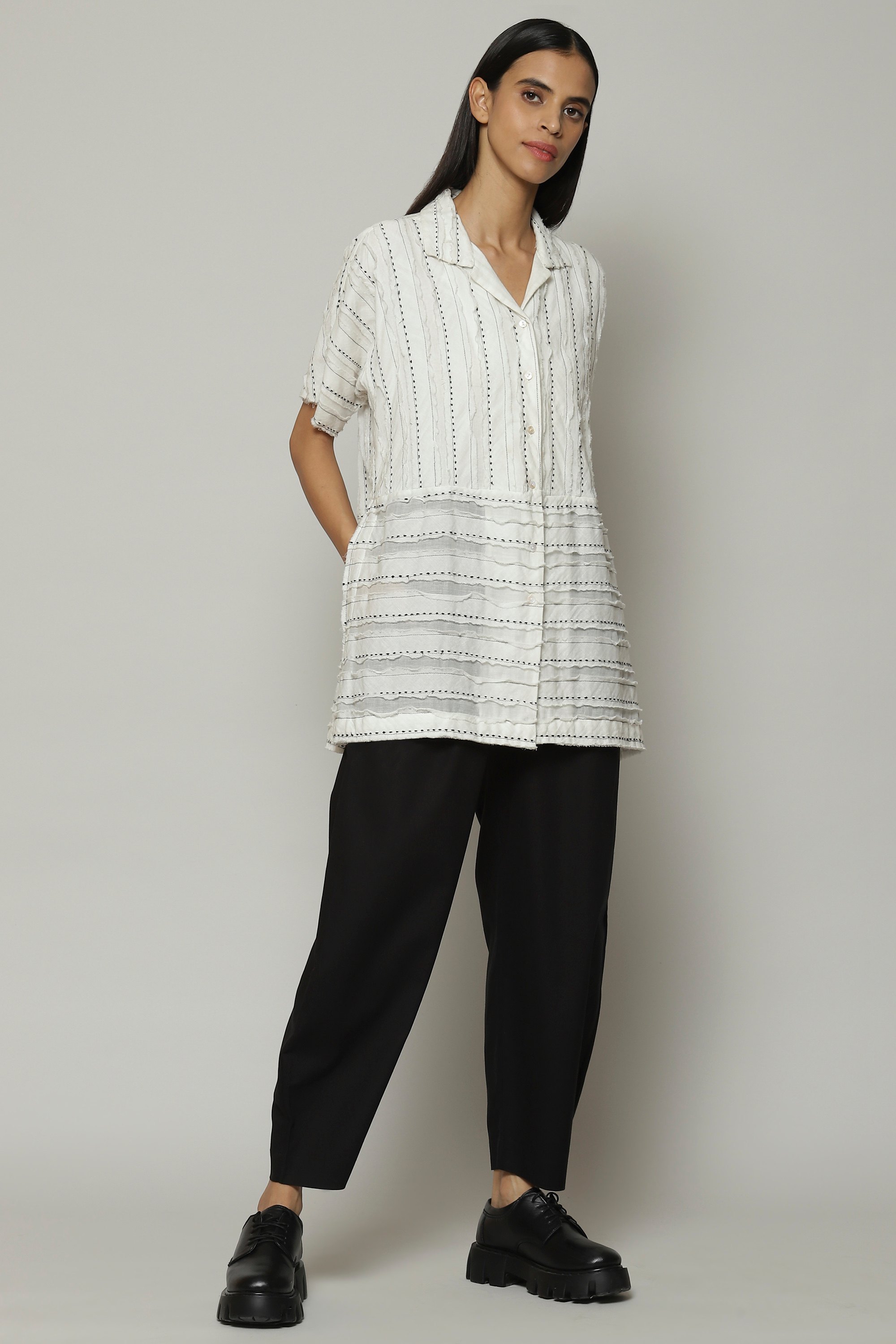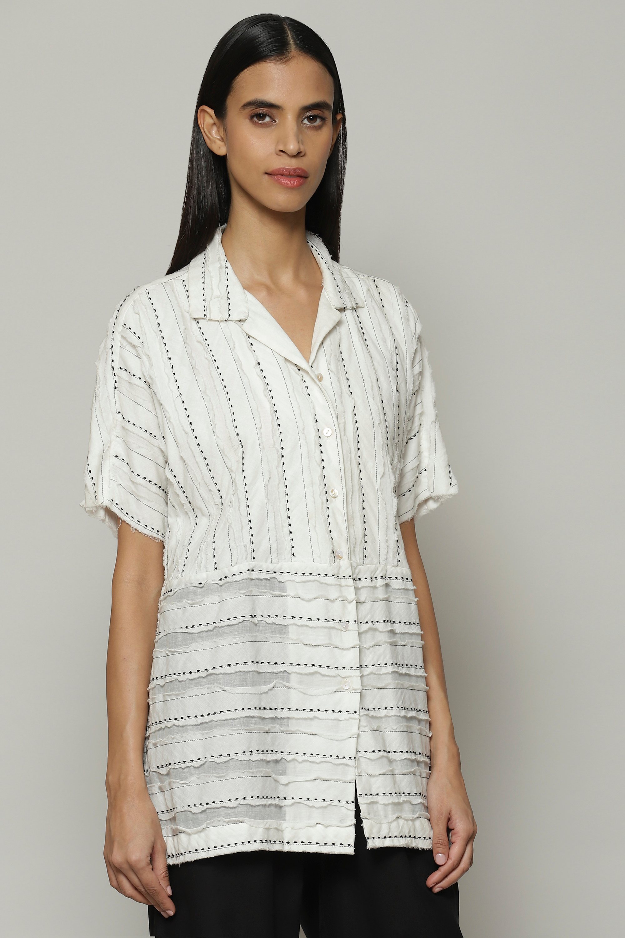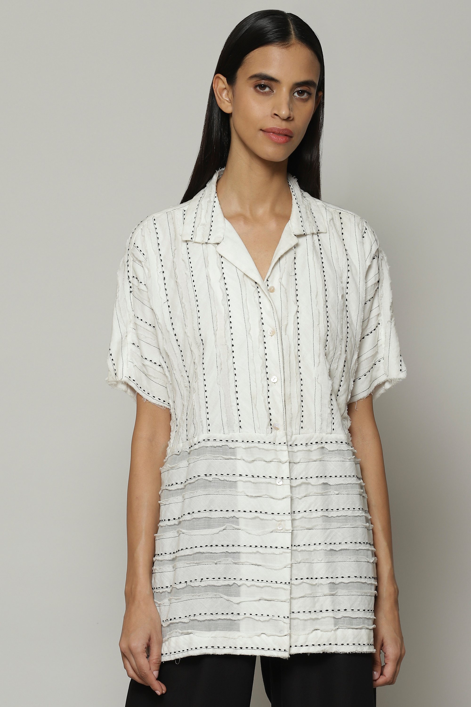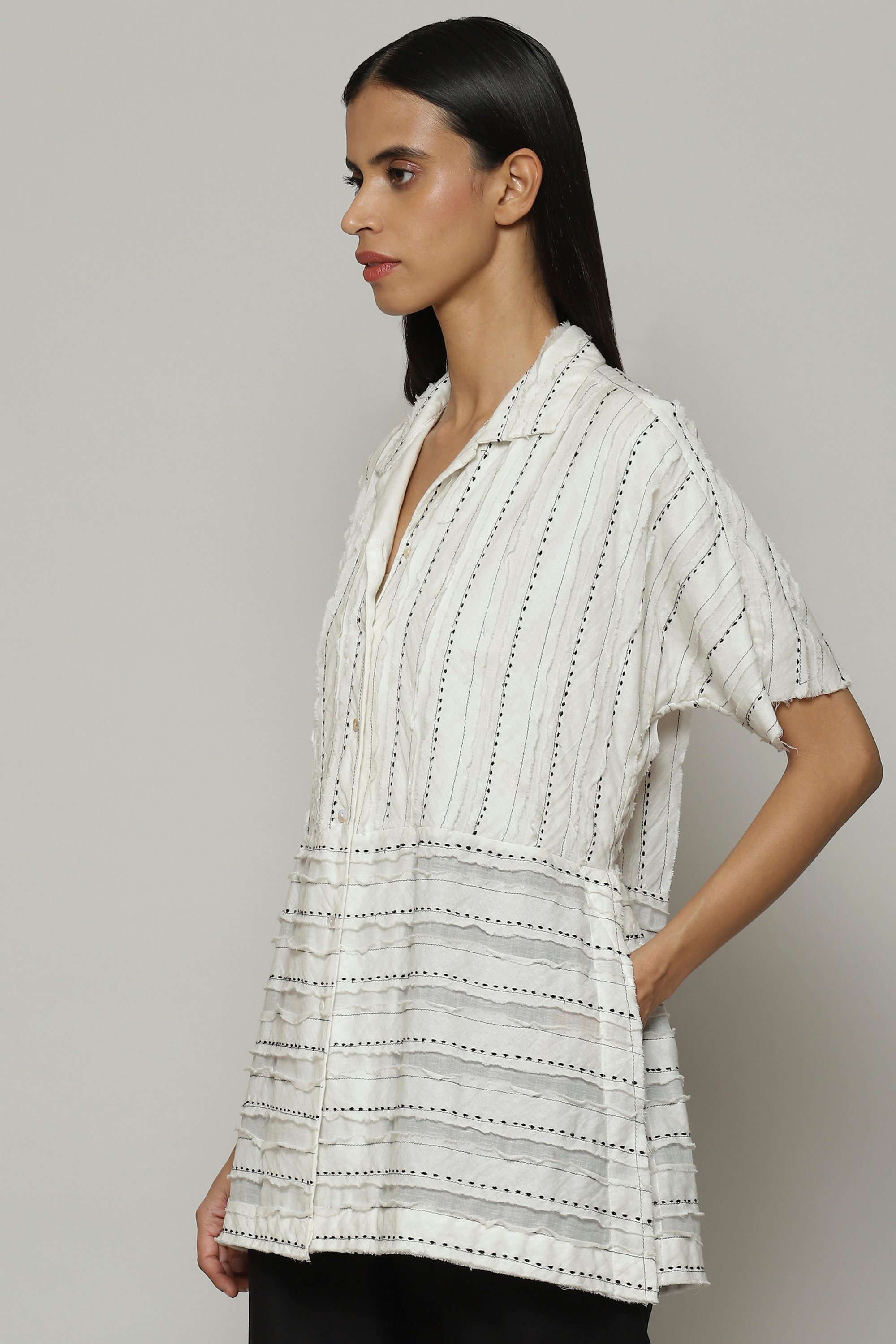 Dots of silk march along in linear patterns on this ivory top. Cotton voile appliques on the base fabric have been cut into strips after embroidery, resulting in a top that is girl-next-door with a twist. Perfect for dinner and a movie.