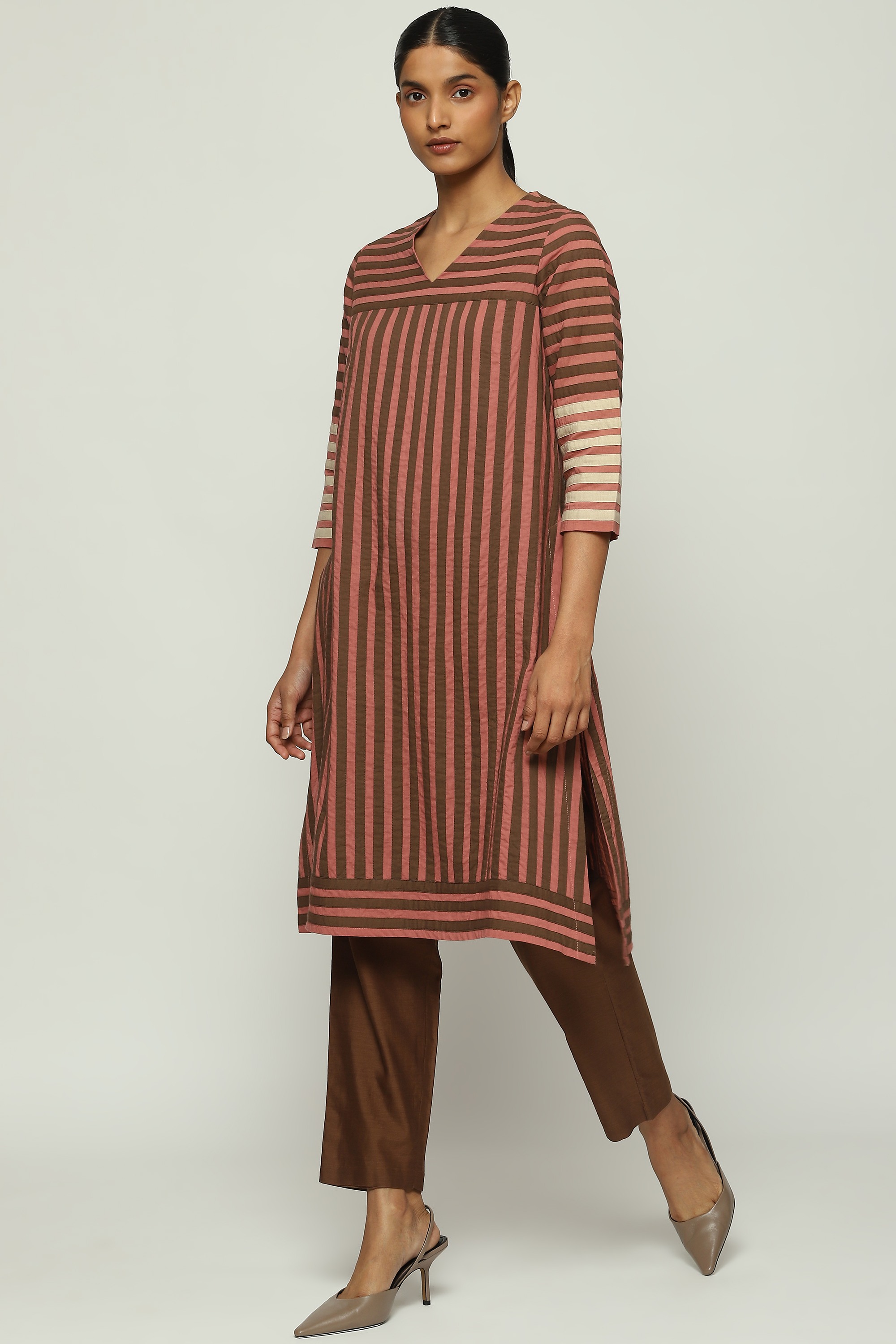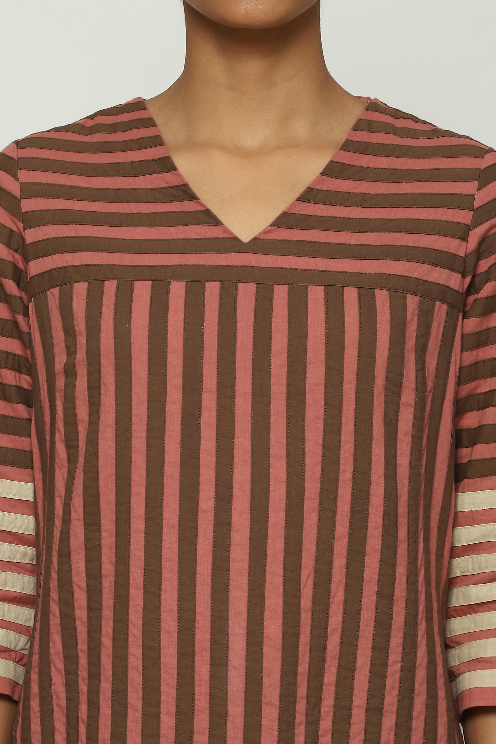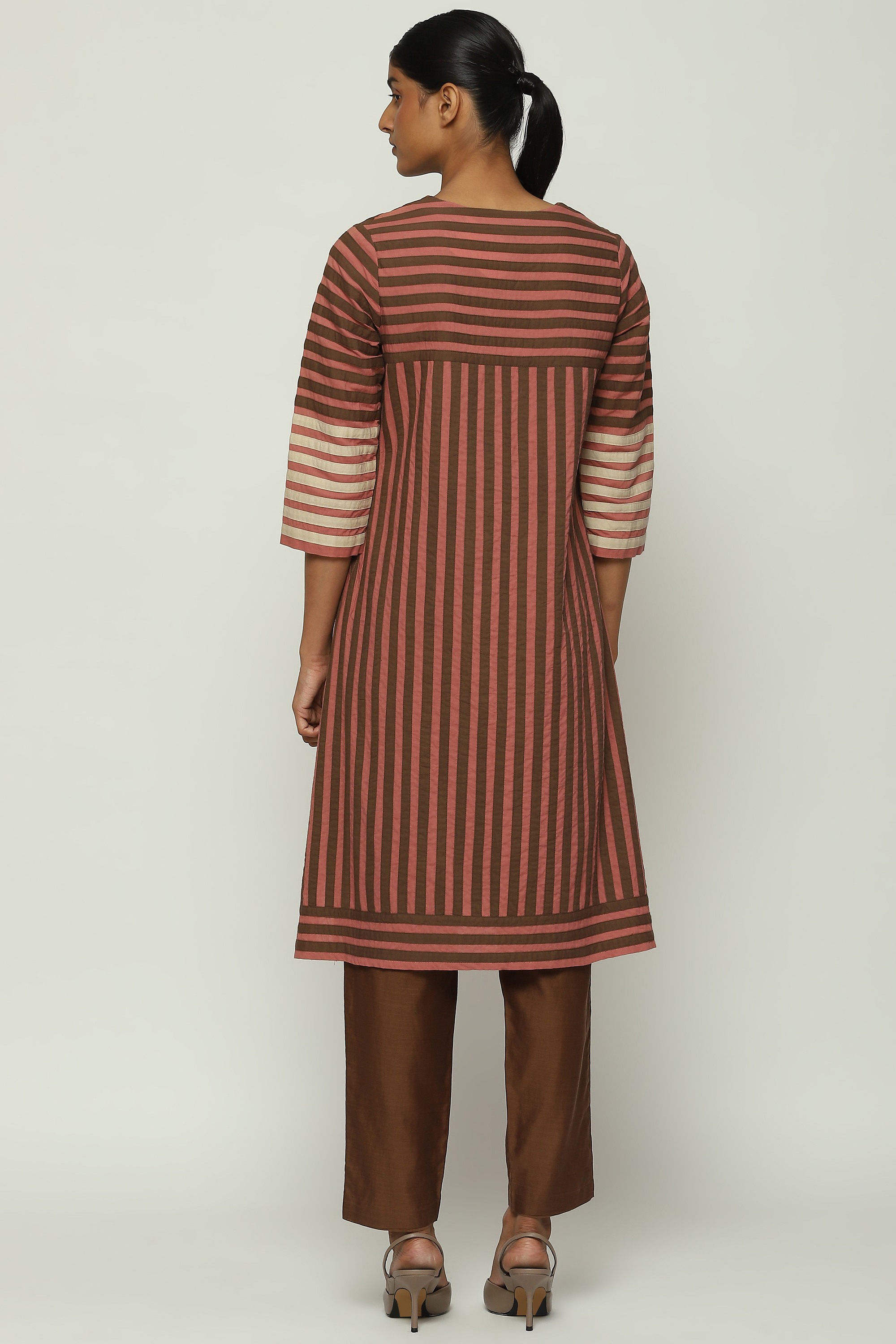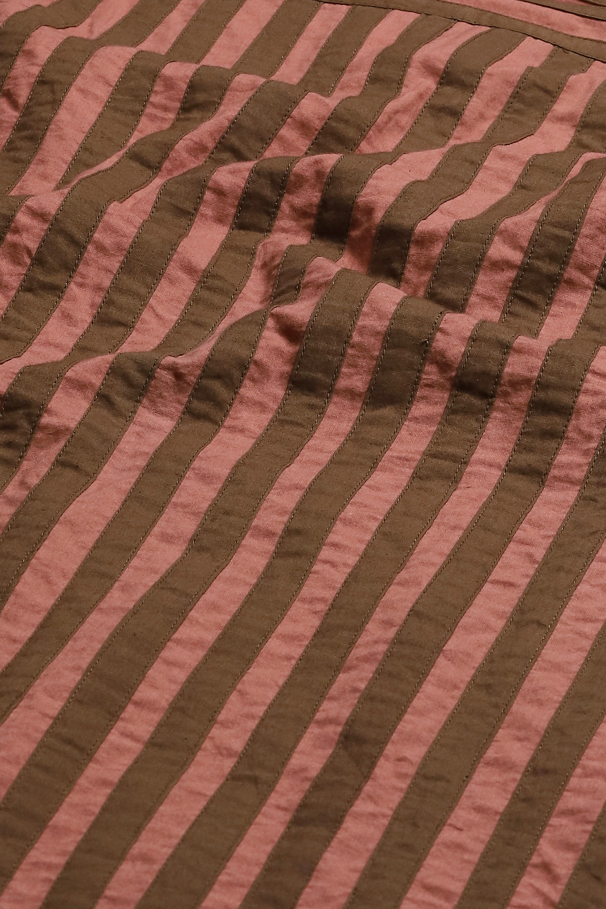 A structured conversation, appliqued with strips of cotton voile on a redwood kurta.