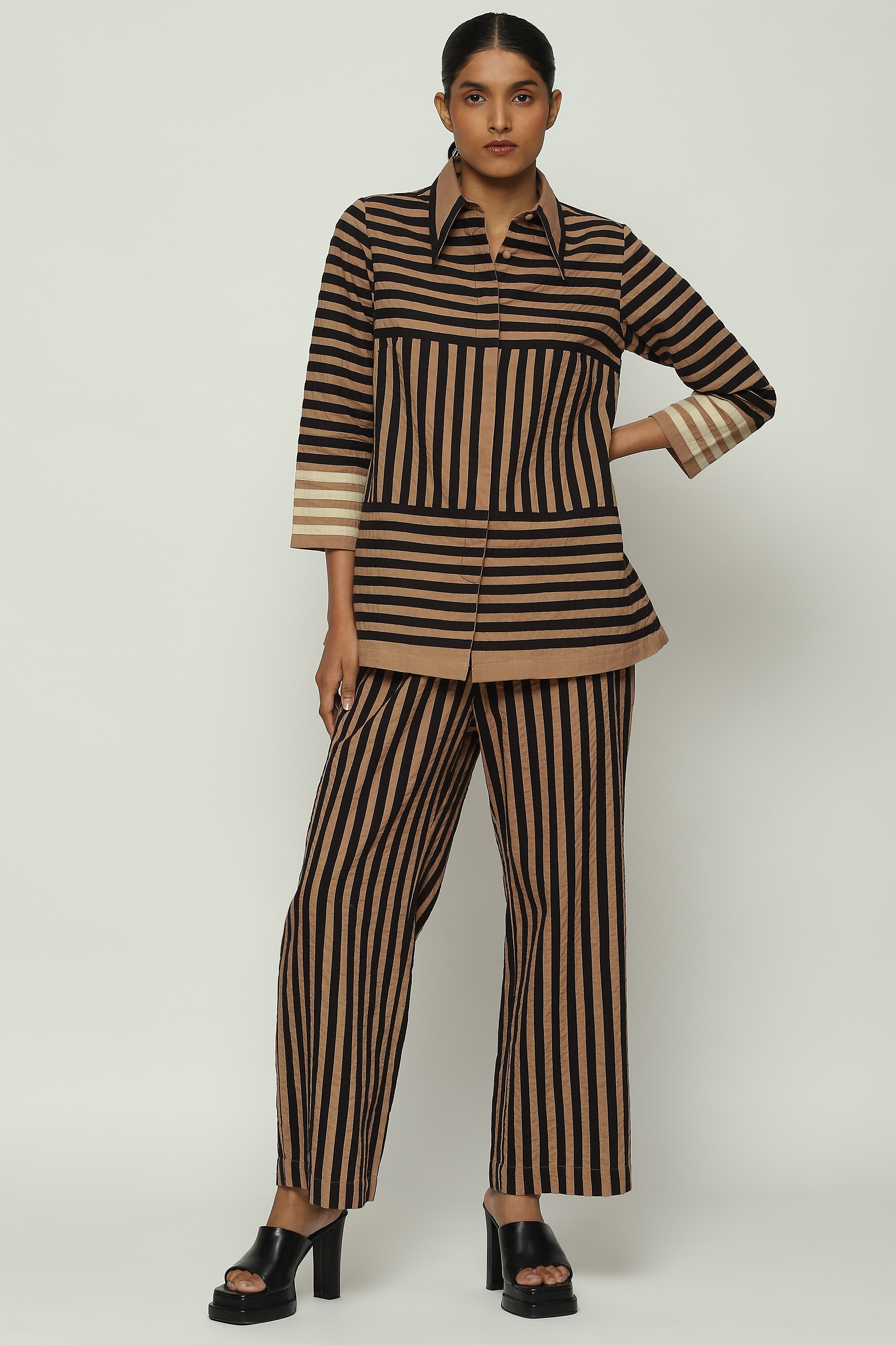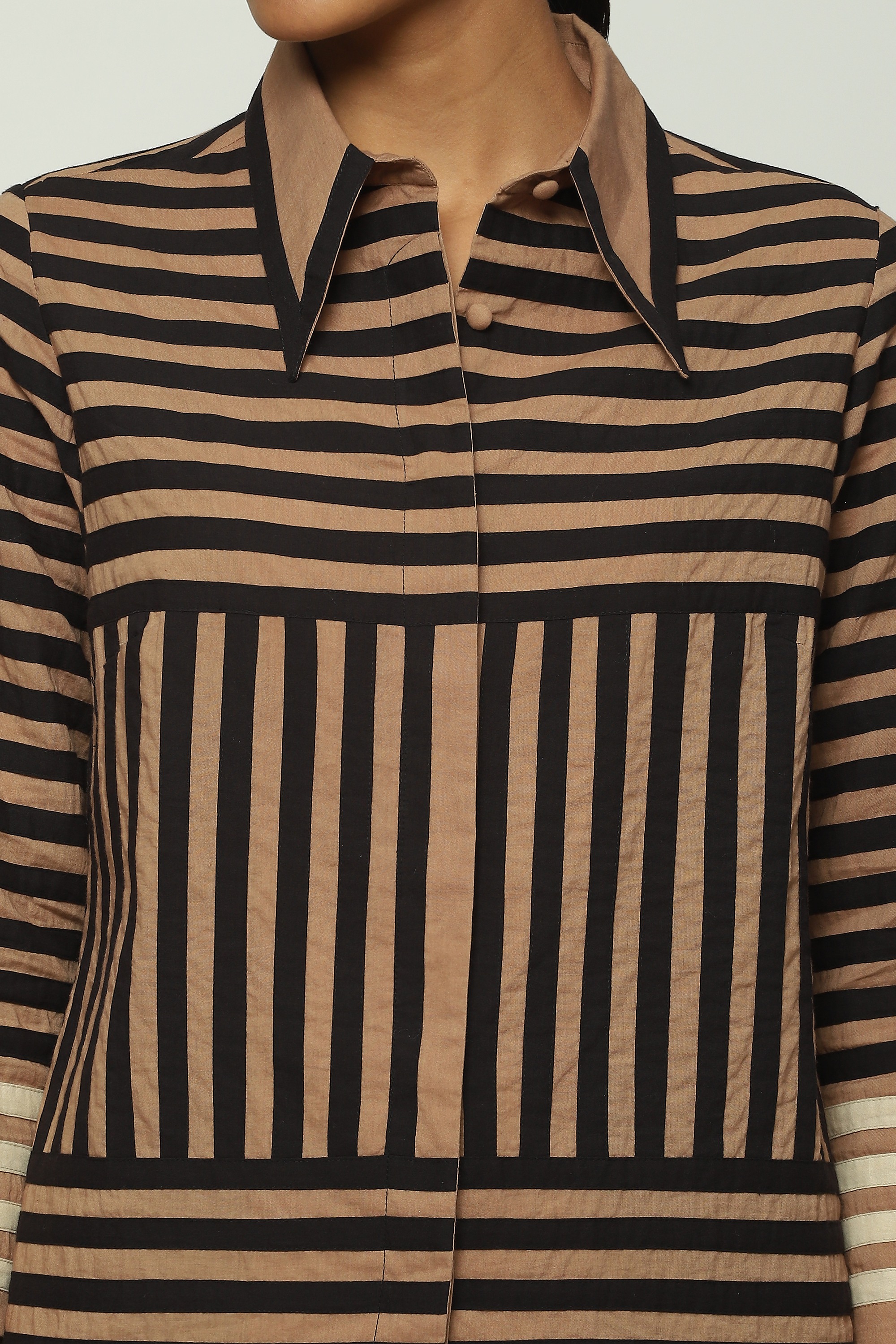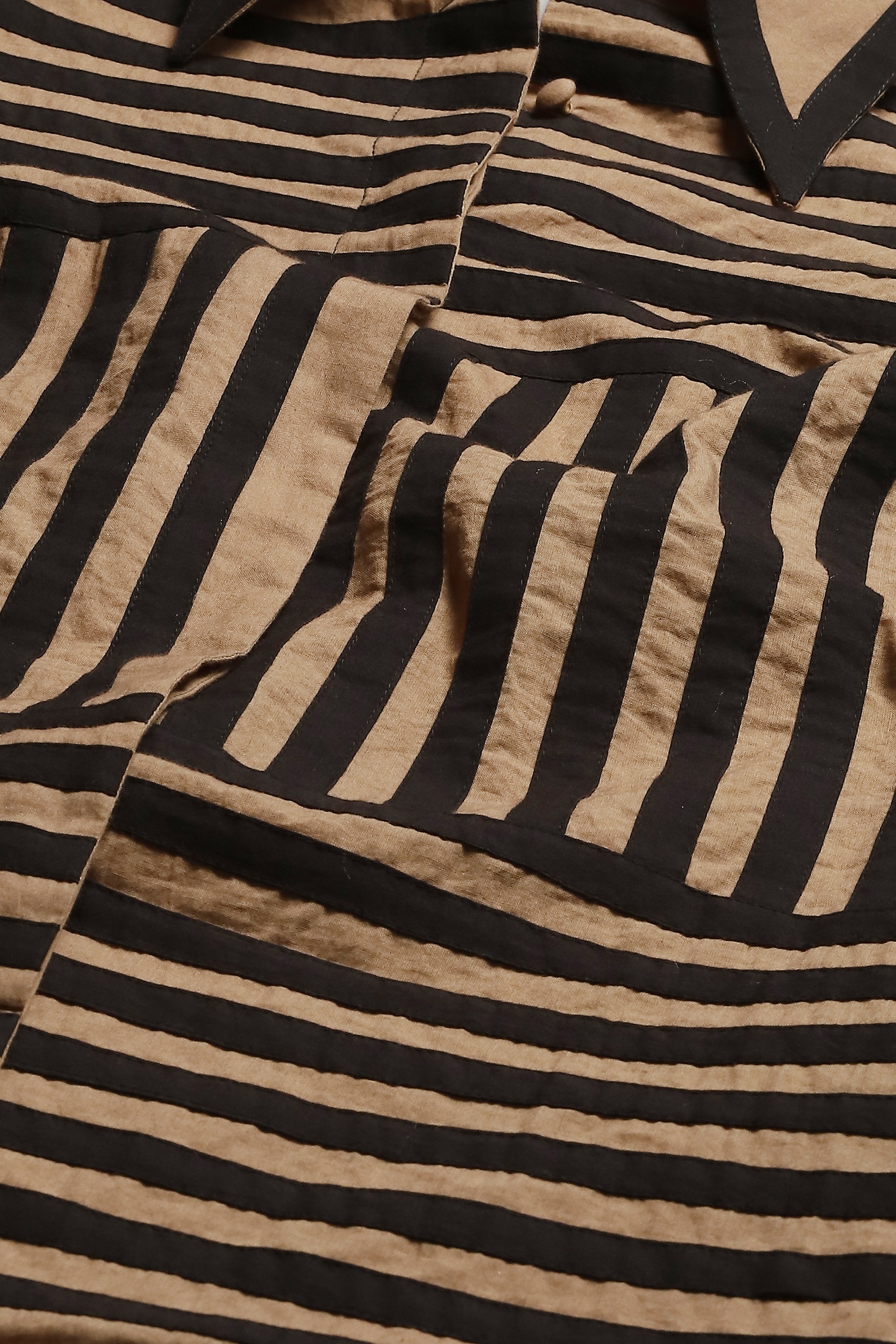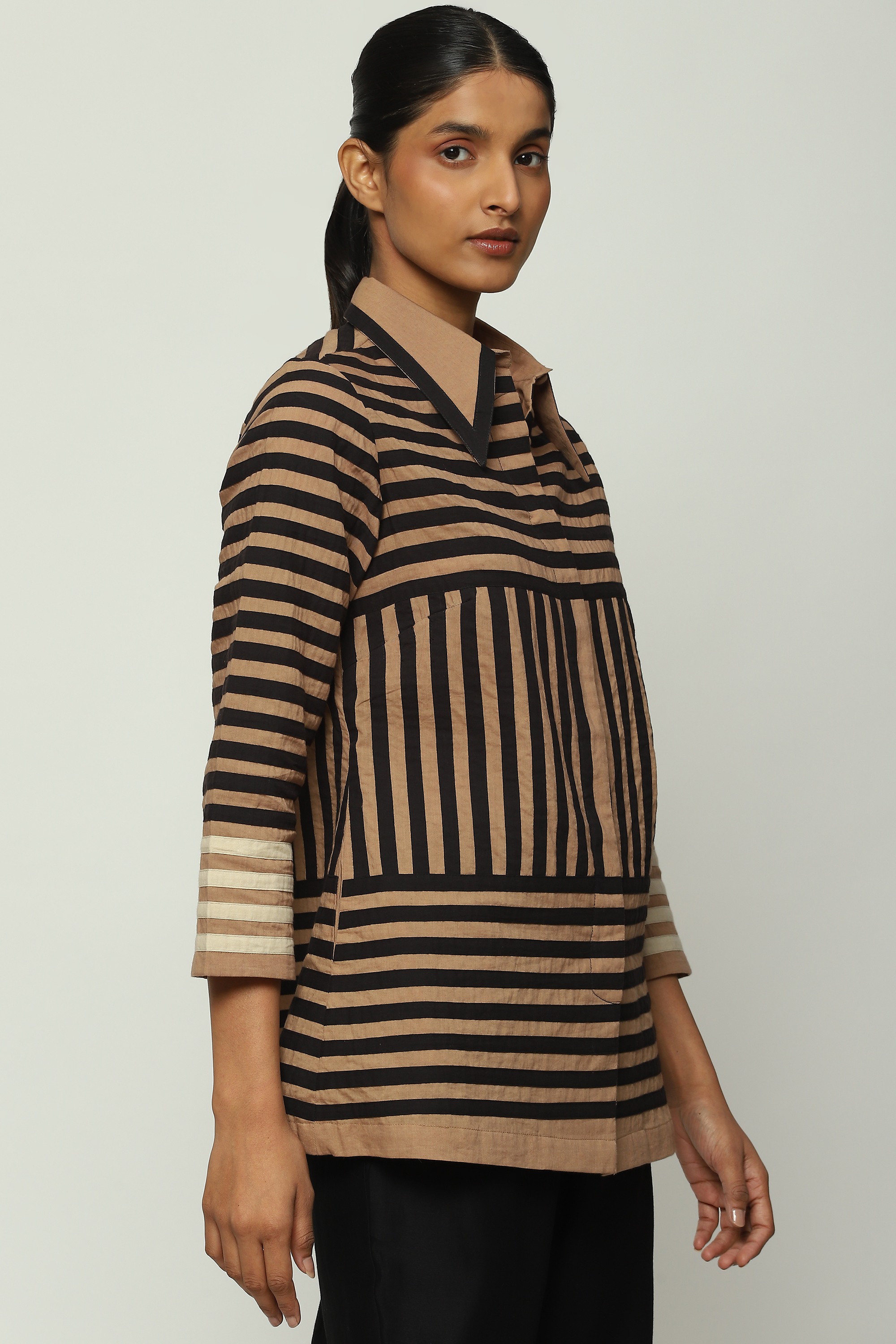A structured conversation, appliqued with strips of cotton voile on a peanut-colored shirt.