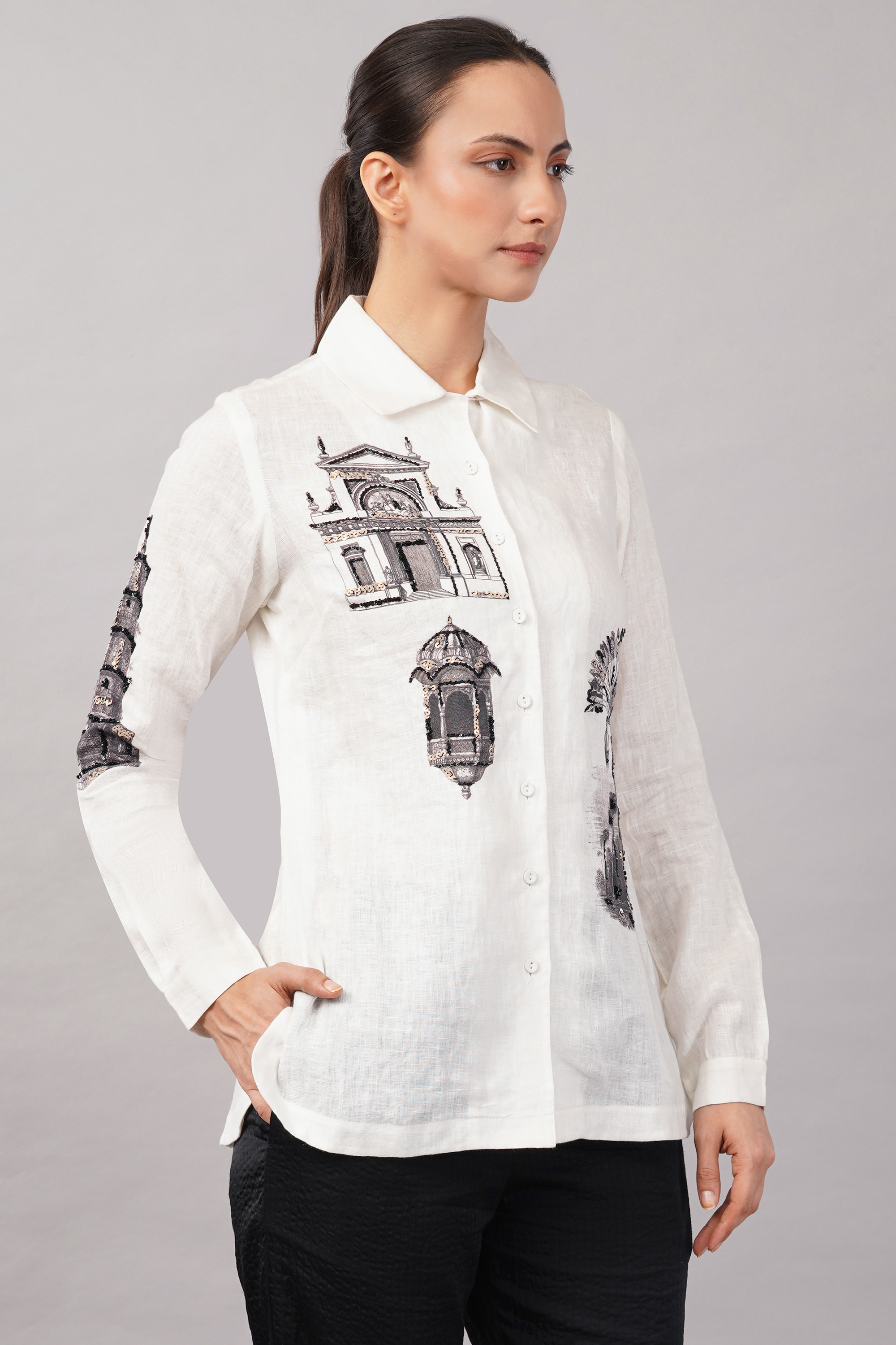 This limited edition piece has been made using a quirky placement print of monuments and miniature drawings and highlighting it with sequins.