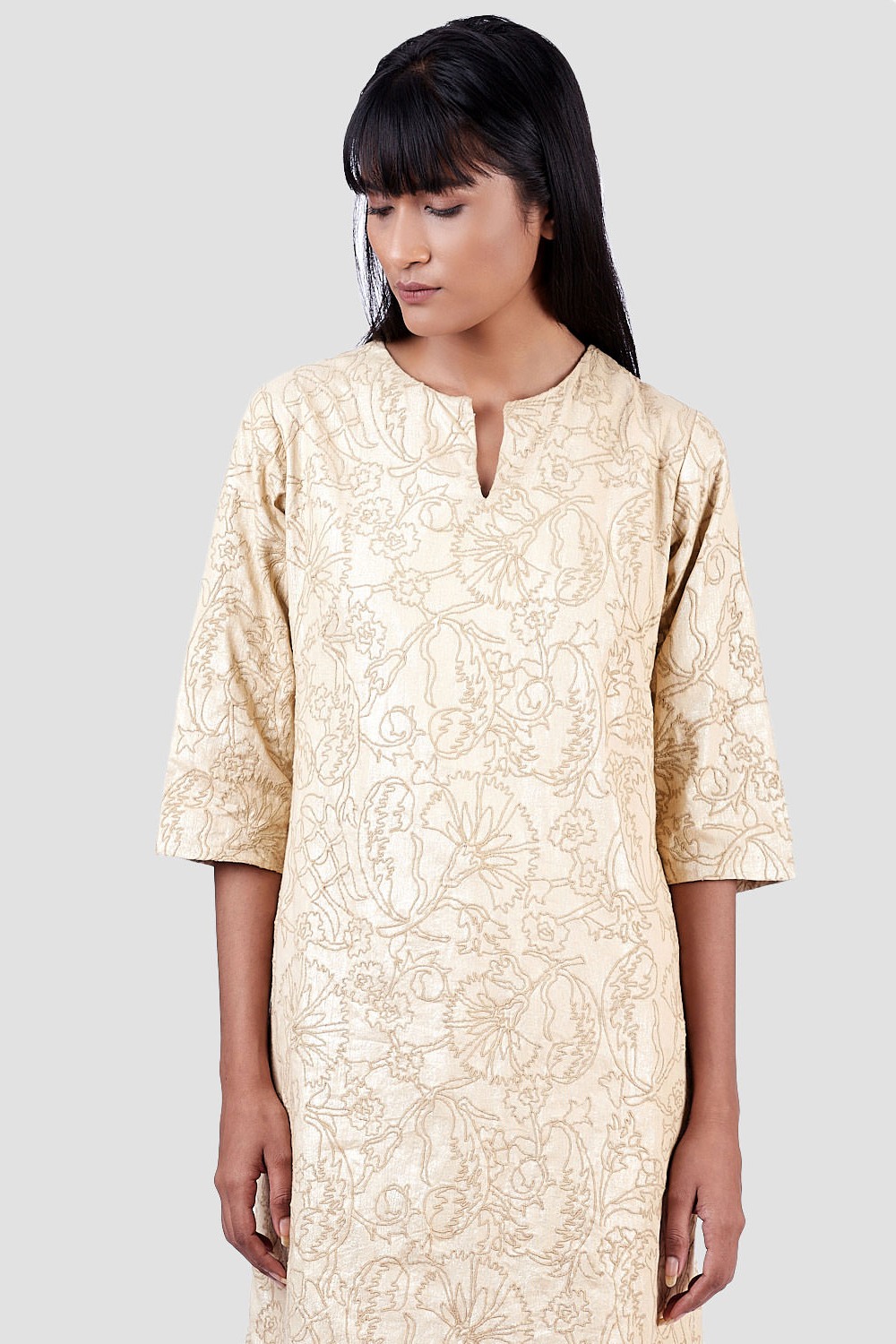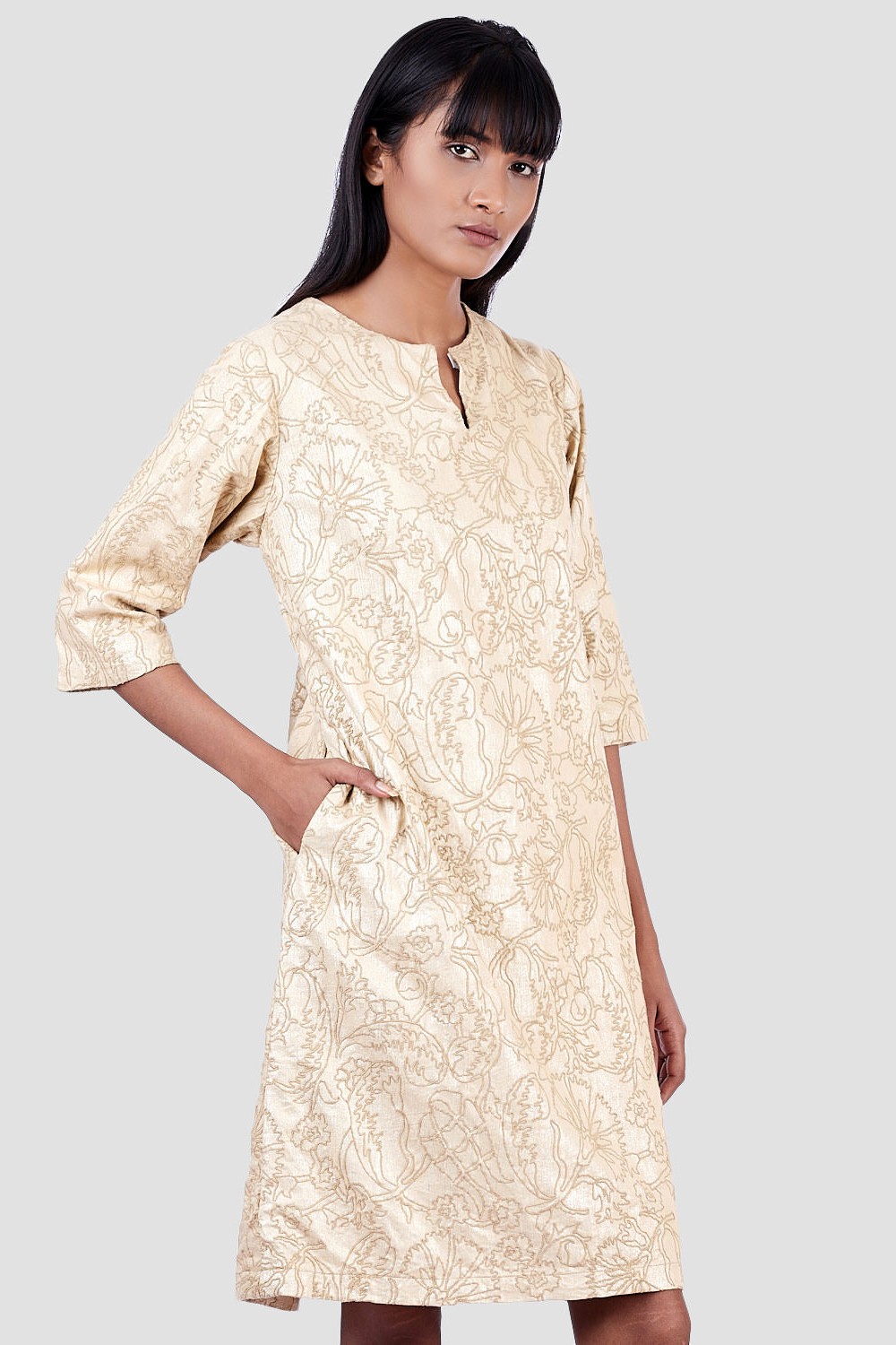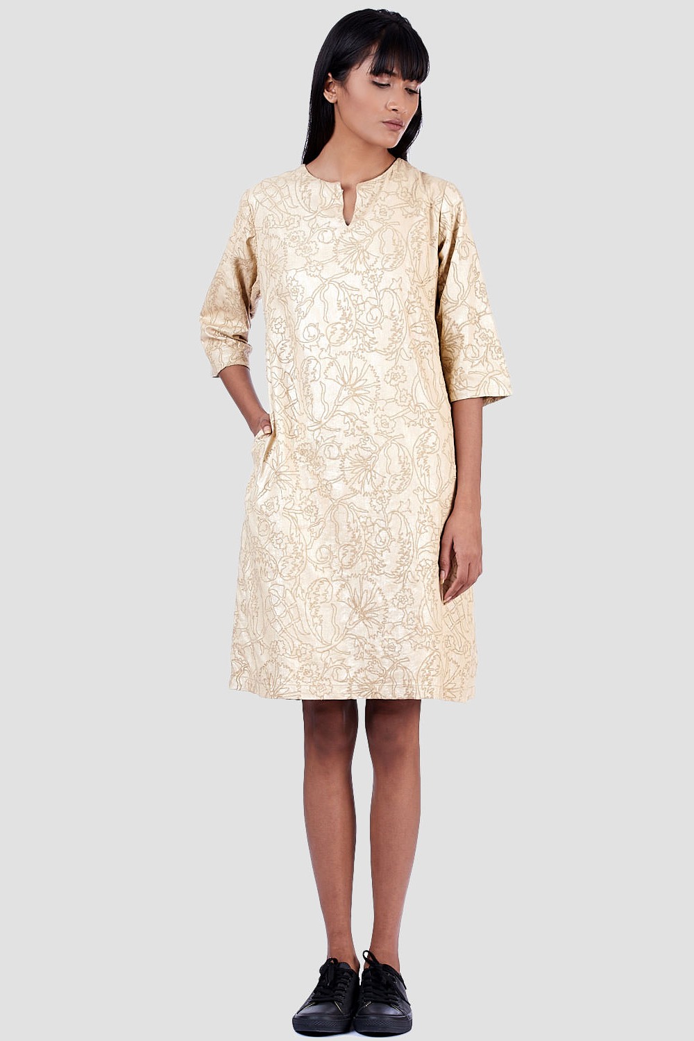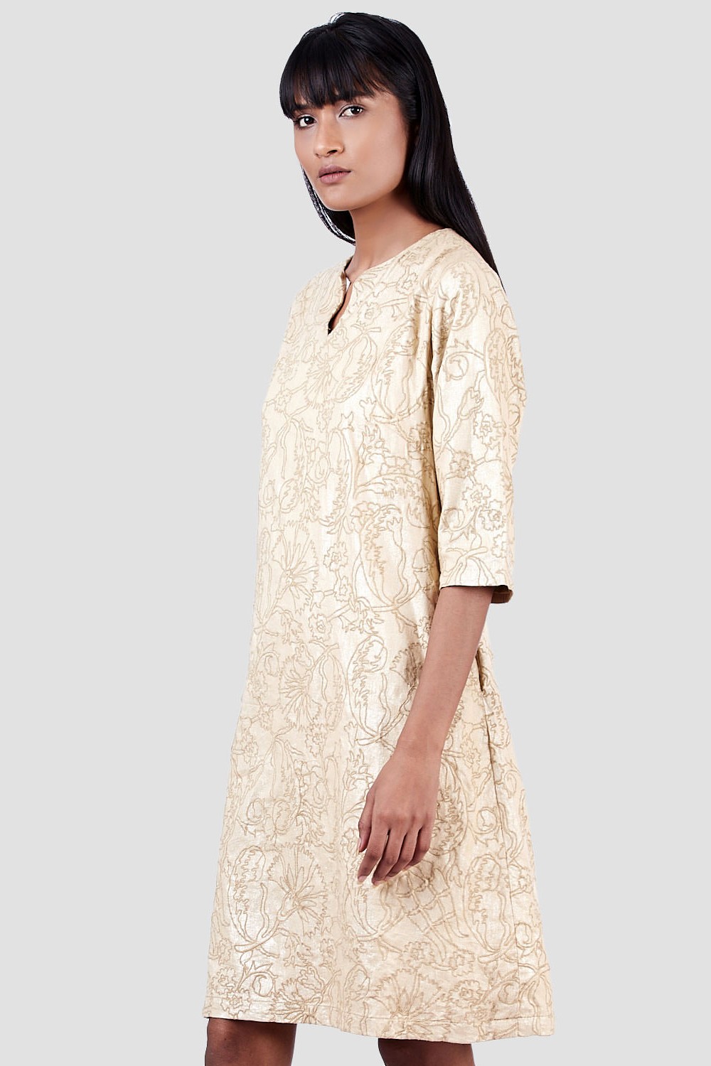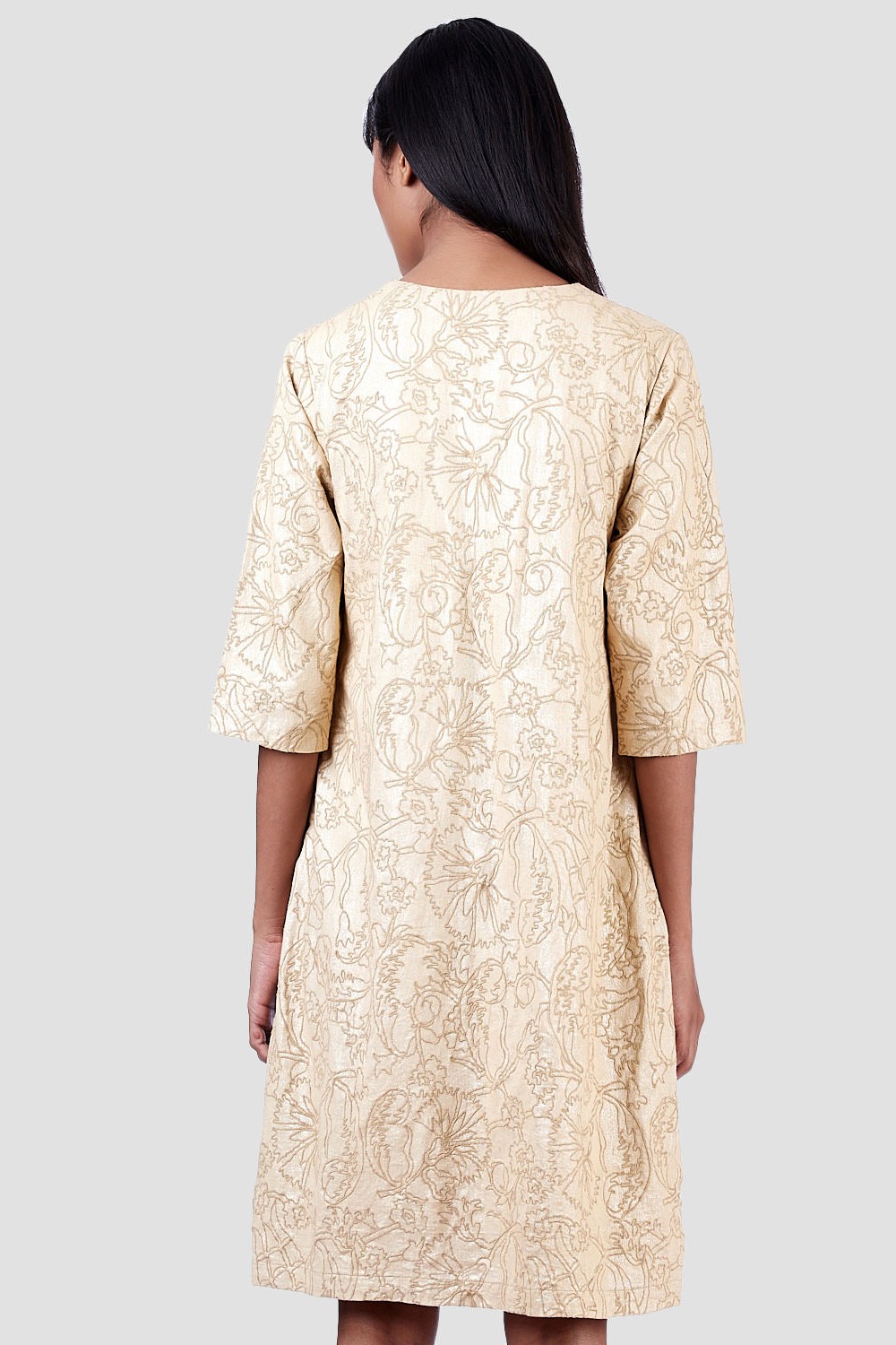 Regular Fit Short Dress. Features Allover Metallic Print With Floral Embroidery. Garments Are Made From Fabric That Is Washed And Pre-Shrunk To Give A Superior Hand.