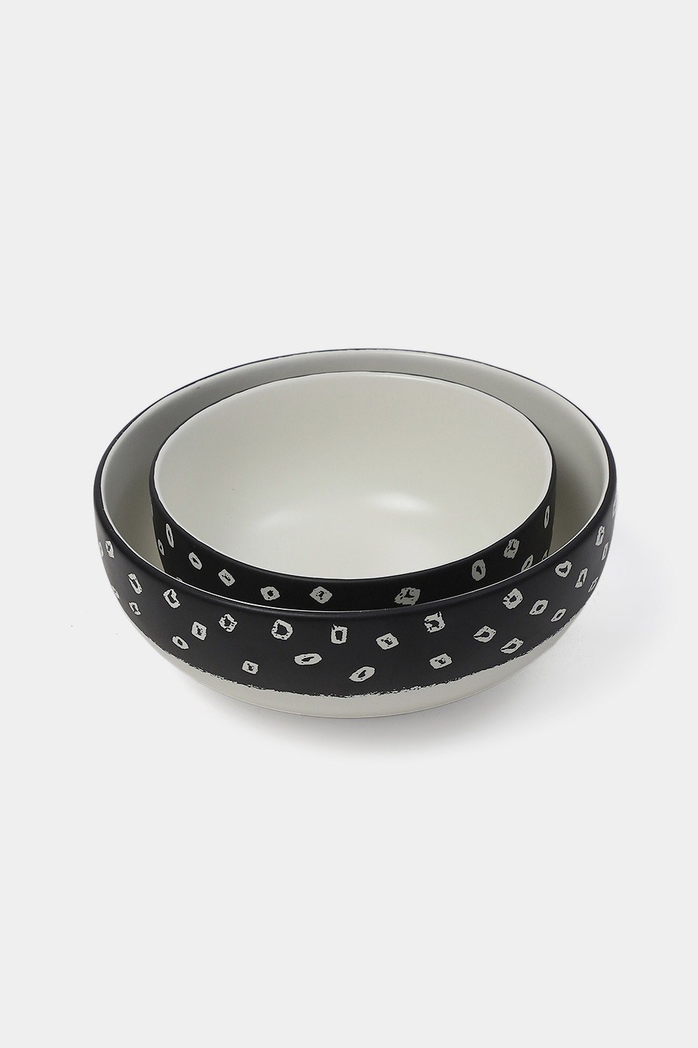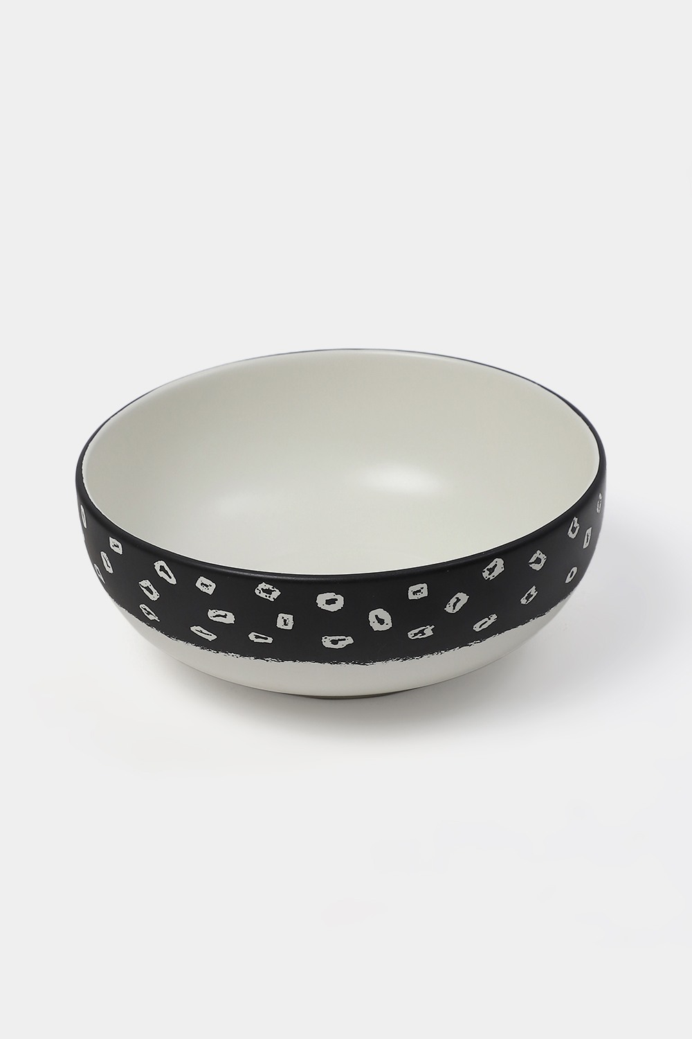 A porcelain bowl marked with circular patterns in ivory on black.