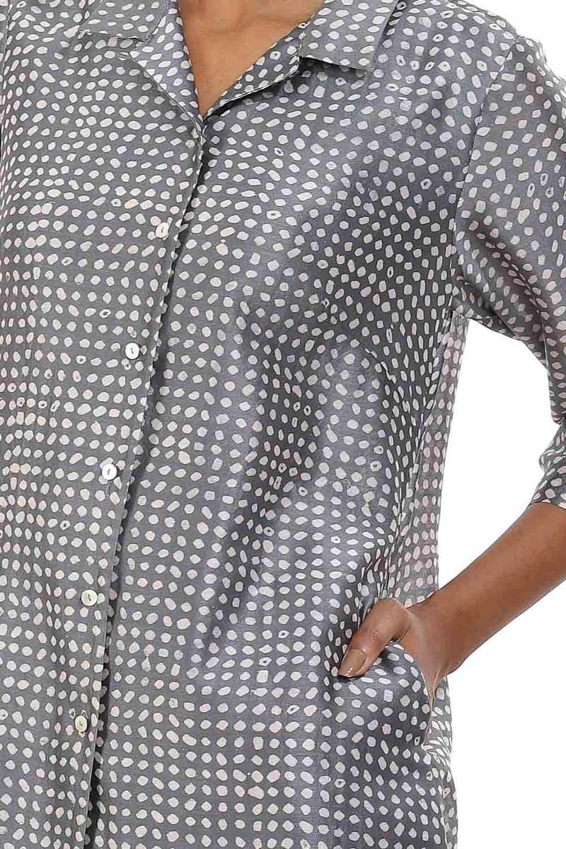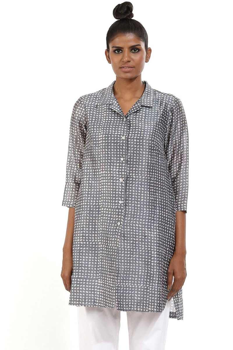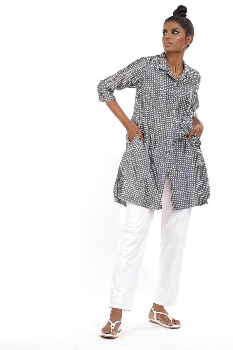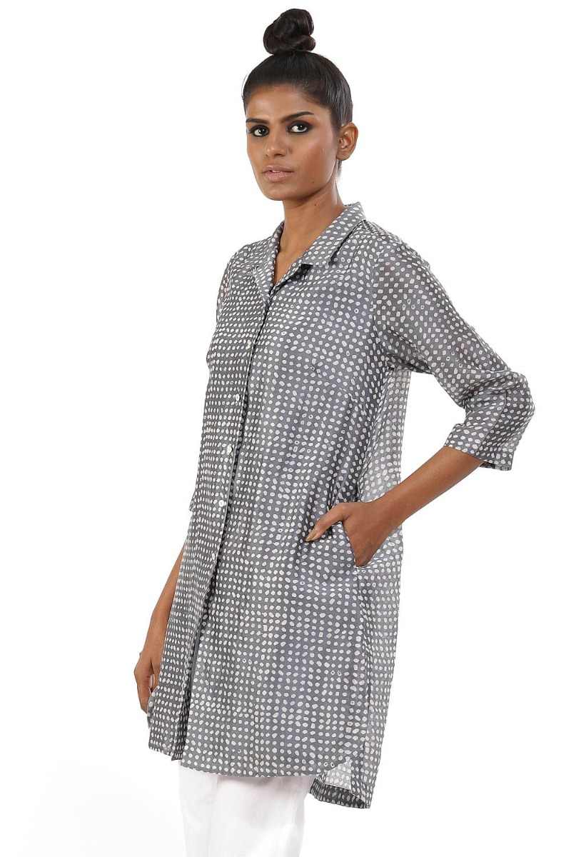 Bandhani Dot Print Shirt Jacket.We Continue Our Exploration With Traditional Indian Embroidery, Applique And Beading, Re-Imagining These Techniques With Our Signature Minimalist Design Sensibility To Create Textures That Celebrate Hand-Making Skills.