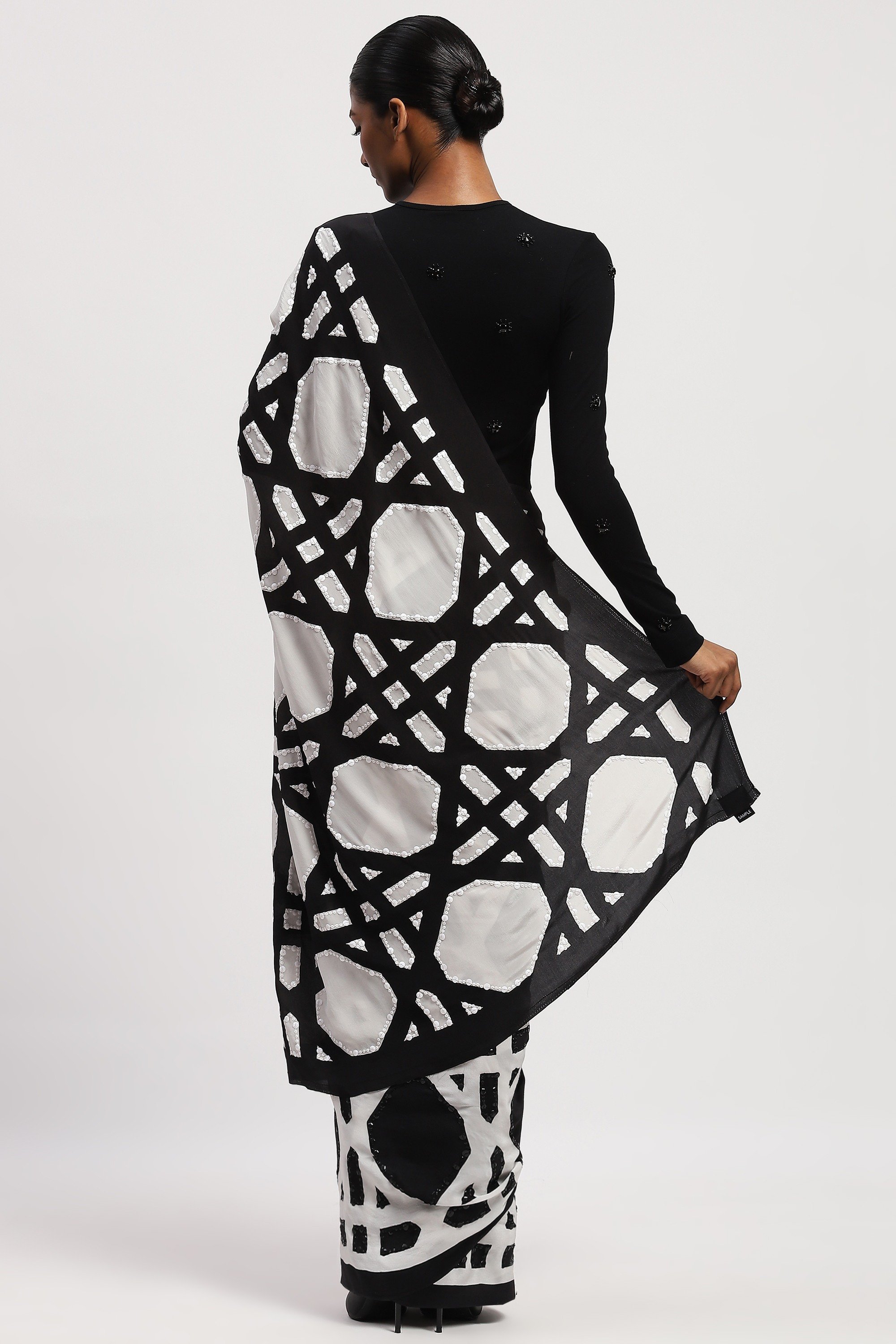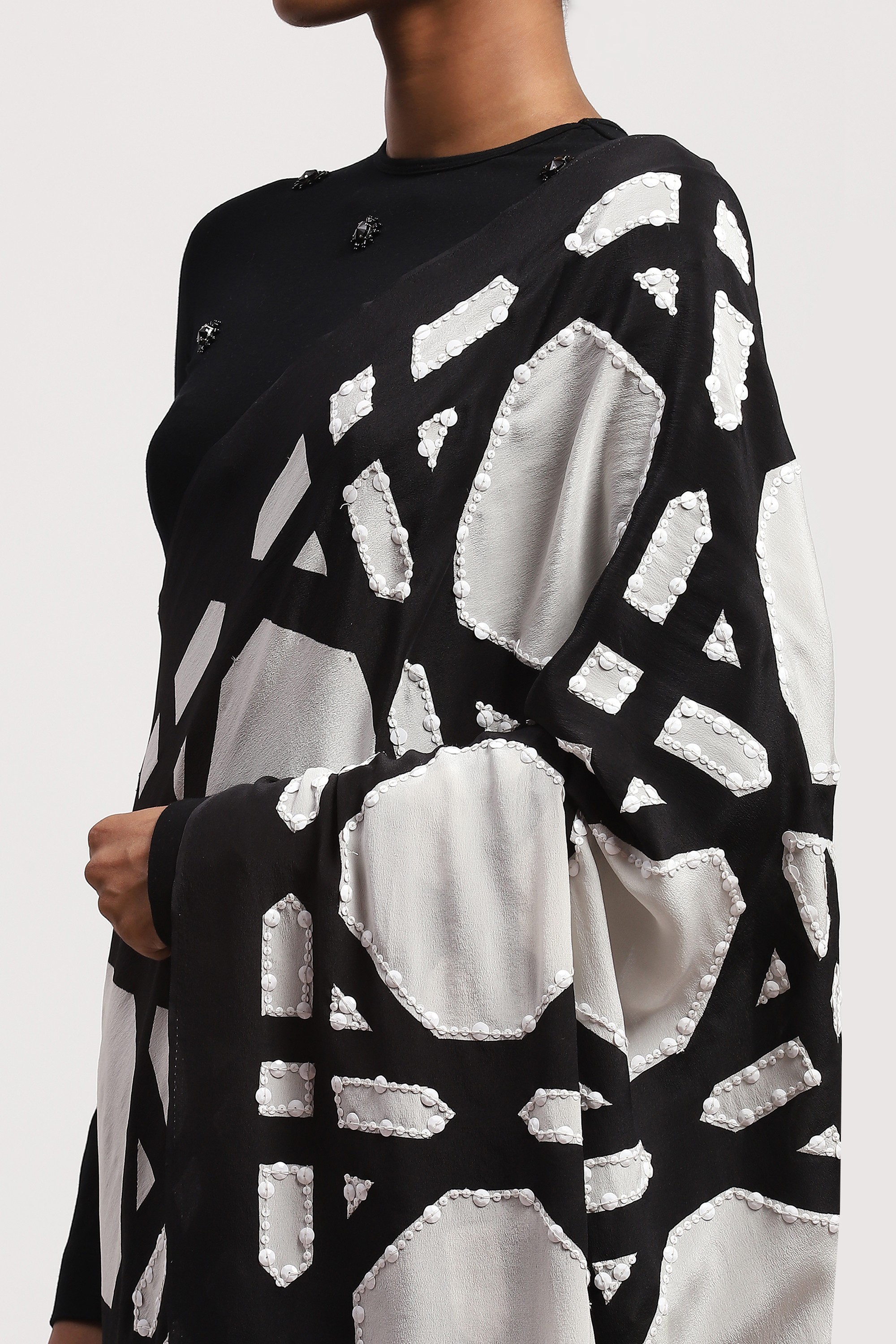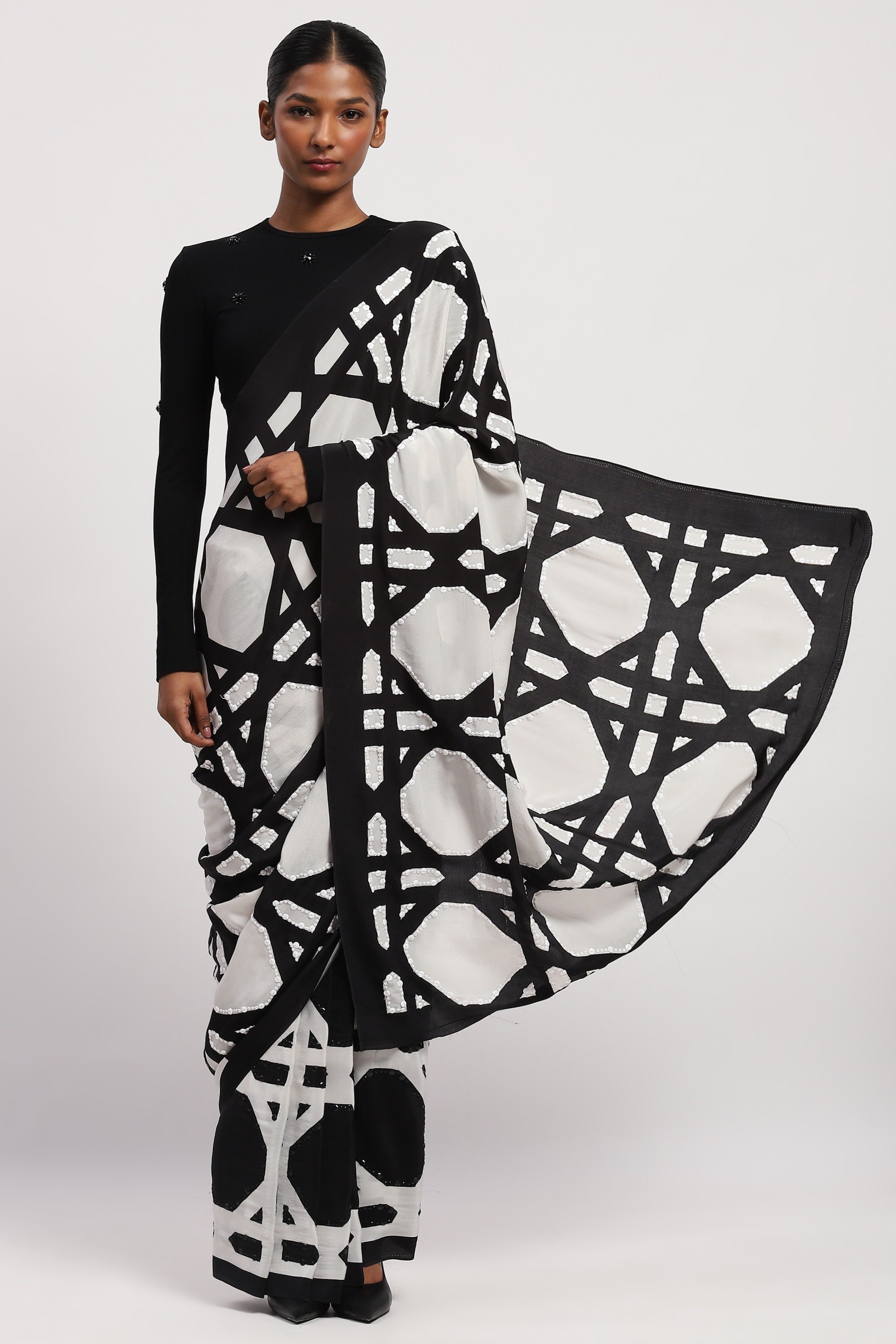 Best paired with the feeling of community, this black and white saree is crafted in viscose crepe. Its digitally printed illustrations draw inspiration from a basket's weave.