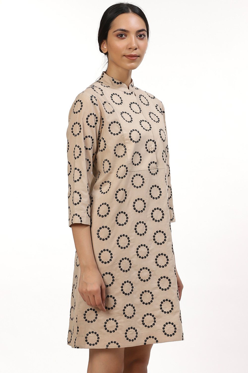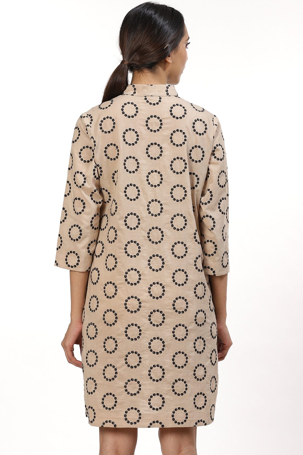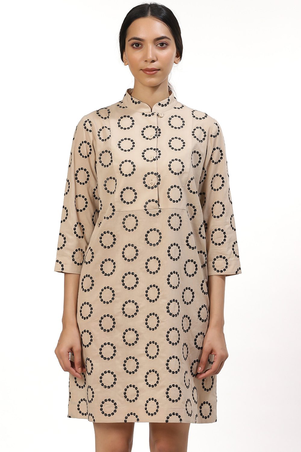 This season's must have bib front dress, crafted from cotton cambric, rings in black on beige. Style your look with a pair of sneakers when out with friends for lunch and shopping.