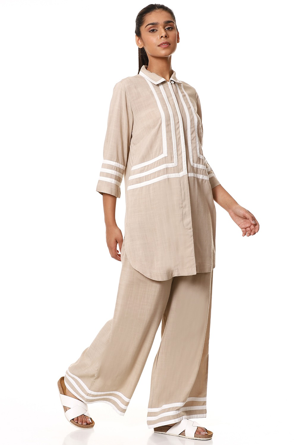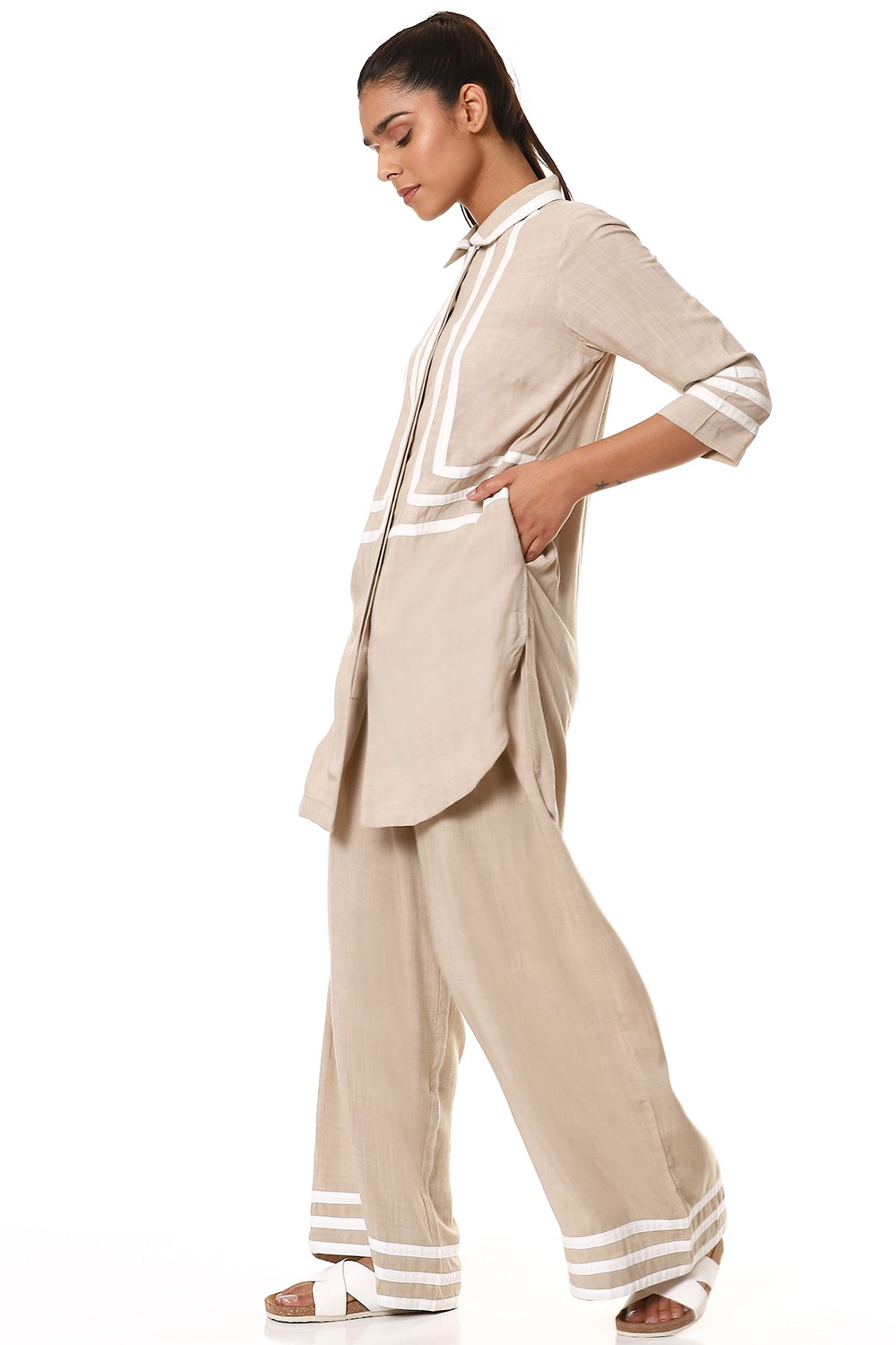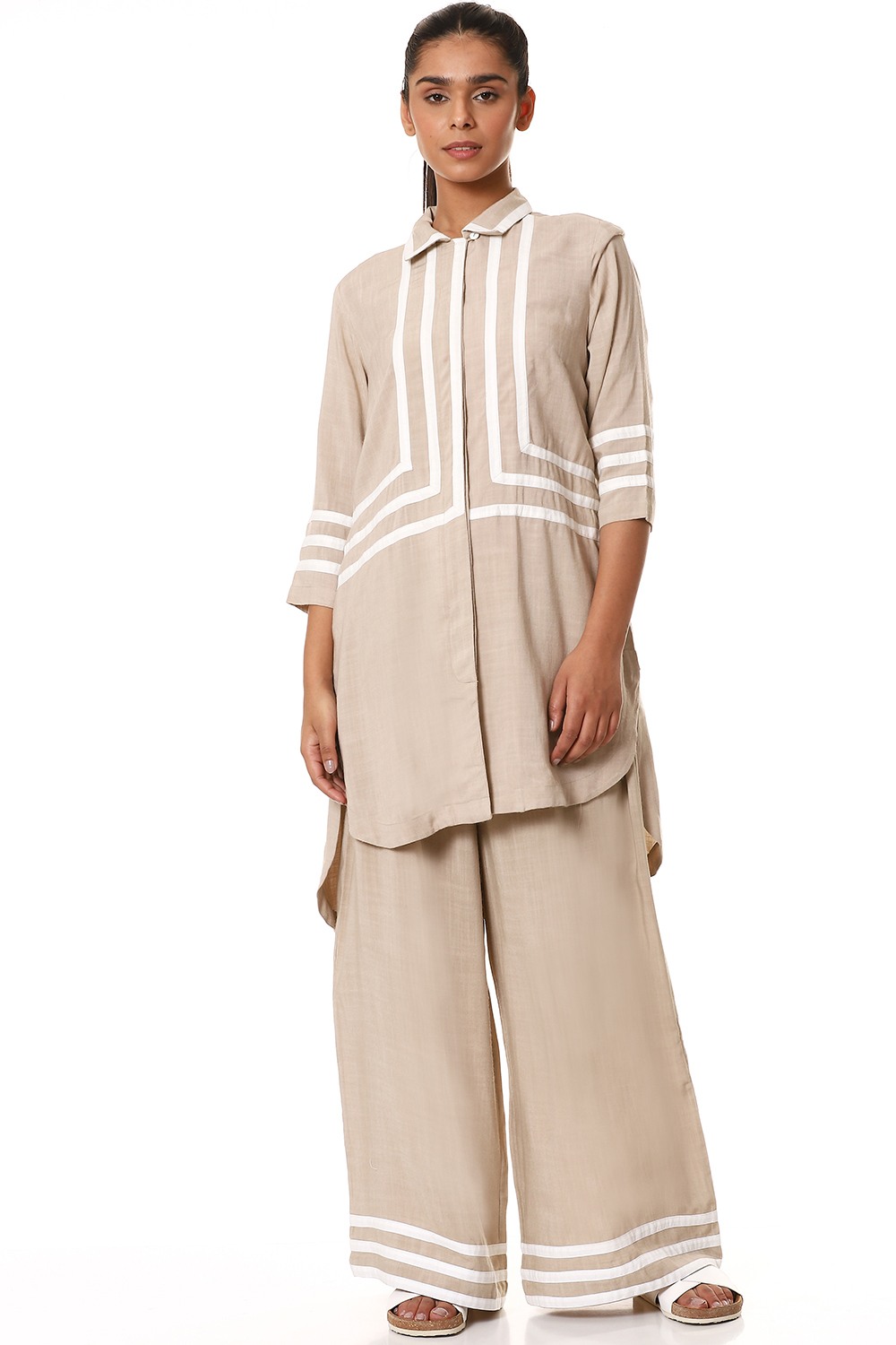 Look effortlessely elegant in the beige button front high low shirt, crafted from sustainable cellulose blend fabric, detailed with ivory tapes in the front and sleeves. Specially created for your every day clothing needs.