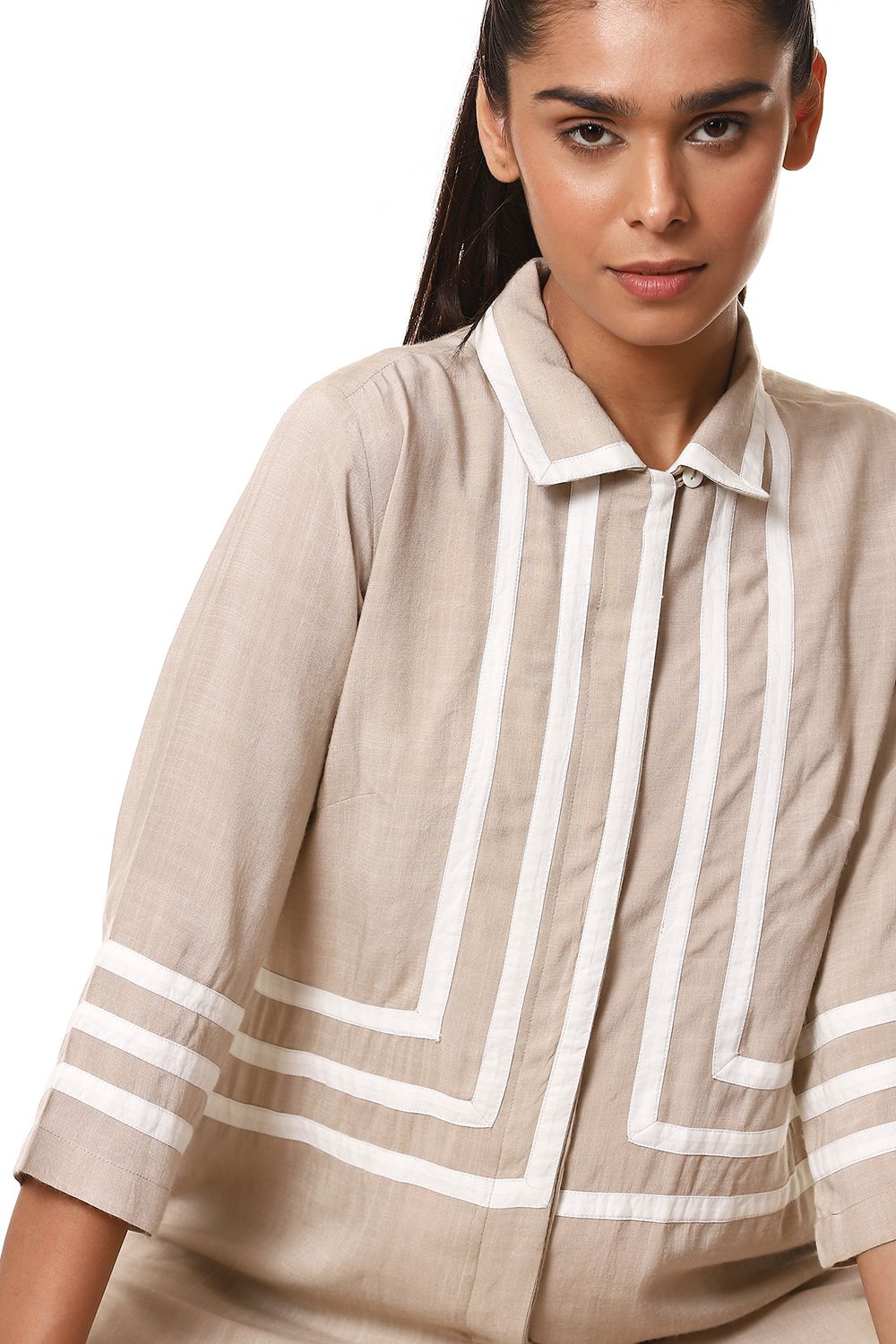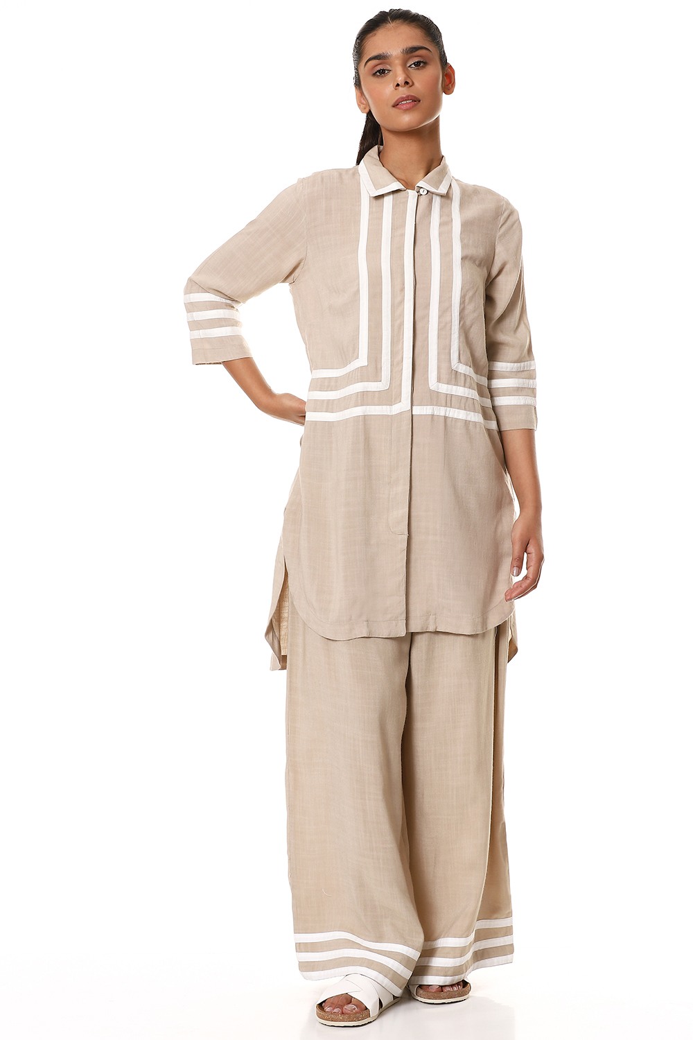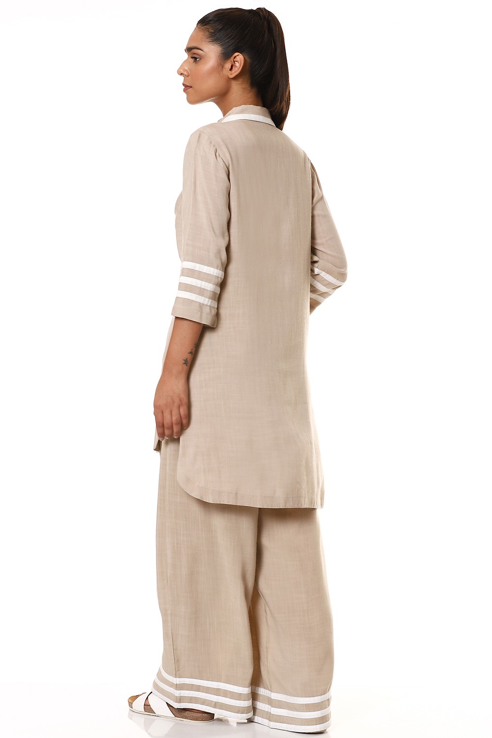 Look effortlessely elegant in the beige button front high low shirt, crafted from sustainable cellulose blend fabric, detailed with ivory tapes in the front and sleeves. Specially created for your every day clothing needs.