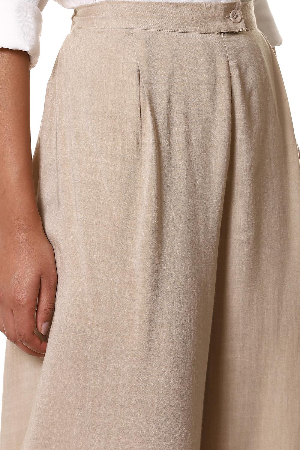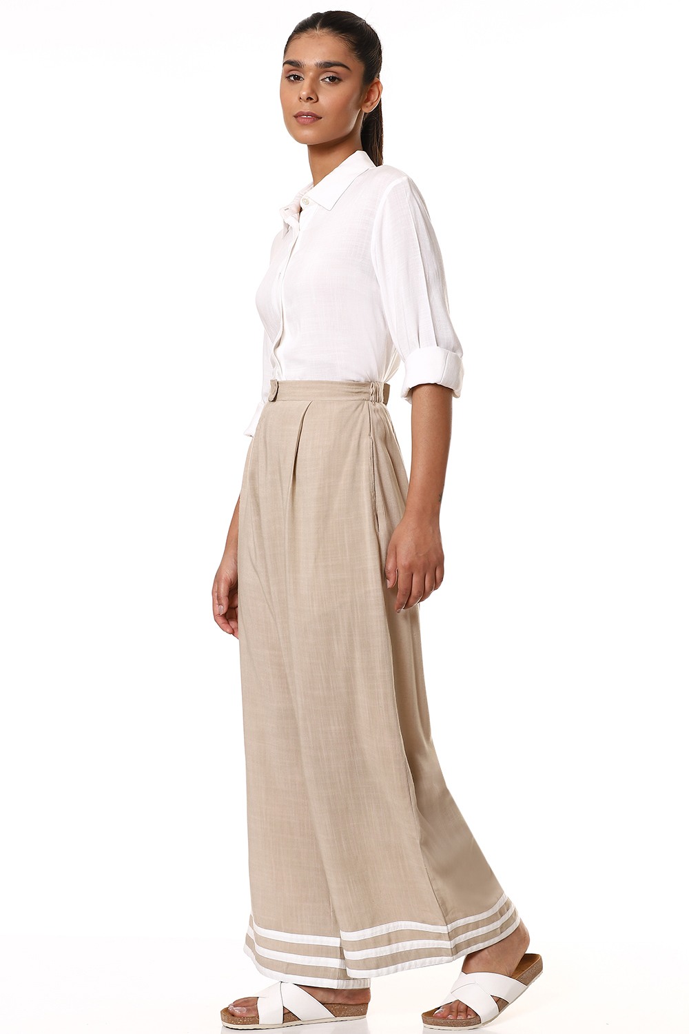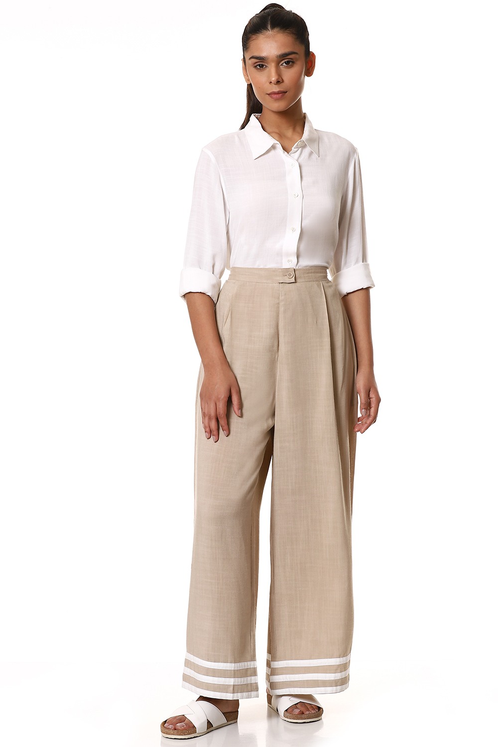 Comfortable, easy and elegant wide leg beige pleated pants, crafted from sustainable ecovero fabric. Detailed with ivory patchwork tapes on the hem. Added soft elastic waistband for a relaxed and comfortable fit which works great for all body types.Specially created for your everyday clothing needs.