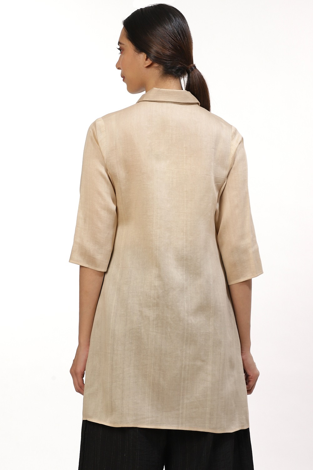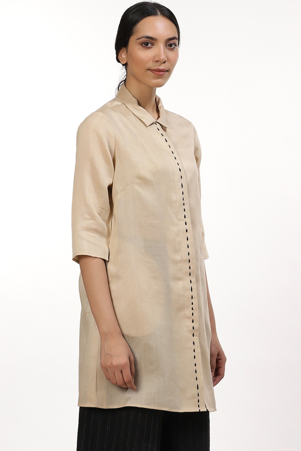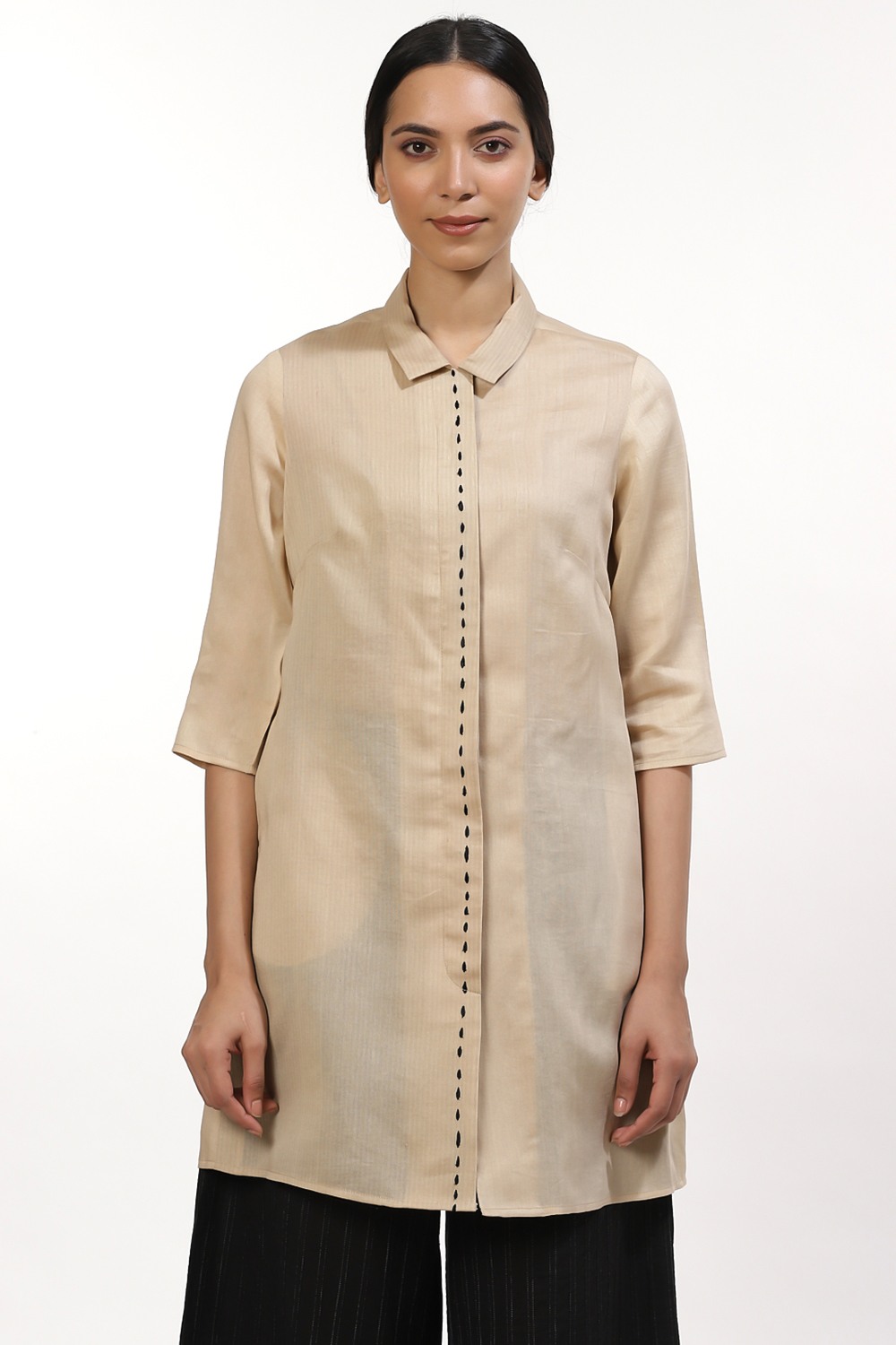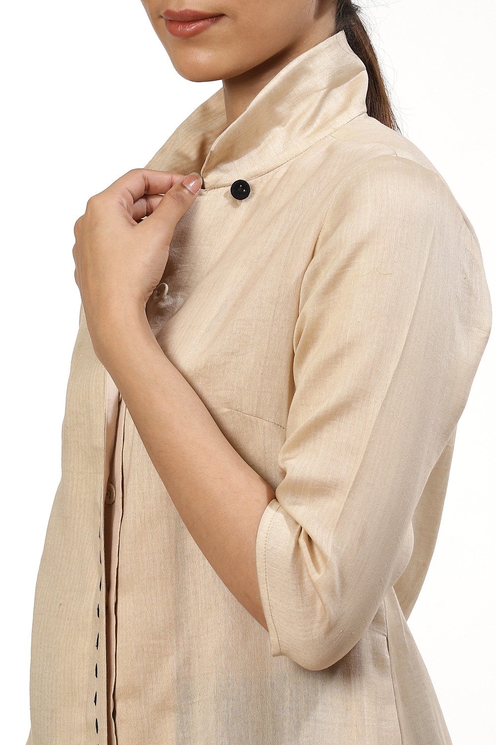 The decorative saddle stitch shirt, crafted in hand woven silk cotton fabric, in beige and ivory. A seasonless peice that can be styled to suit almost any occasion. Wear yours with wide legged pants and flat sandals to work or for a quite lunch with family.