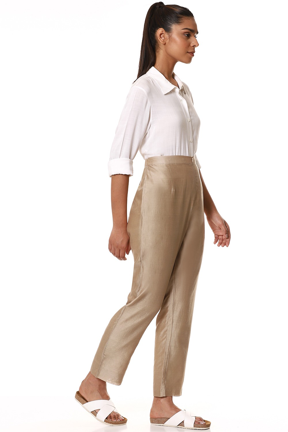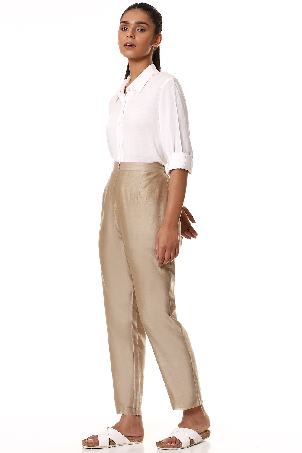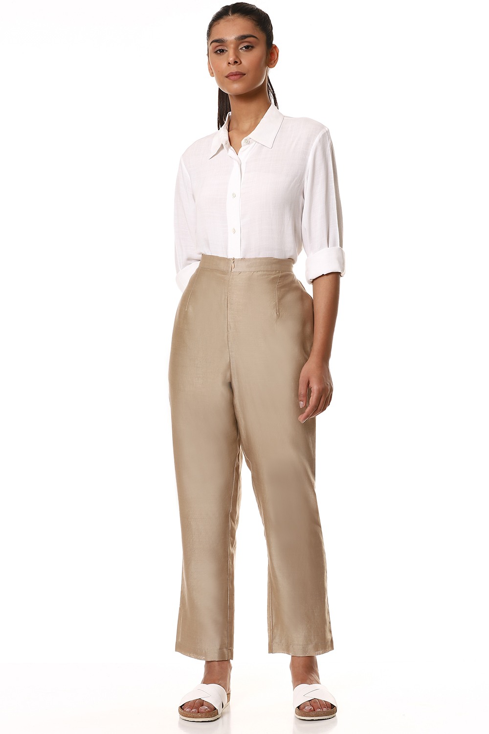 A pair of simple and elegant straight slightly cropped leg pants, cut from soft silk-cotton texture in beige with a lining in cotton voile, added soft elastic waistband for an easy and comfortable fit which works great for all body types. Specially created for your everyday clothing needs.