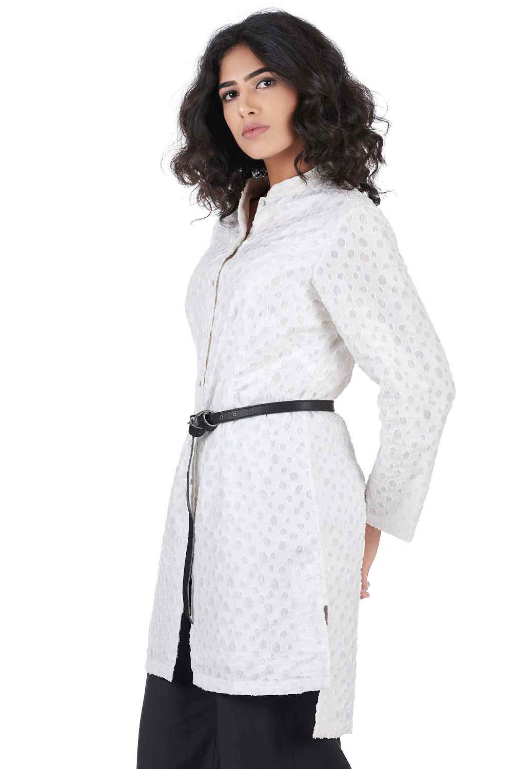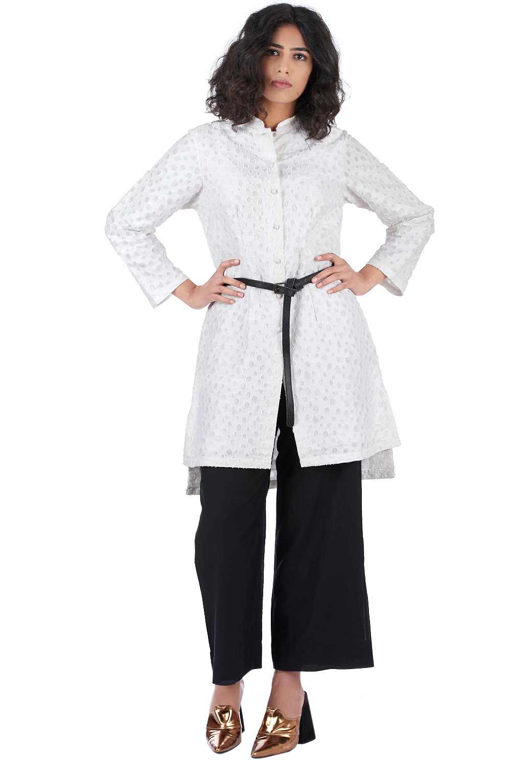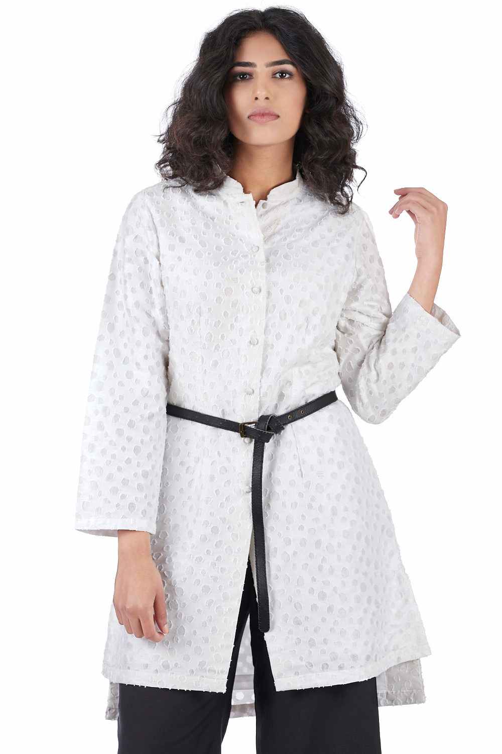 Regular-Fit Dip-Hem Button-Down Shirt. Features Allover Cutwork Dots. Specially Made Self-Cover Fabric Buttons. Wear It With Our Bengal Cotton Tulip Pants.