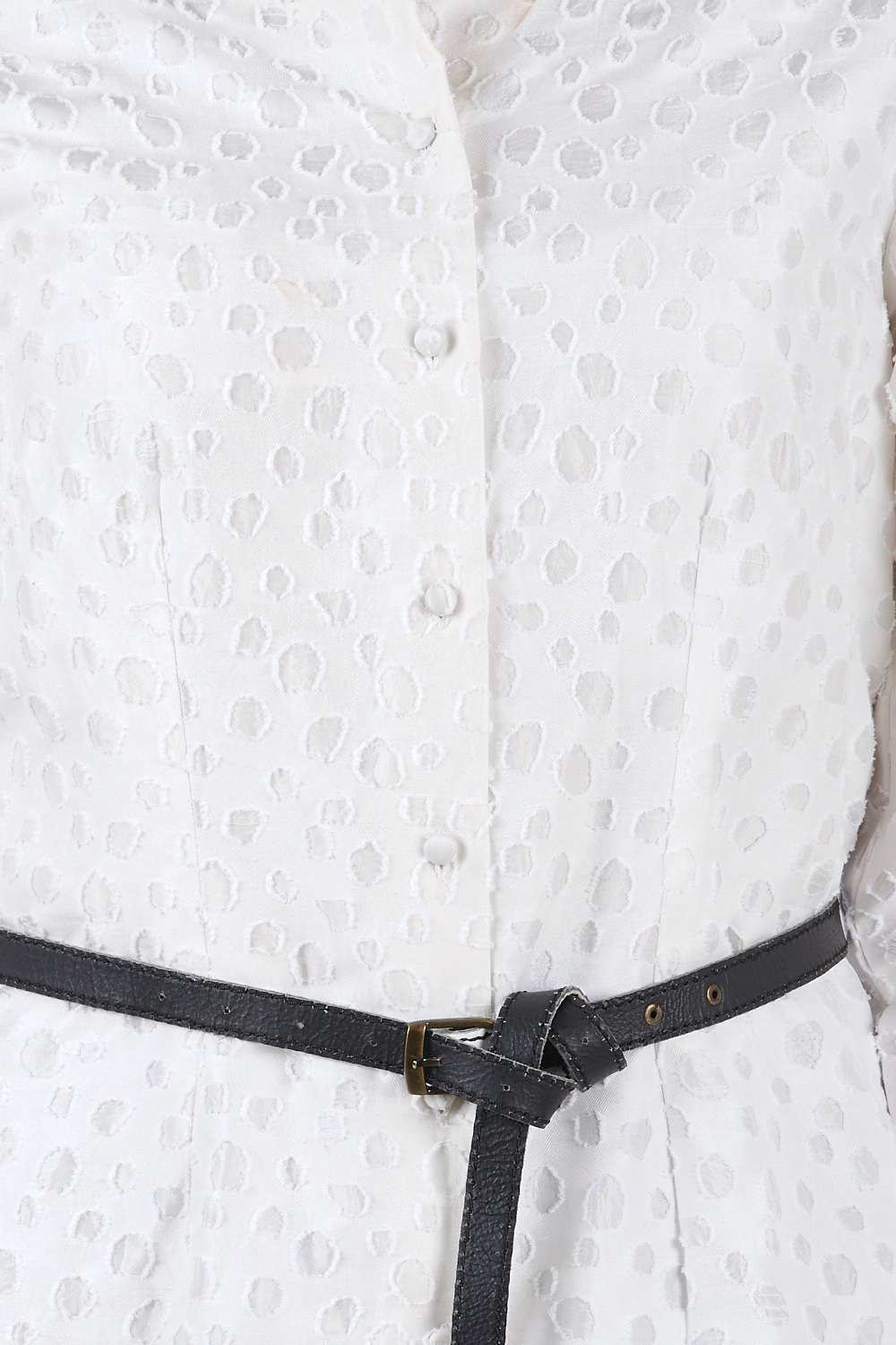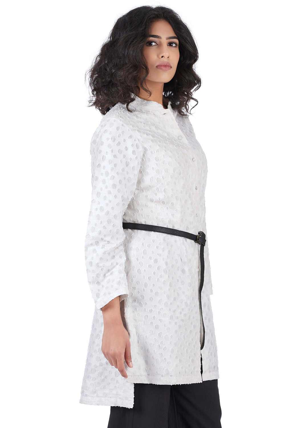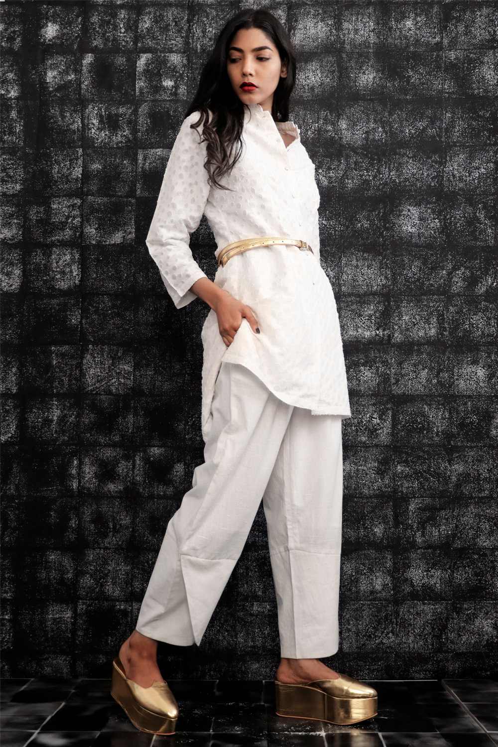 Regular-Fit Dip-Hem Button-Down Shirt. Features Allover Cutwork Dots. Specially Made Self-Cover Fabric Buttons. Wear It With Our Bengal Cotton Tulip Pants.