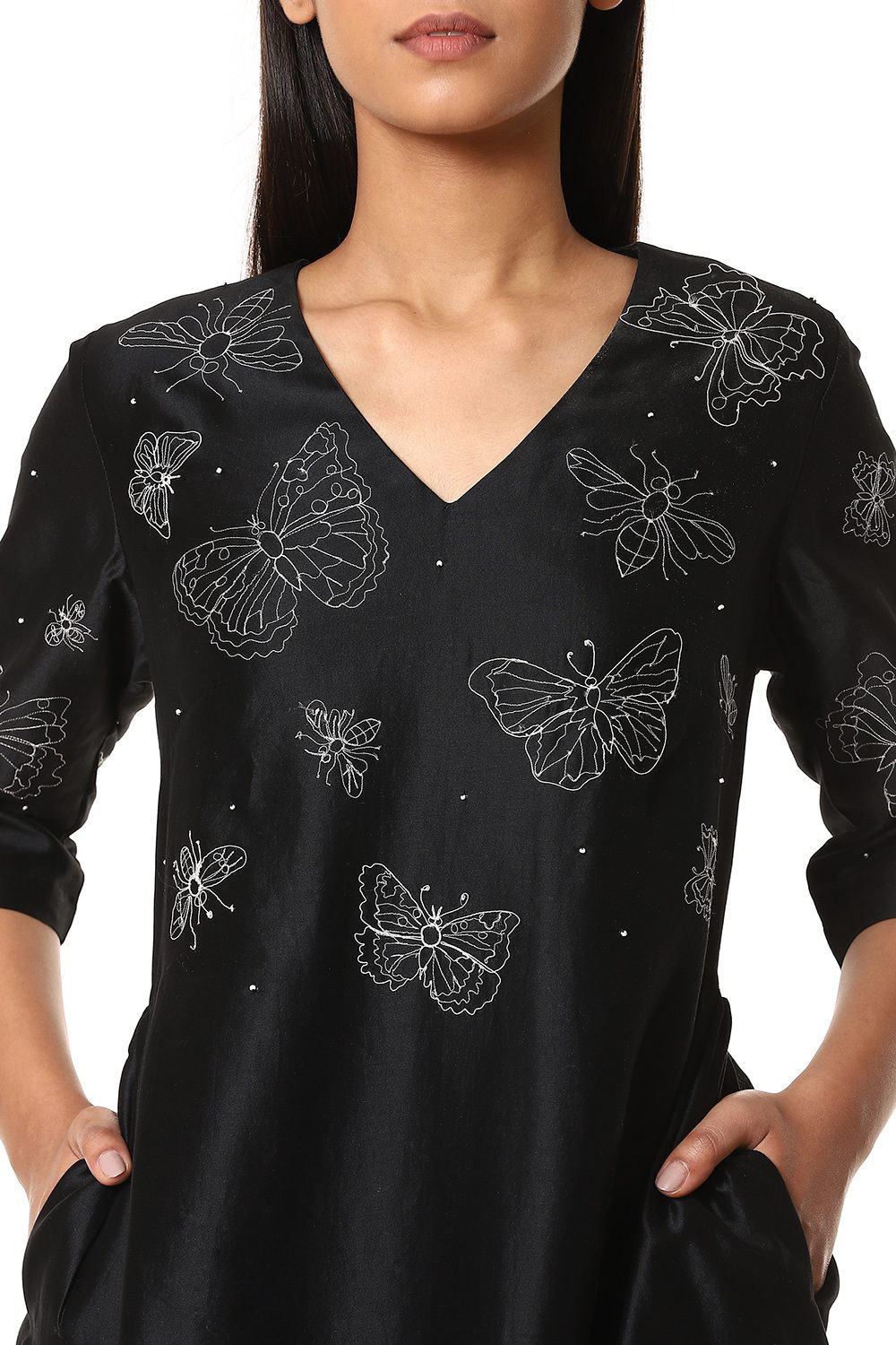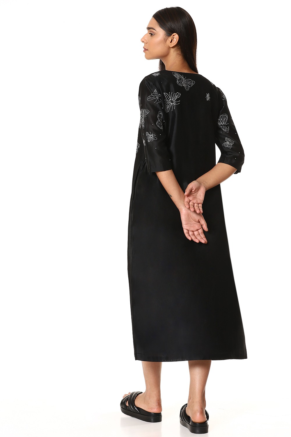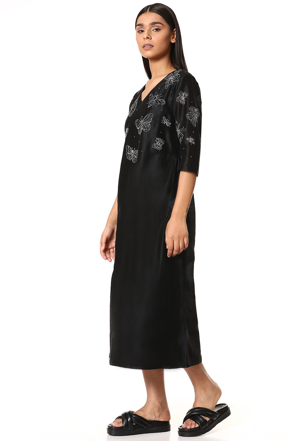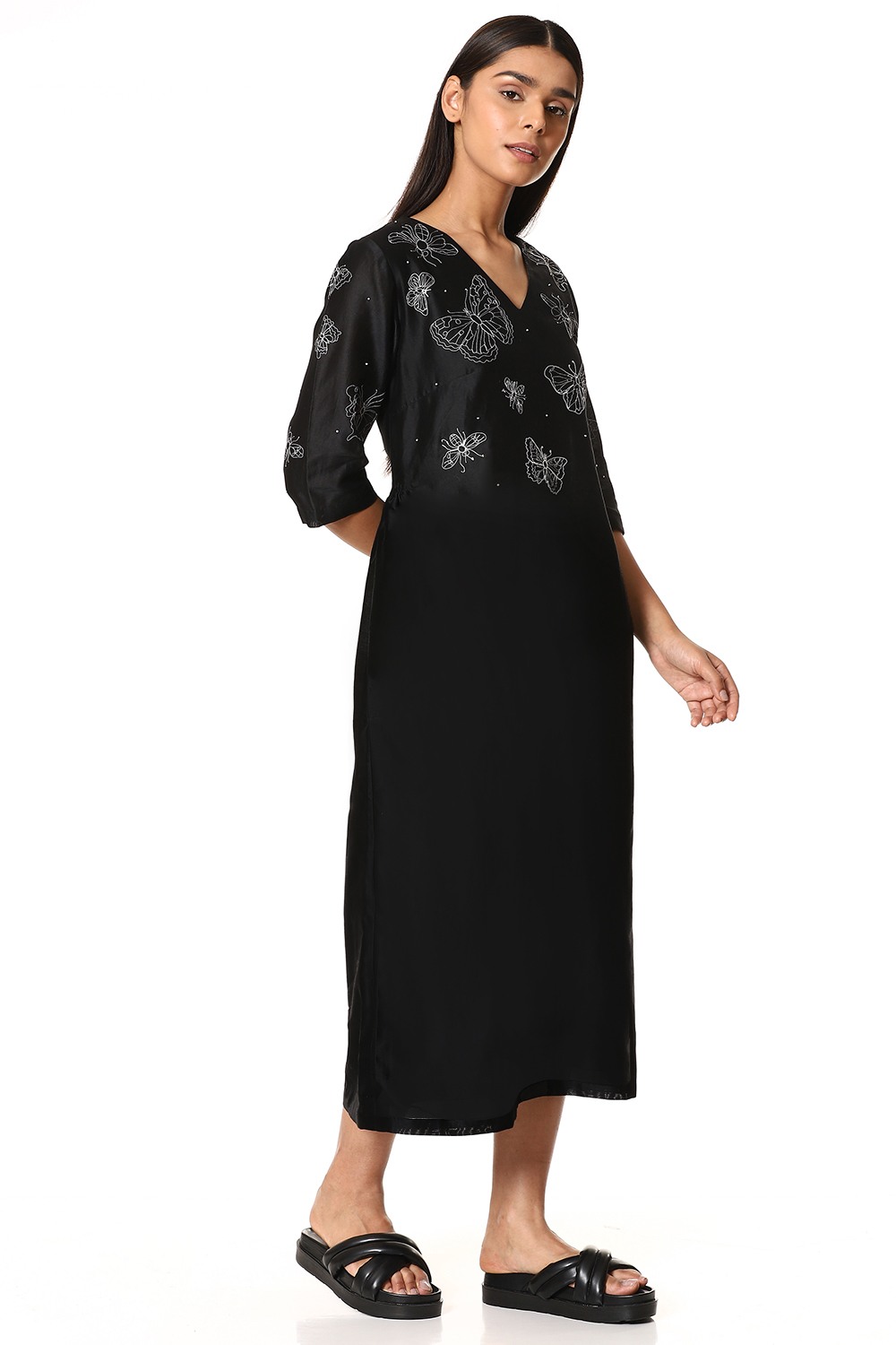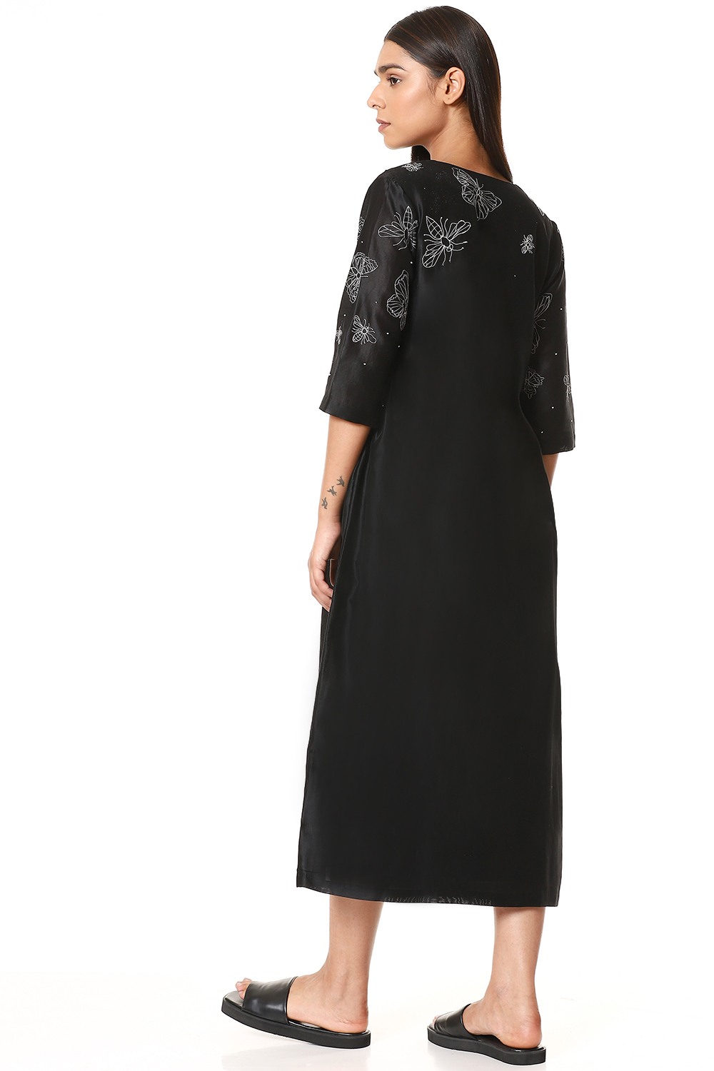 Look super elegant an chic in this black long dress, crafted from sheer light weight silk-cotton, detailed with delicately embroidered butterflies and beads in white. Handcrafted with love and specially created for your everyday clothing needs.