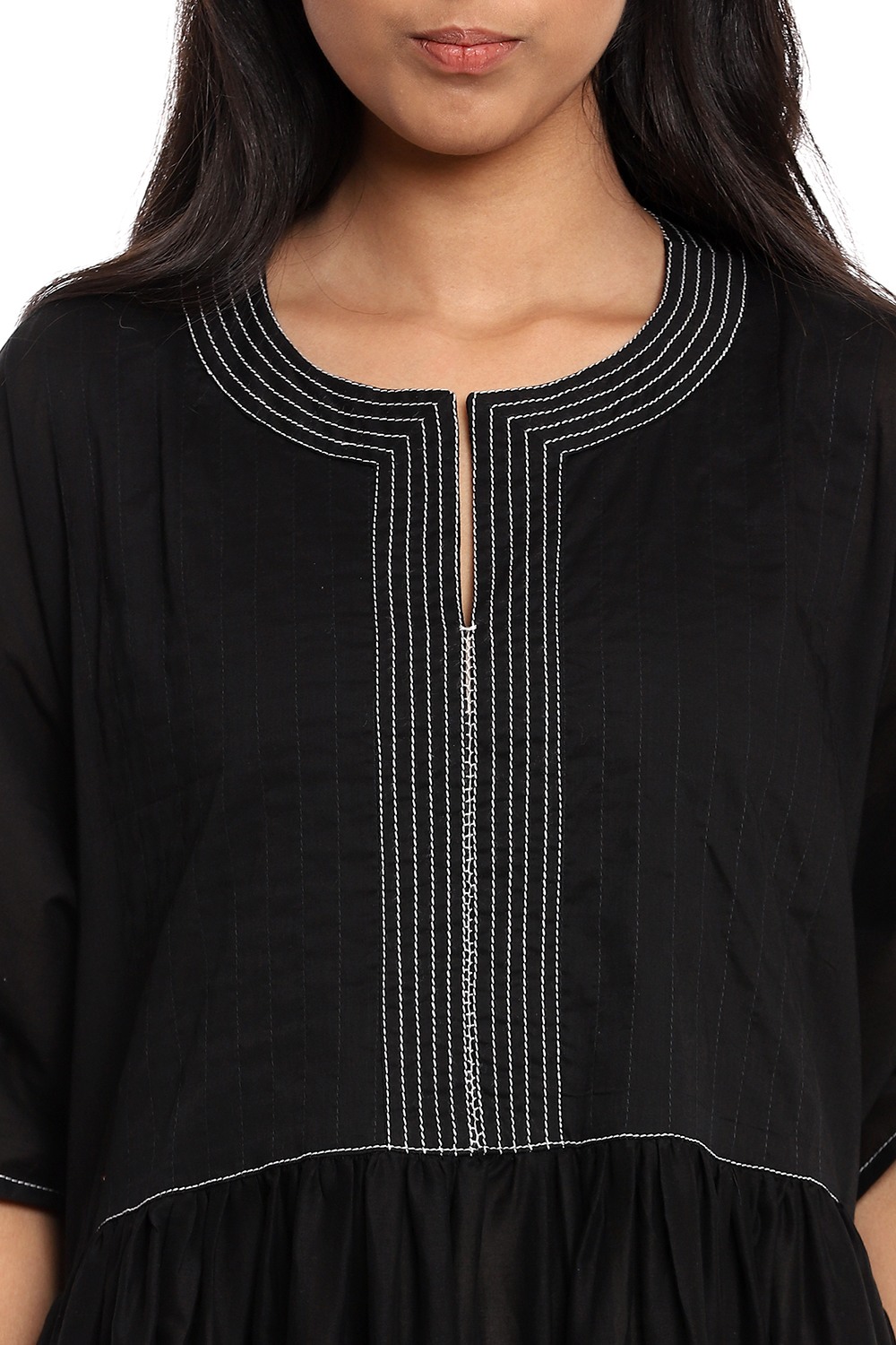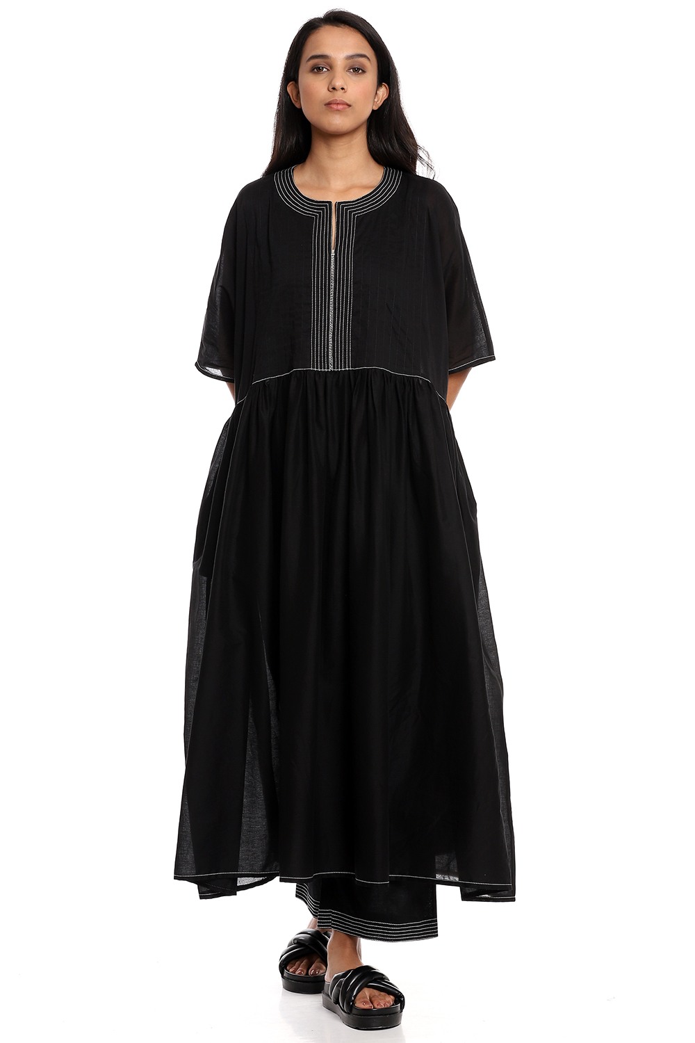 Effortless and feminine silhouette for easy dressing that elevates your style, black soft cotton voile detailed with contrast ivory stitching. Has side seam pockets and fabric ties to cinch the slightly loose fit.