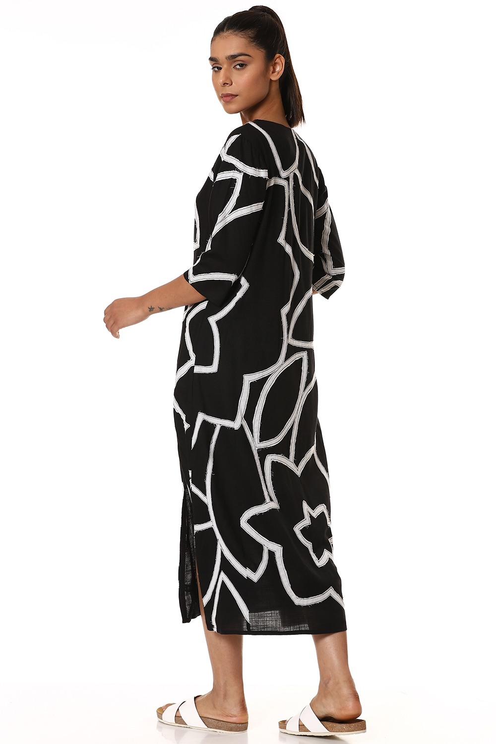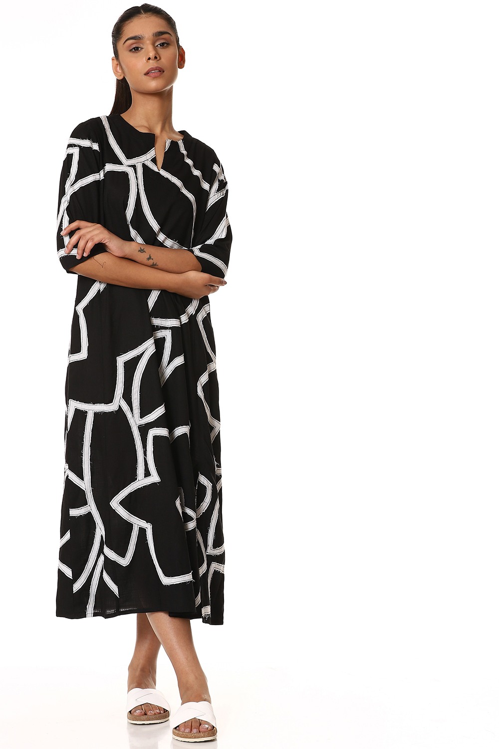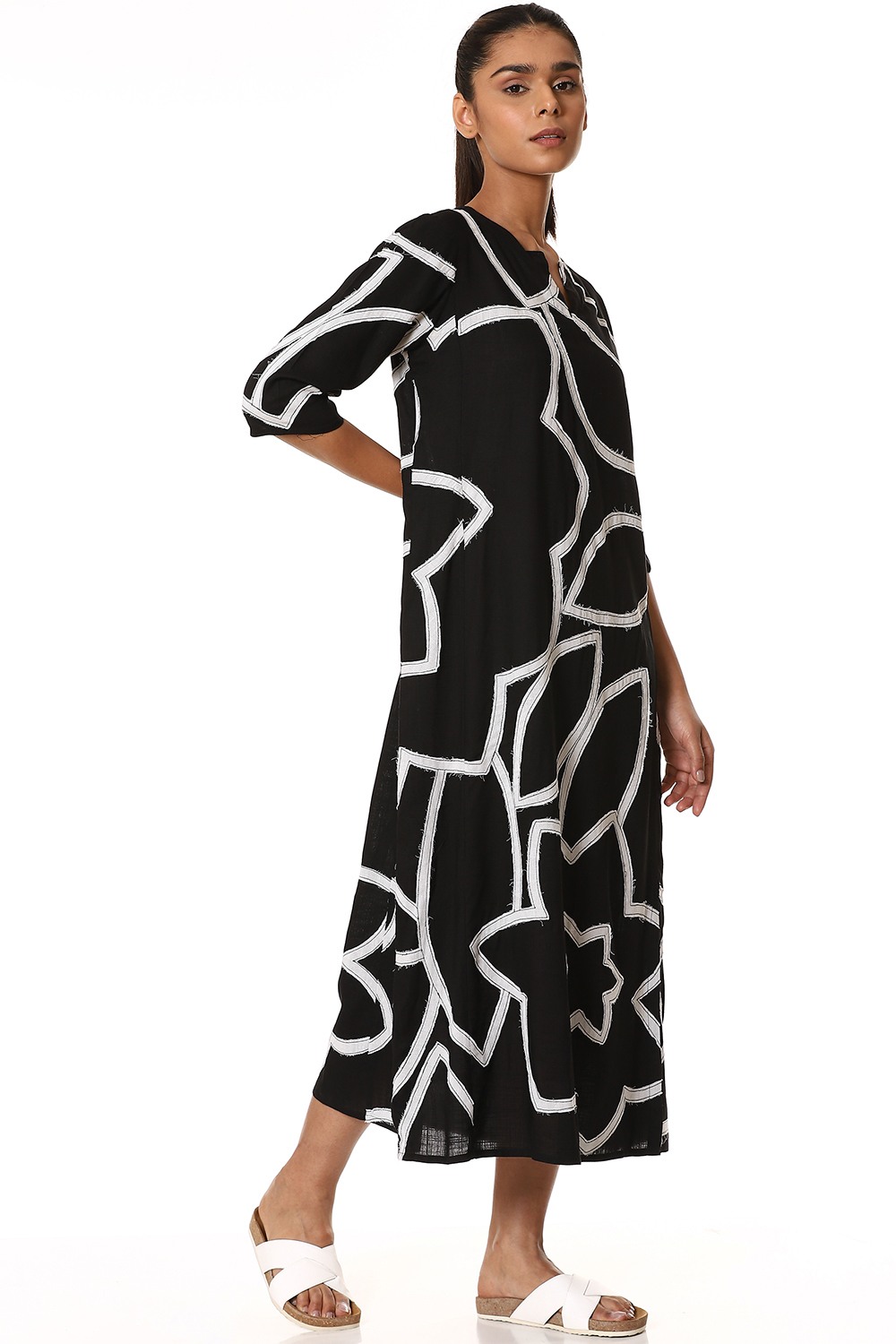 Bold in black and white long slit dress, crafted from sustainable cellulose blend fabric, detailed with large floral cutwork and applique in white. Handcrafted with love and specially created for your every day clothing needs.
