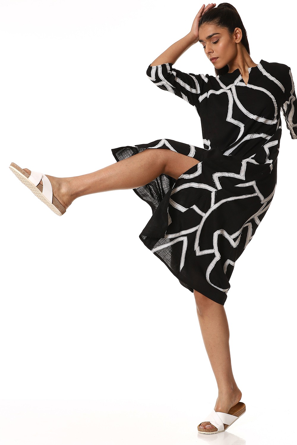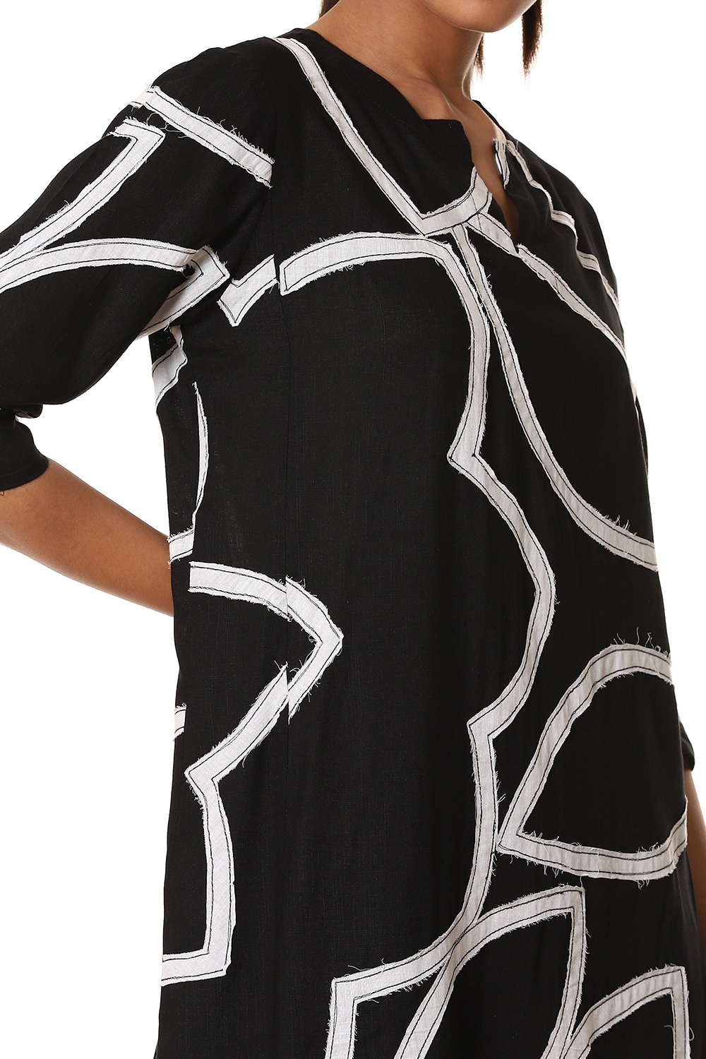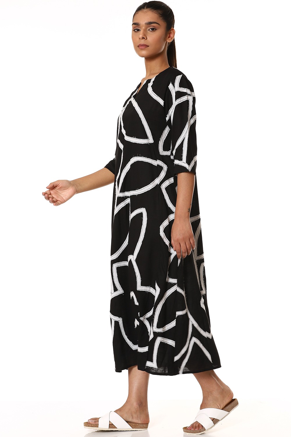 Bold in black and white long slit dress, crafted from sustainable cellulose blend fabric, detailed with large floral cutwork and applique in white. Handcrafted with love and specially created for your every day clothing needs.