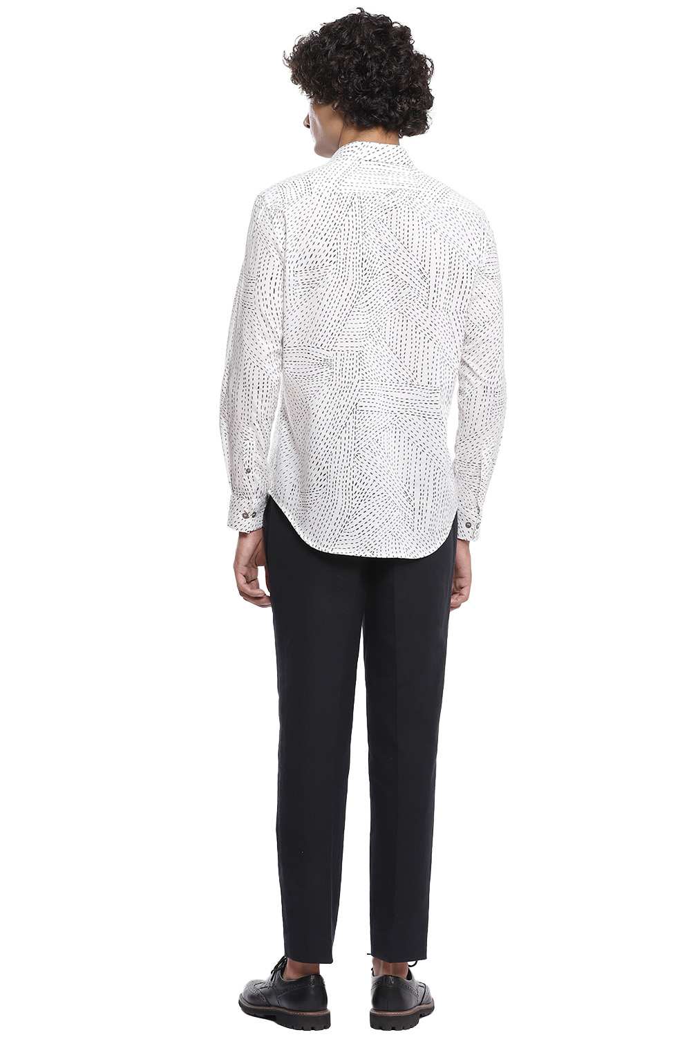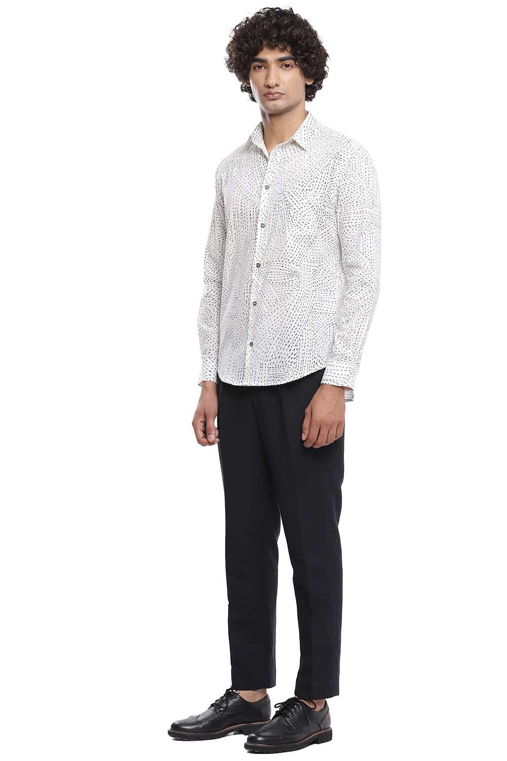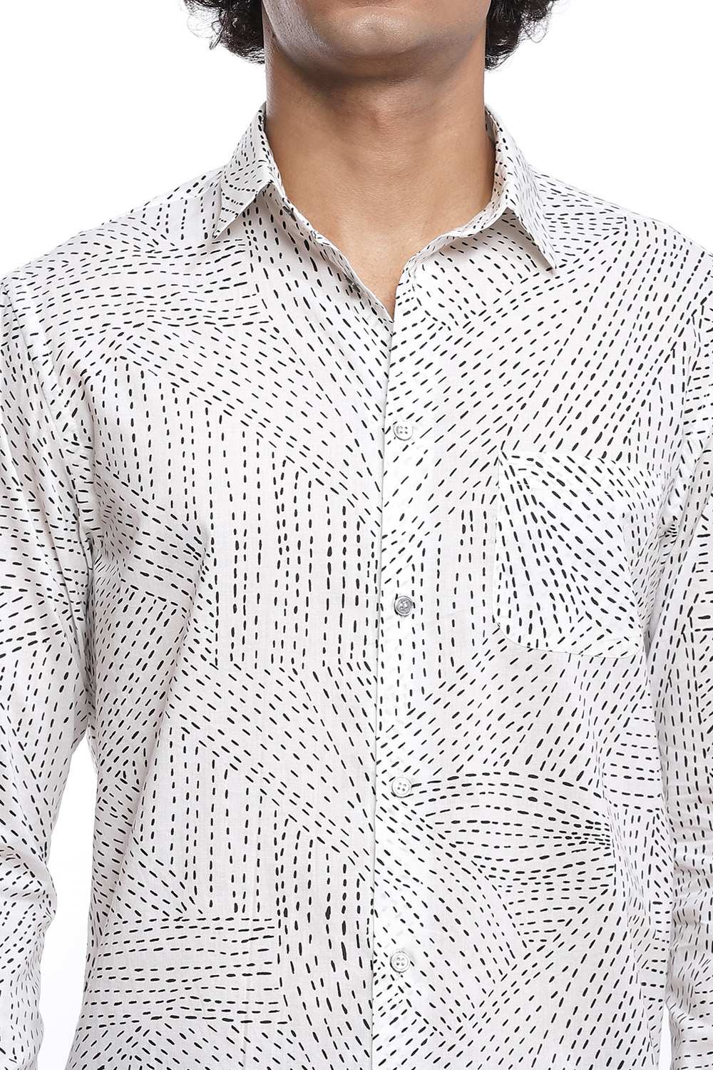 Inspired by the traditional style of running stitch, the kantha printed shirt, cut for an easy and comfortable fit, Crafted from cotton cambric that is soft to the touch in black and ivory.