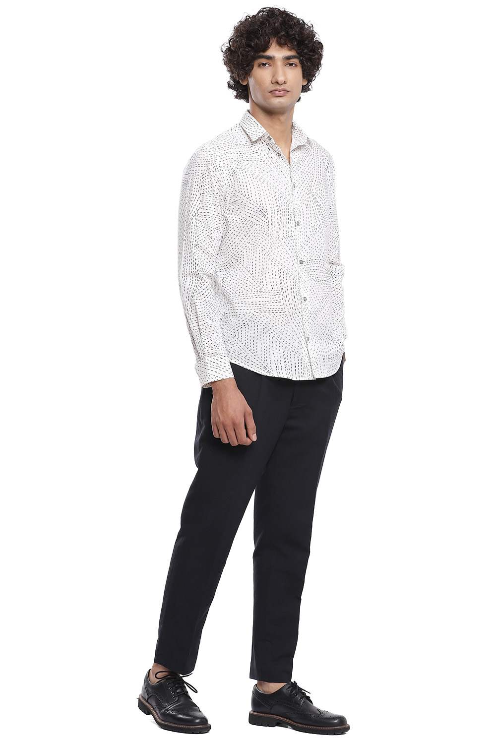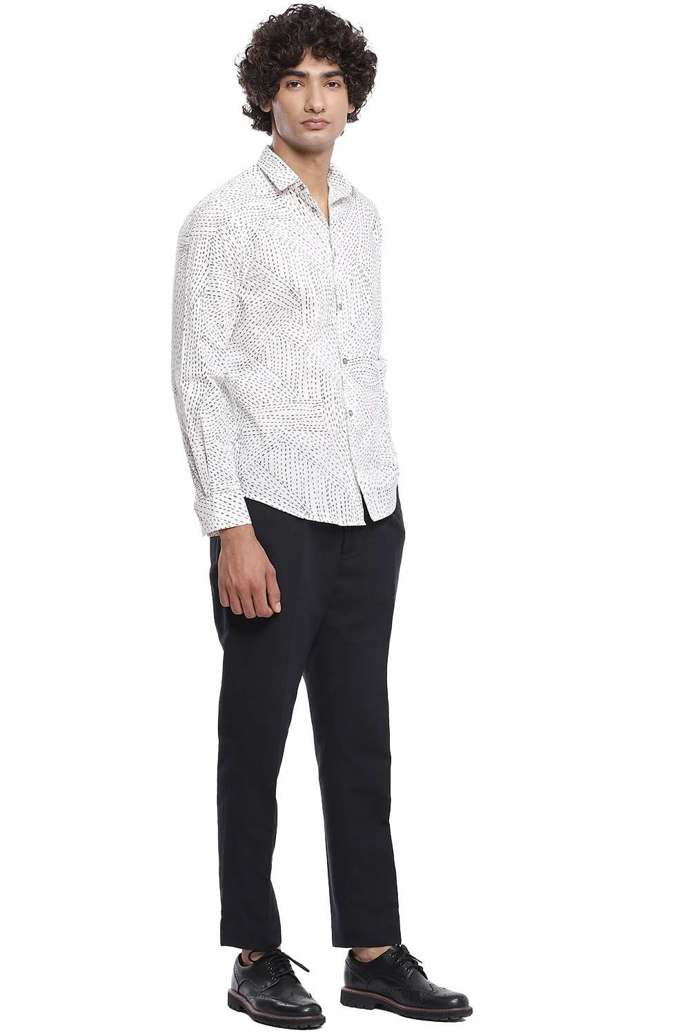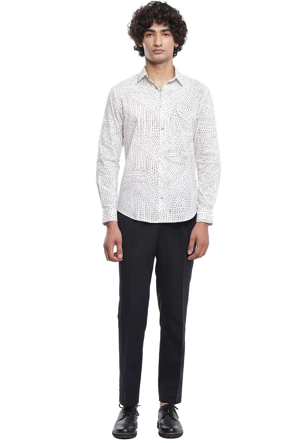Inspired by the traditional style of running stitch, the kantha printed shirt, cut for an easy and comfortable fit, Crafted from cotton cambric that is soft to the touch in black and ivory.