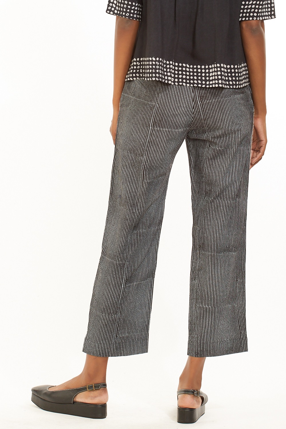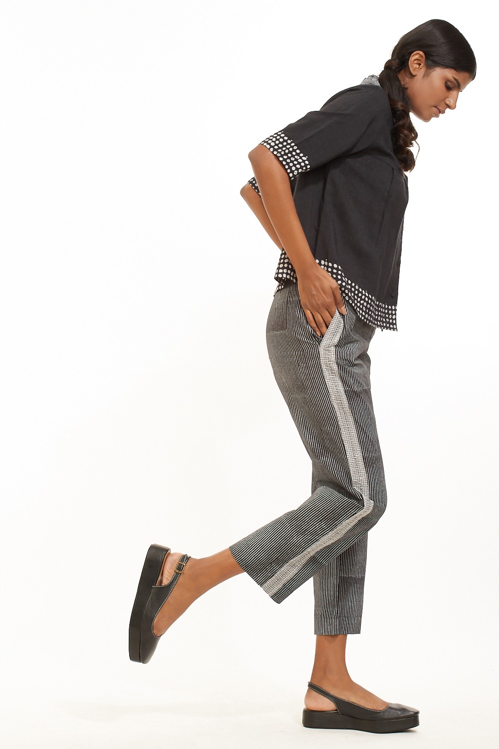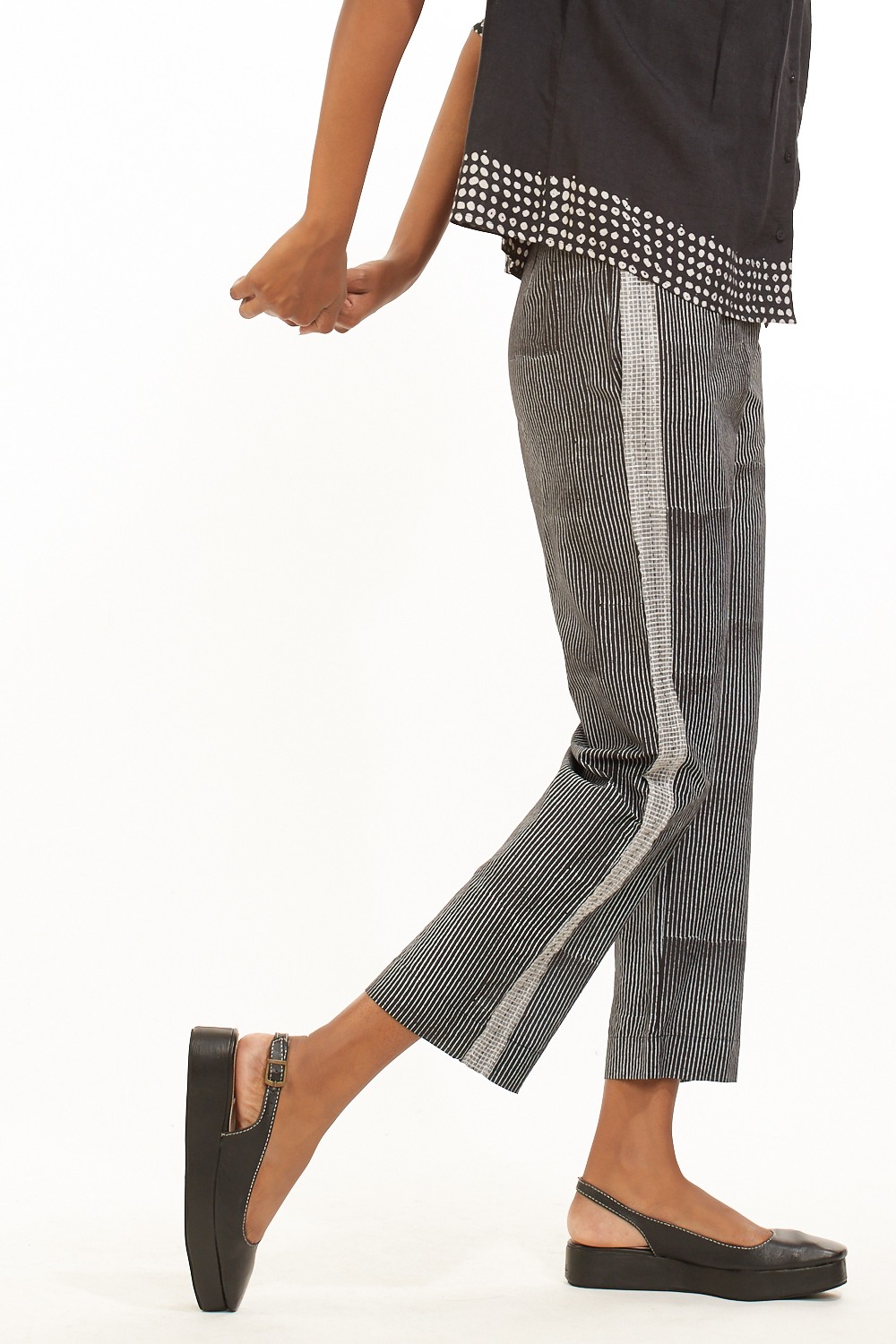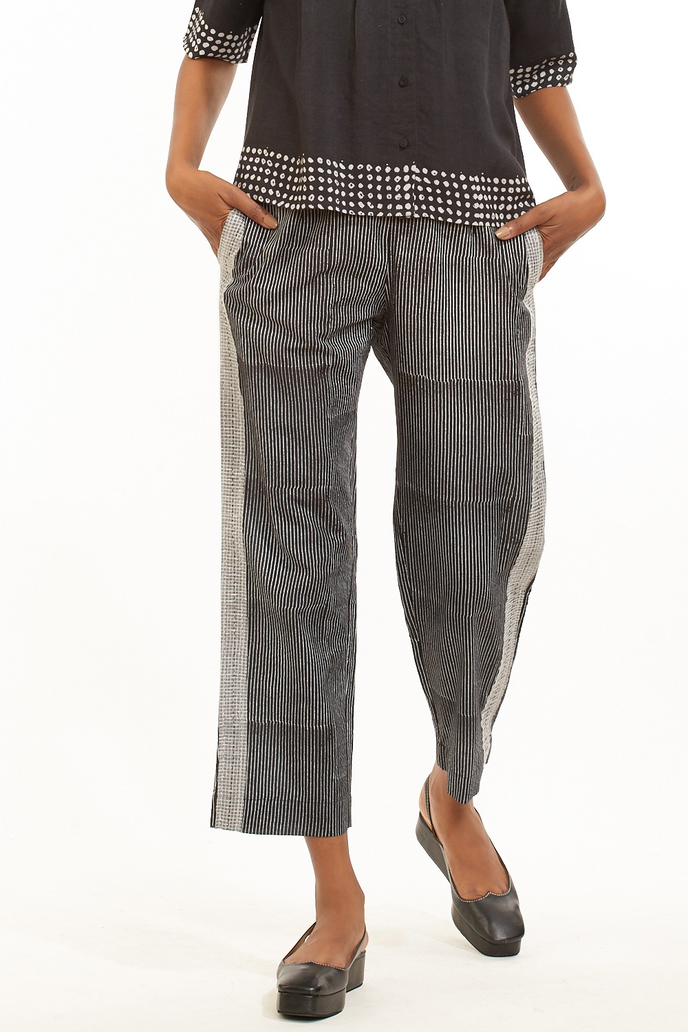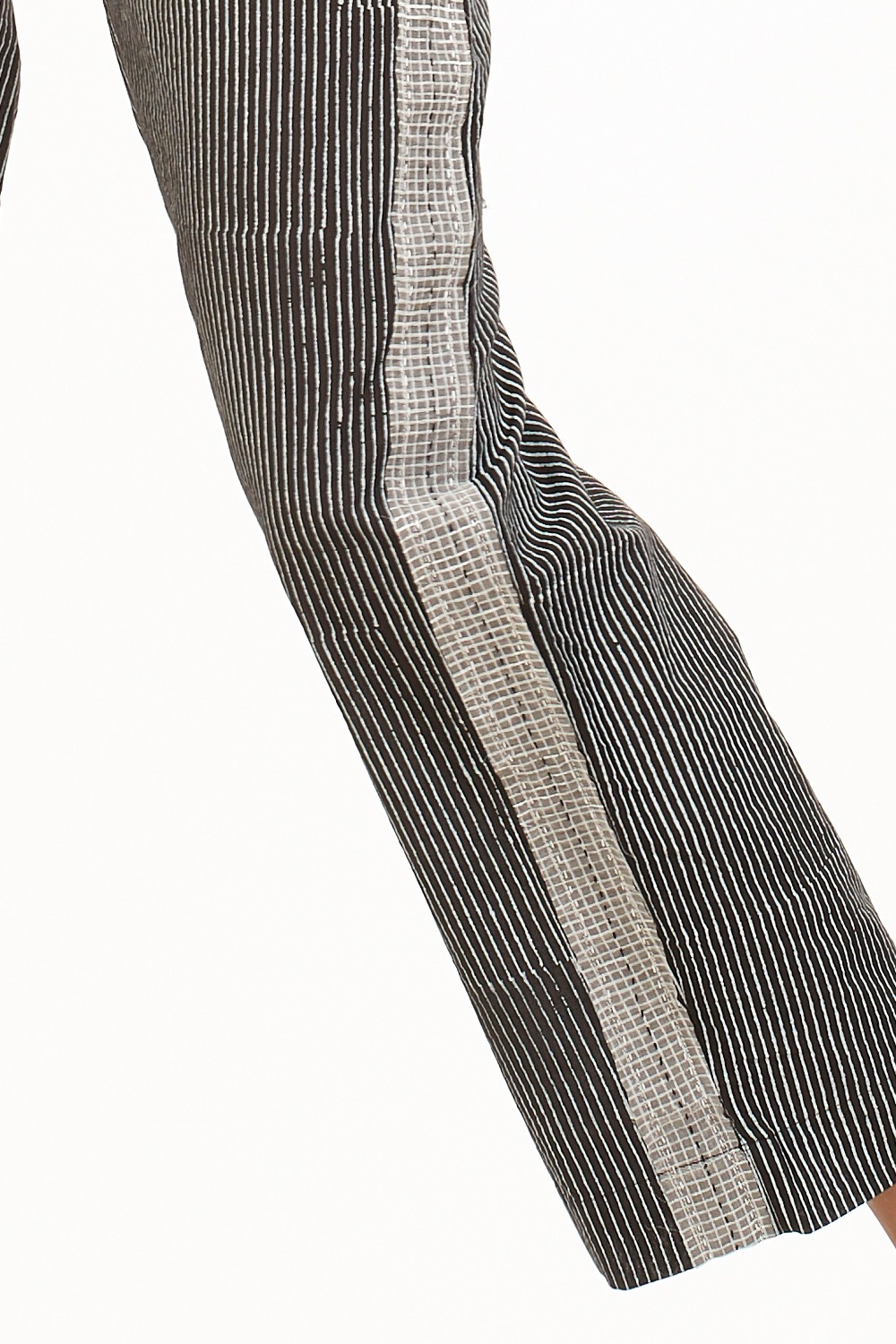 Regular Fit Pant. Stripe Block Print And Silk Organza Strip On Side With Hand Kantha Pant. Garments Are Made From Fabric That Is Washed And Pre-Shrunk To Give A Superior Hand.