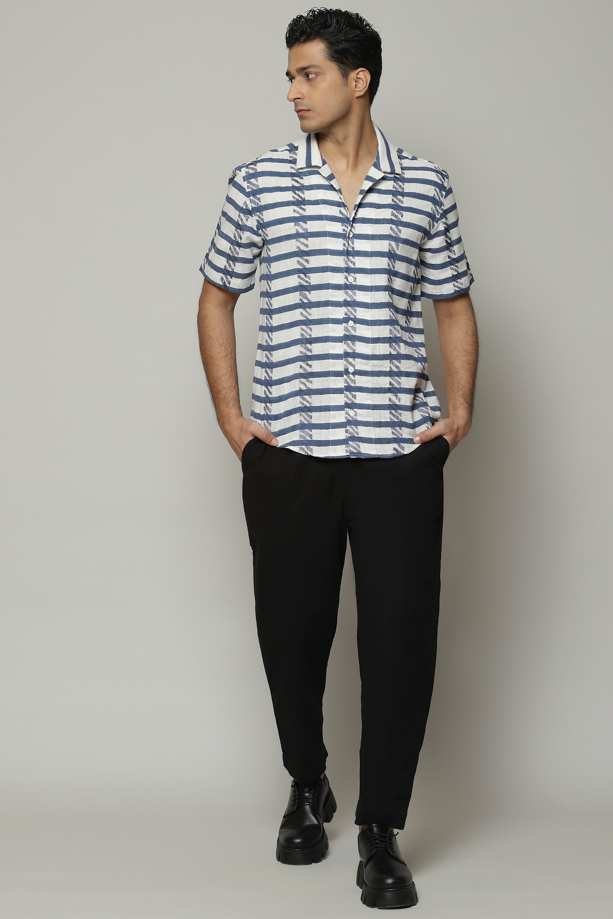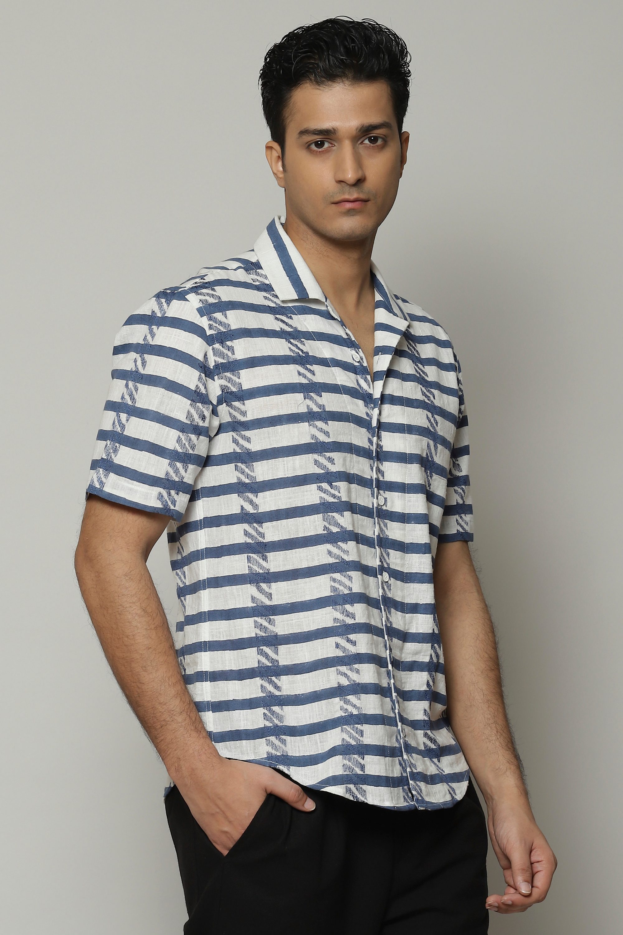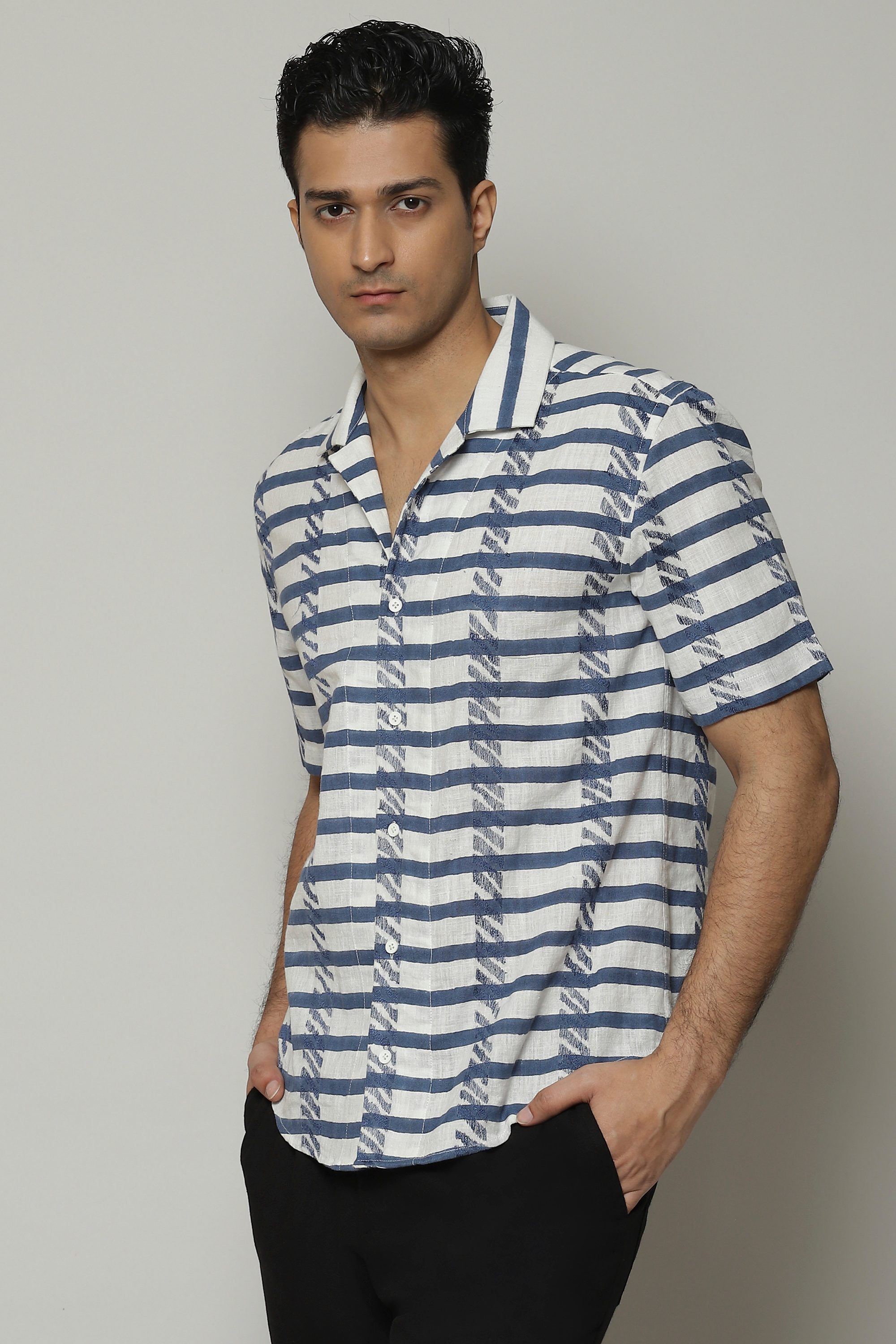 A classic cut shirt plays with bold, zebra patterns block-printed by hand. The embroidery is inspired by the pattern the weave creates. Crafted in 100% cotton, this shirt is equal parts breathable and durable. Perfect for a lazy brunch that folds into another urban adventure.