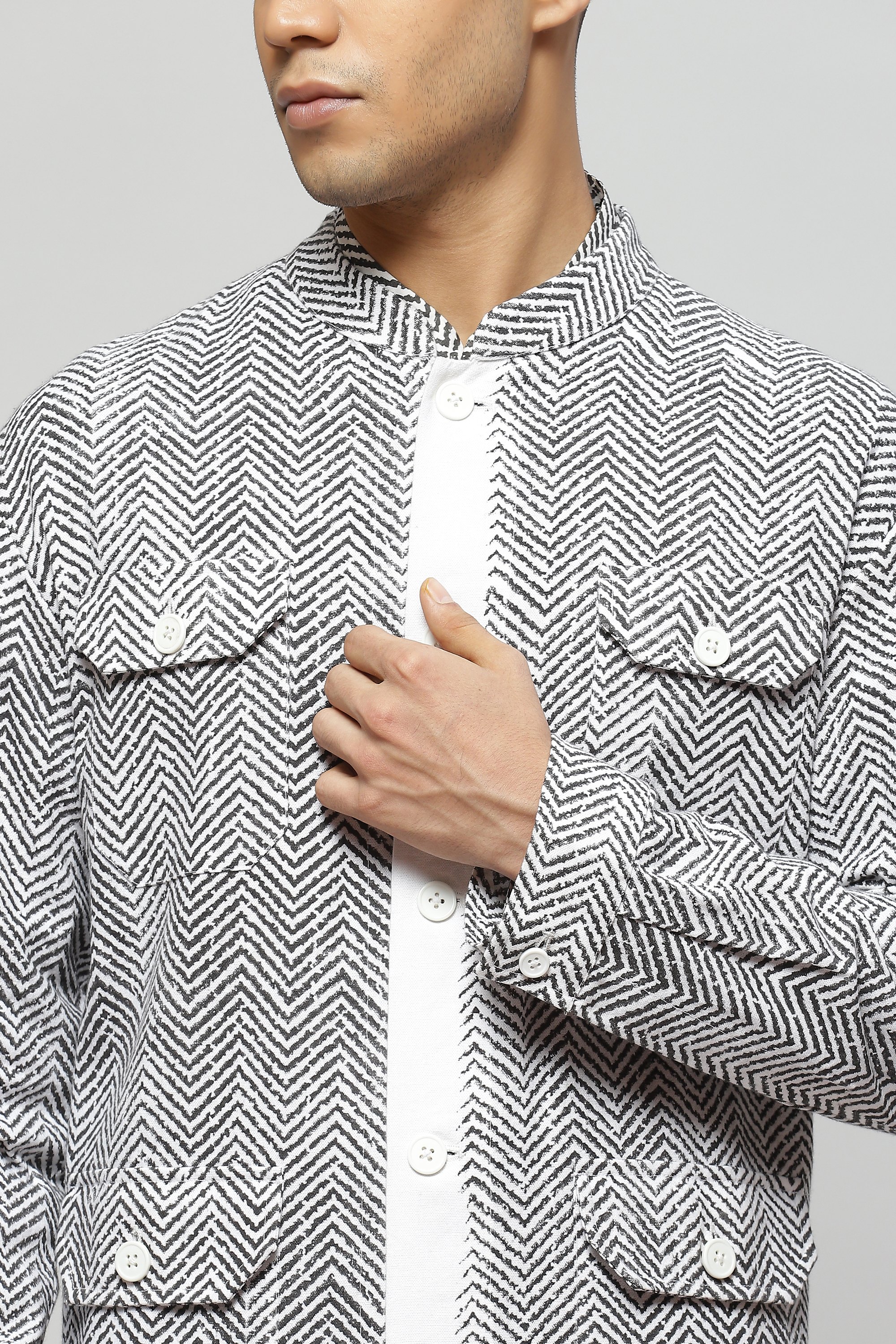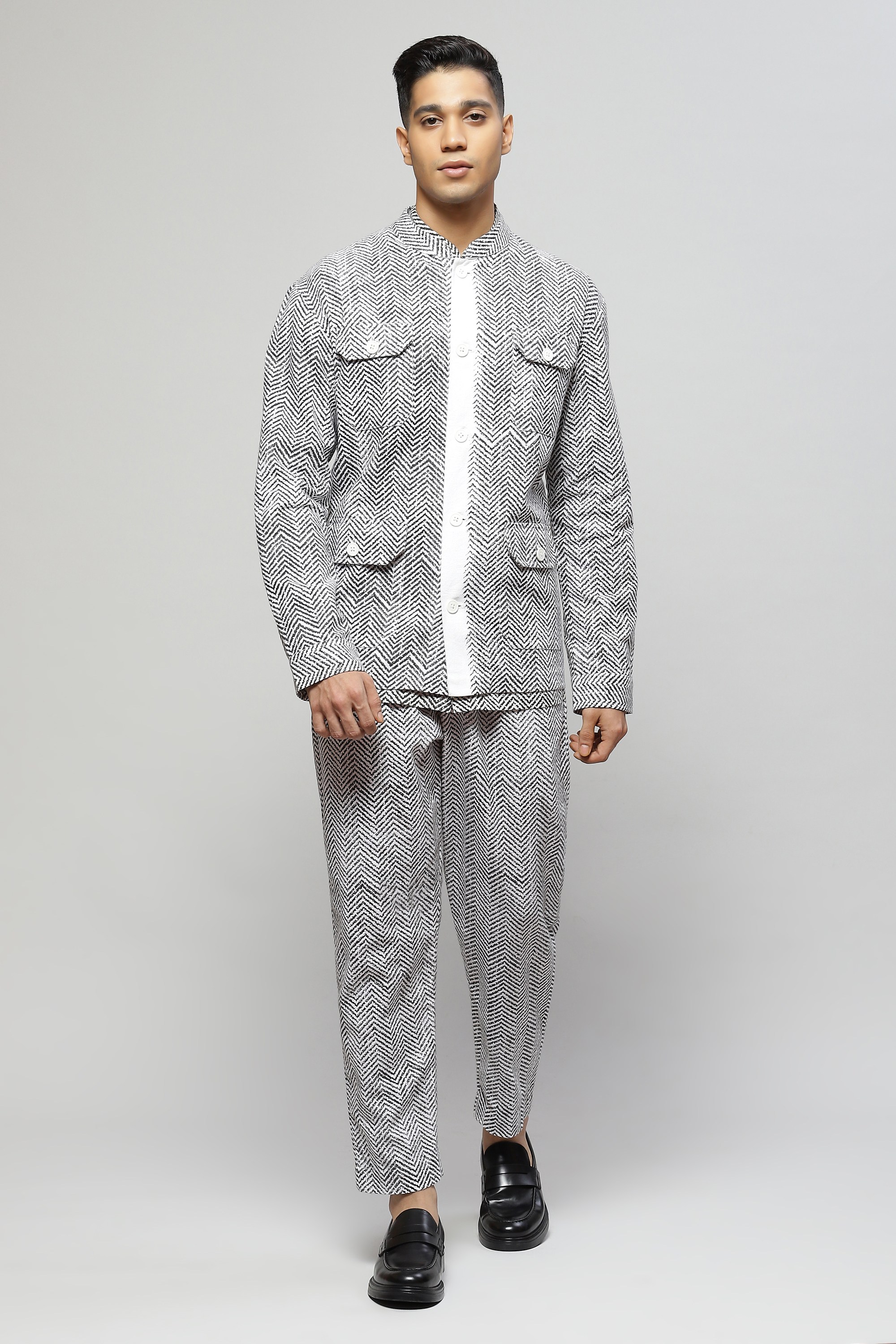 A safari-inspired hand-block printed jacket featuring a herringbone pattern