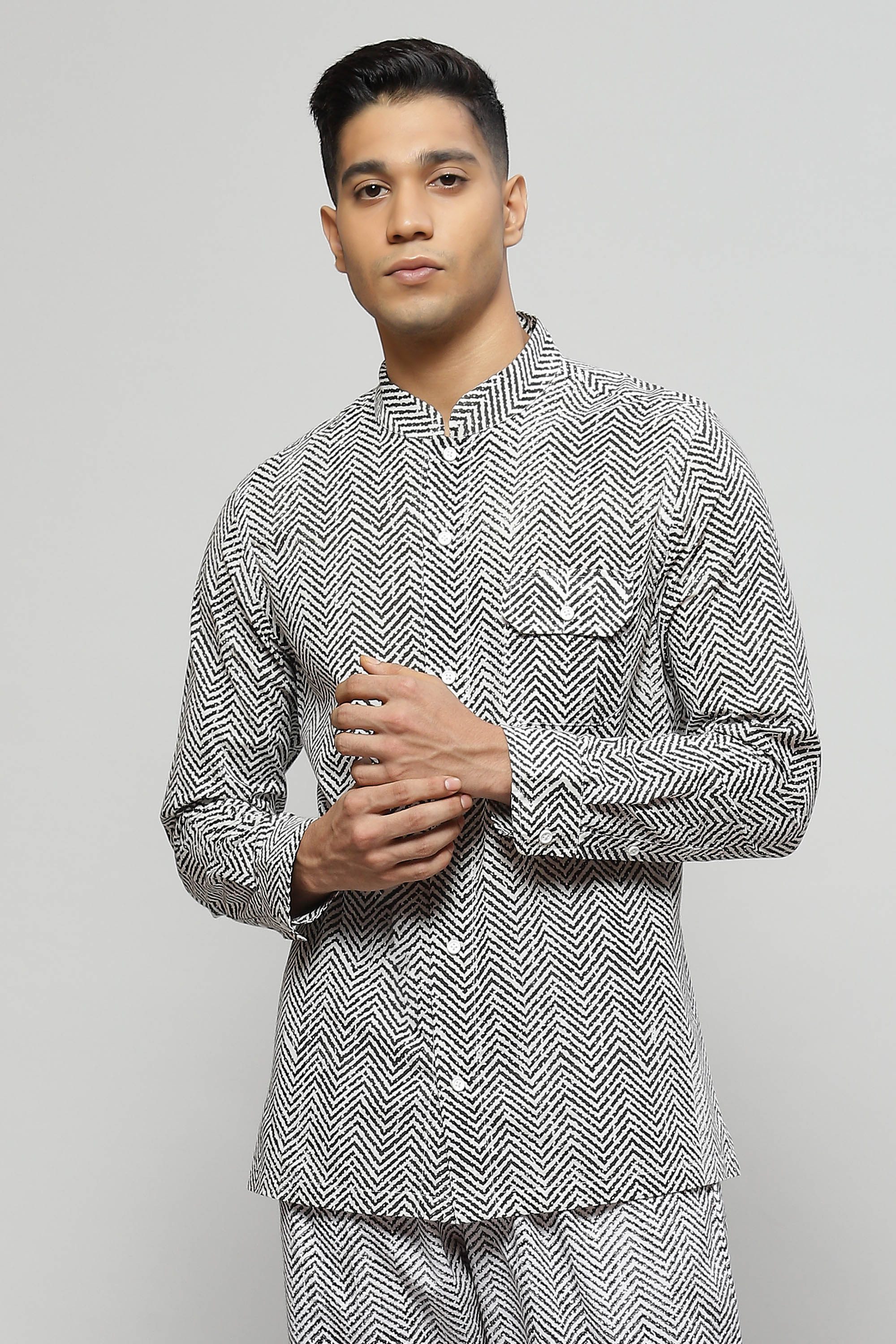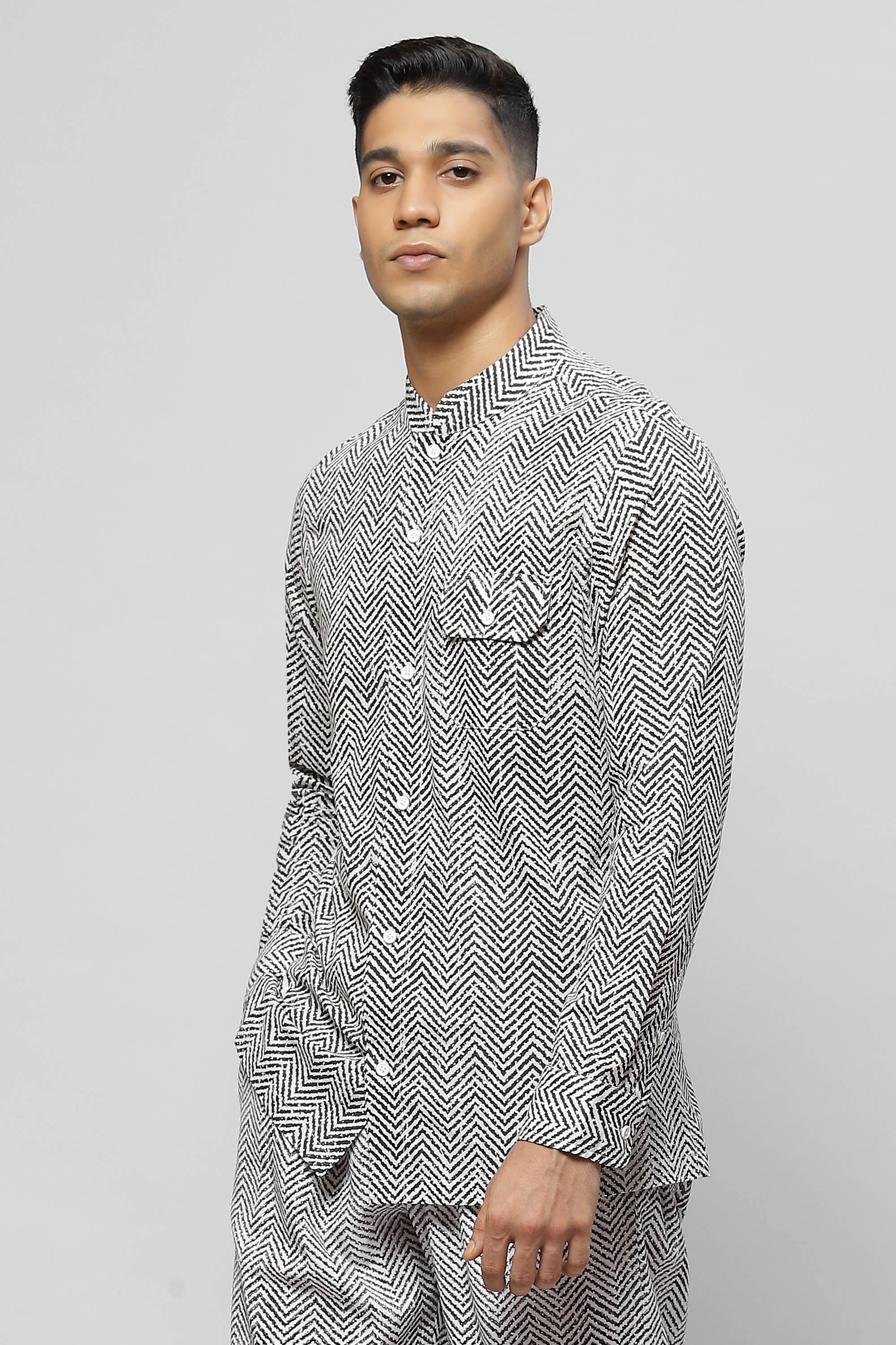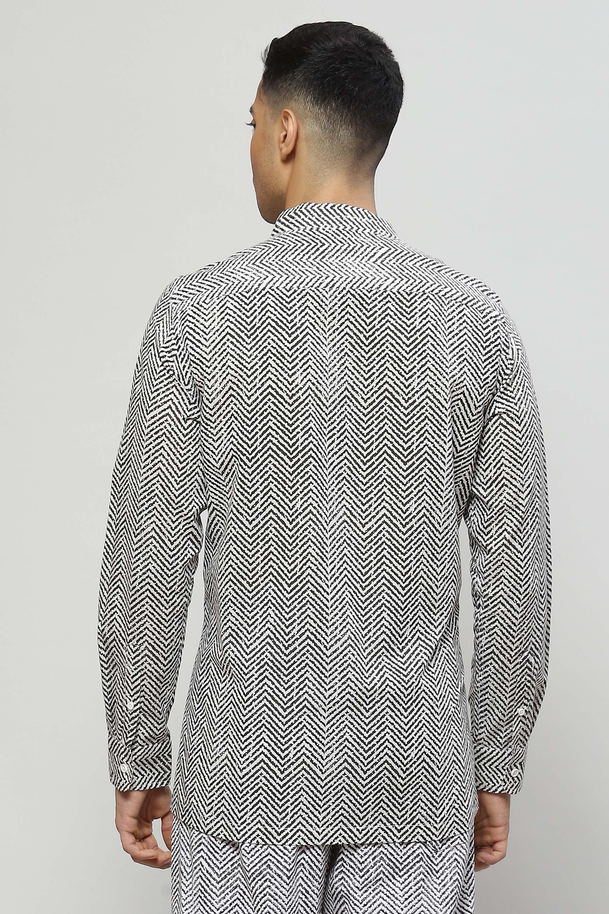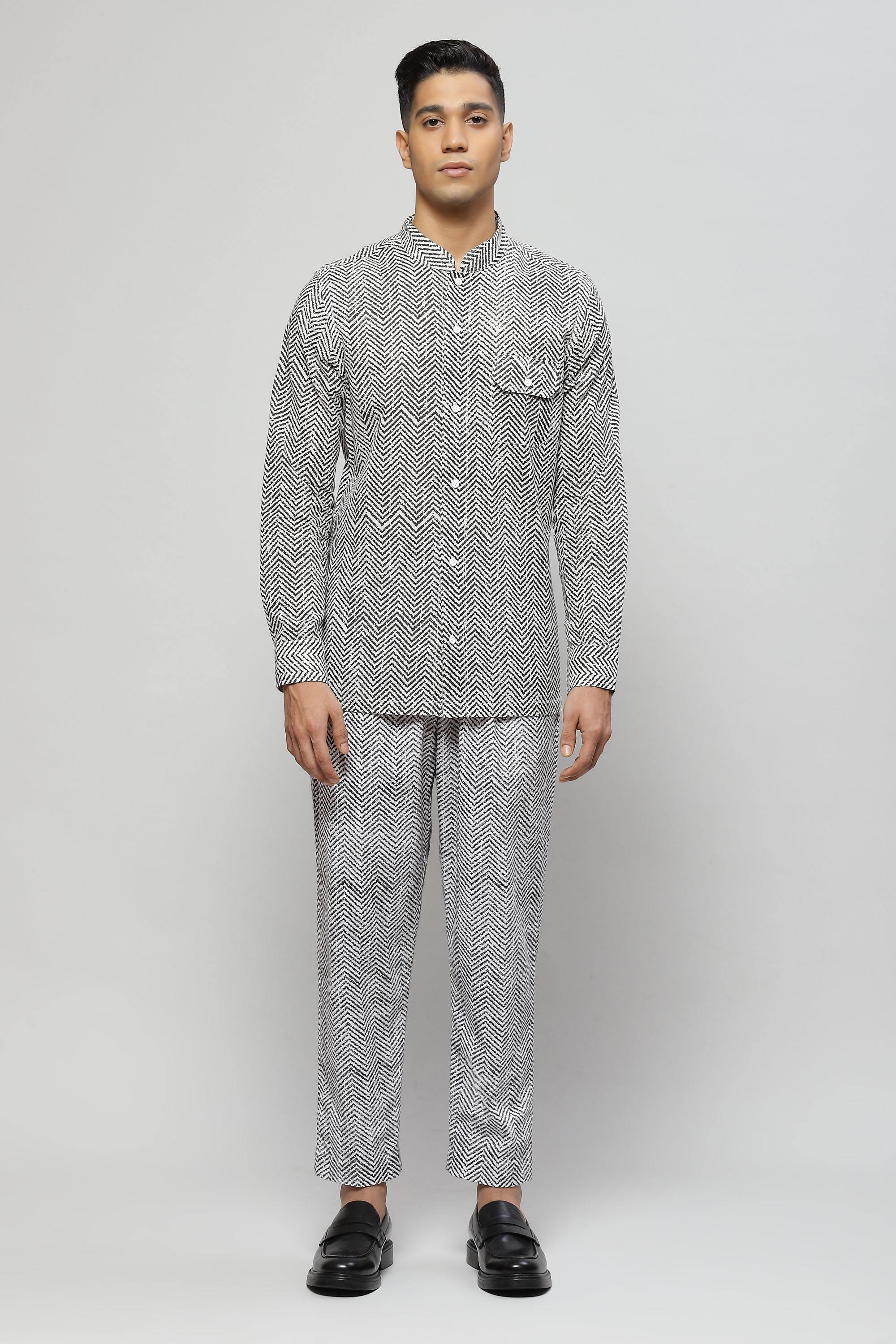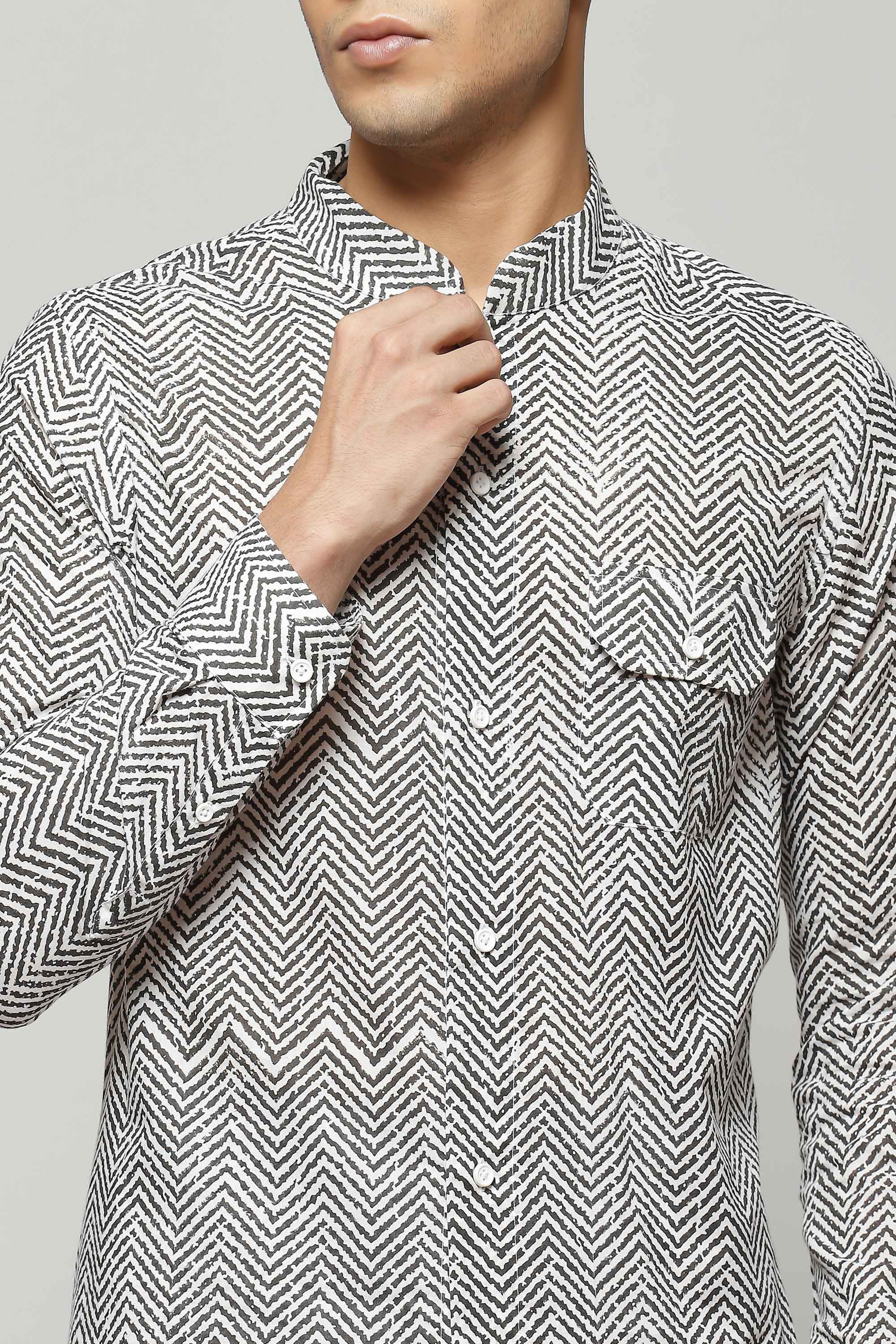 A mandarin-collared hand block printed shirt featuring a herringbone pattern