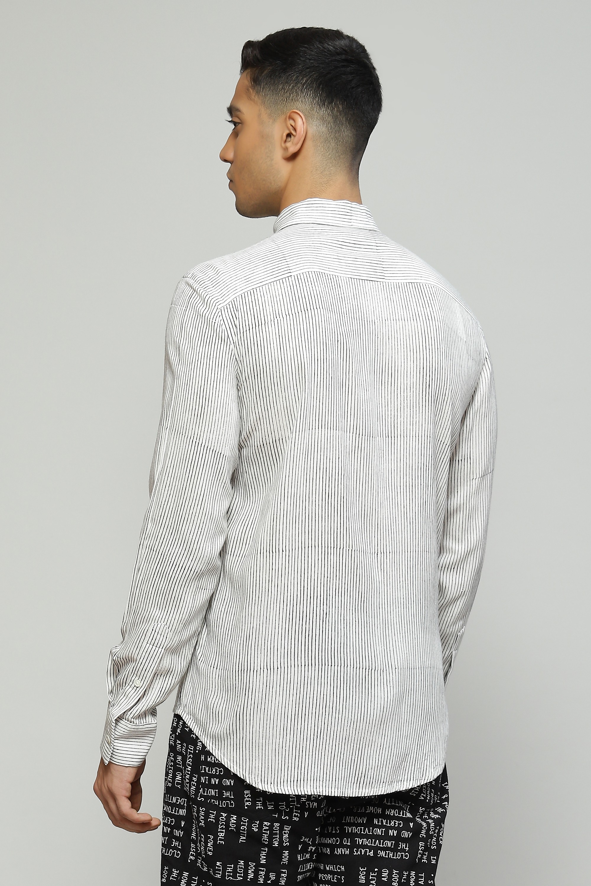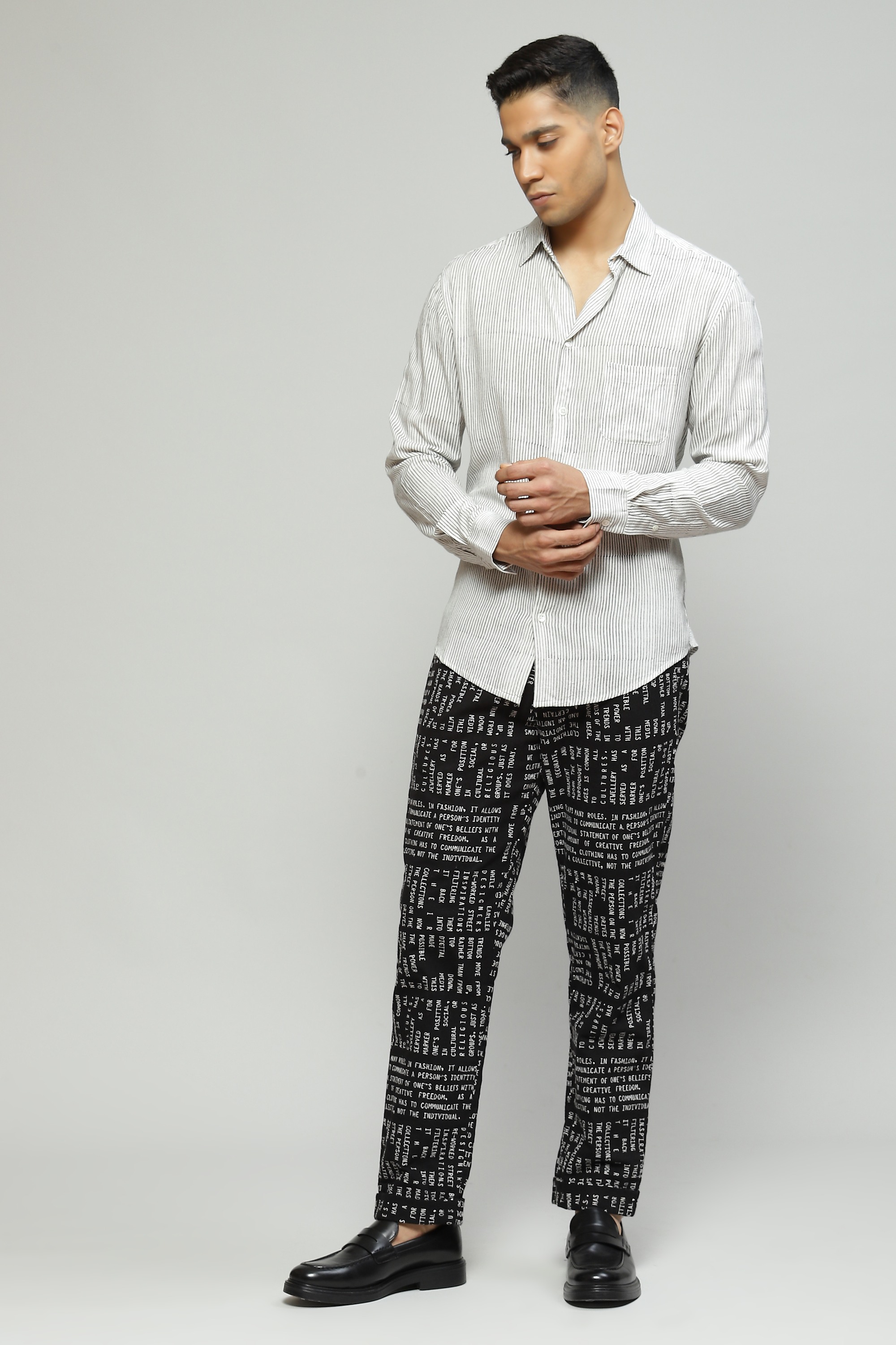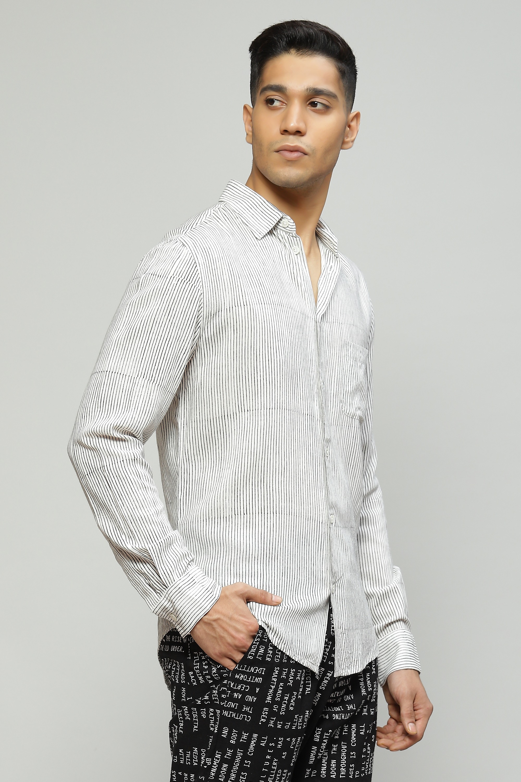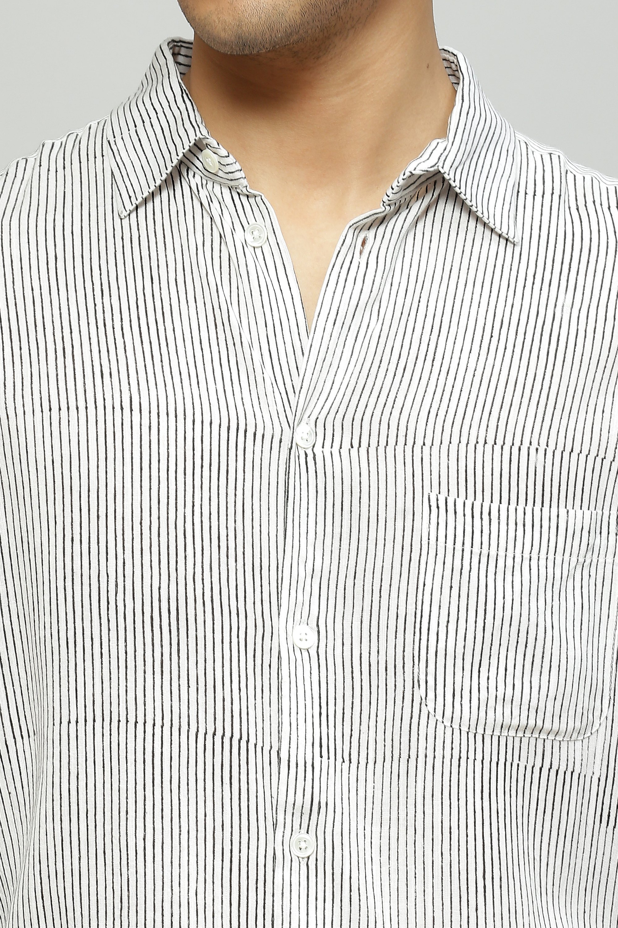 Lightweight cambric shirt featuring monochromatic block print and pinstripes Style with pleated off-white trousers for relaxed day dressing