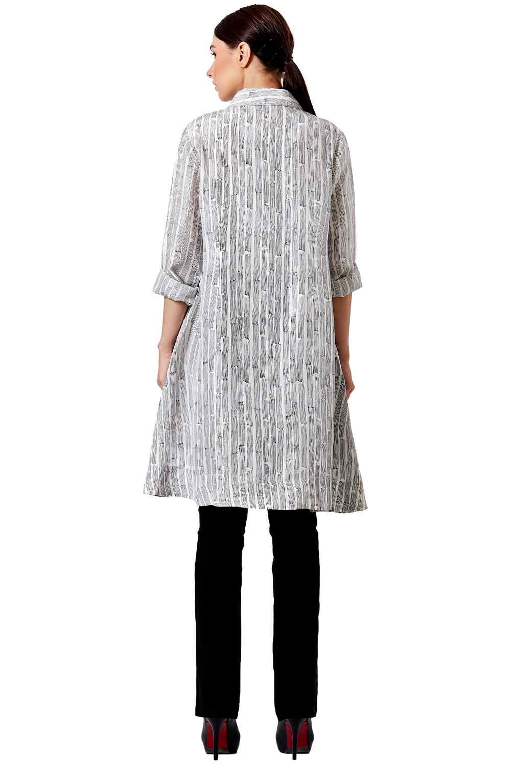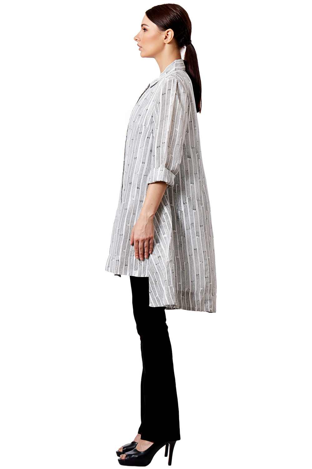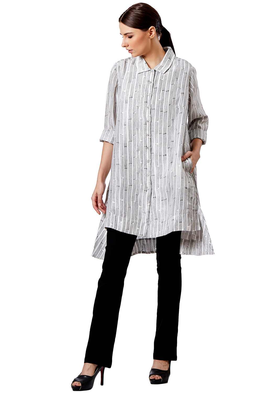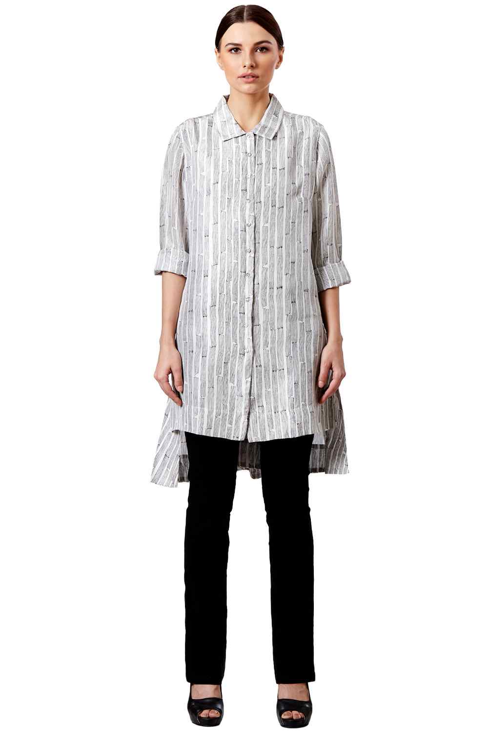 Button Down Shirt. Hand Block Printed All Over Stripes With Split Side Dip Hem.