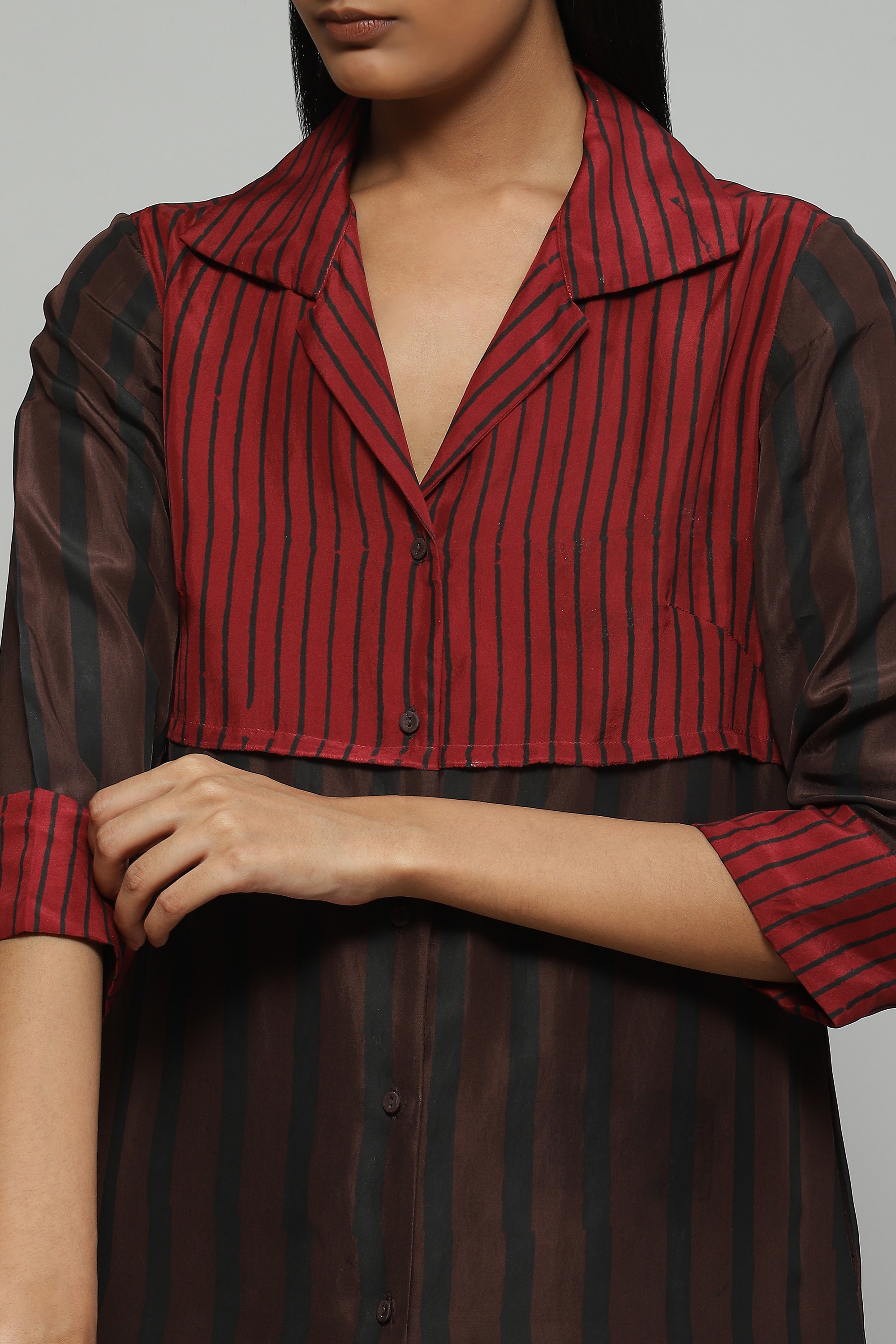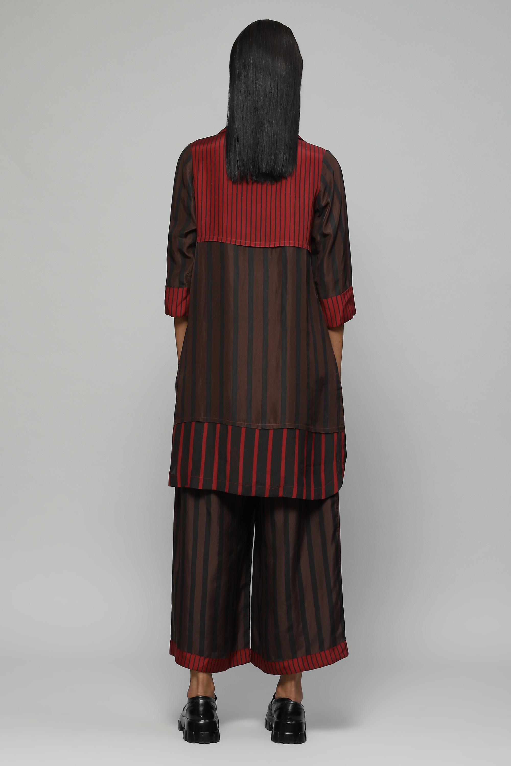 In an earthy shade of coffee this silk blouse is created using the century old tradition of hand block printing with a contemporary spin