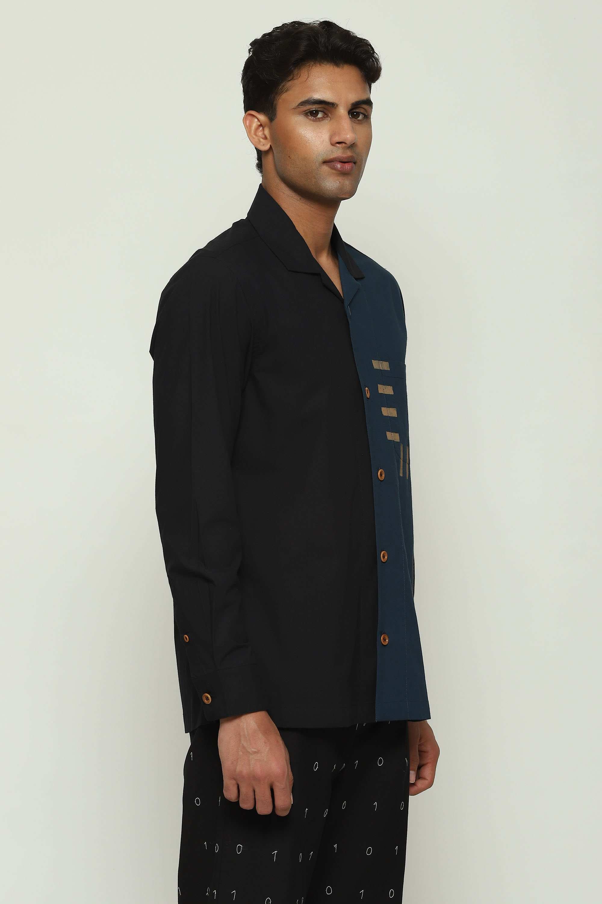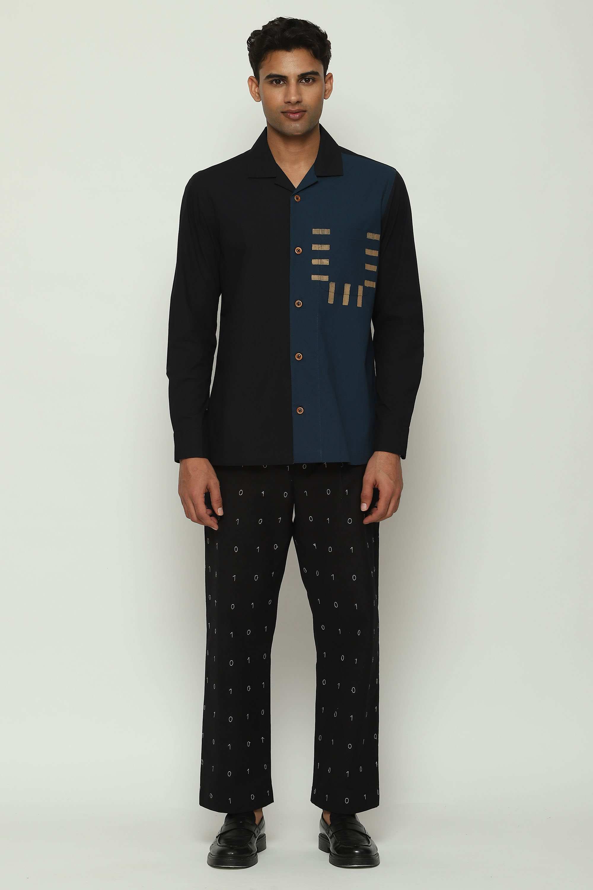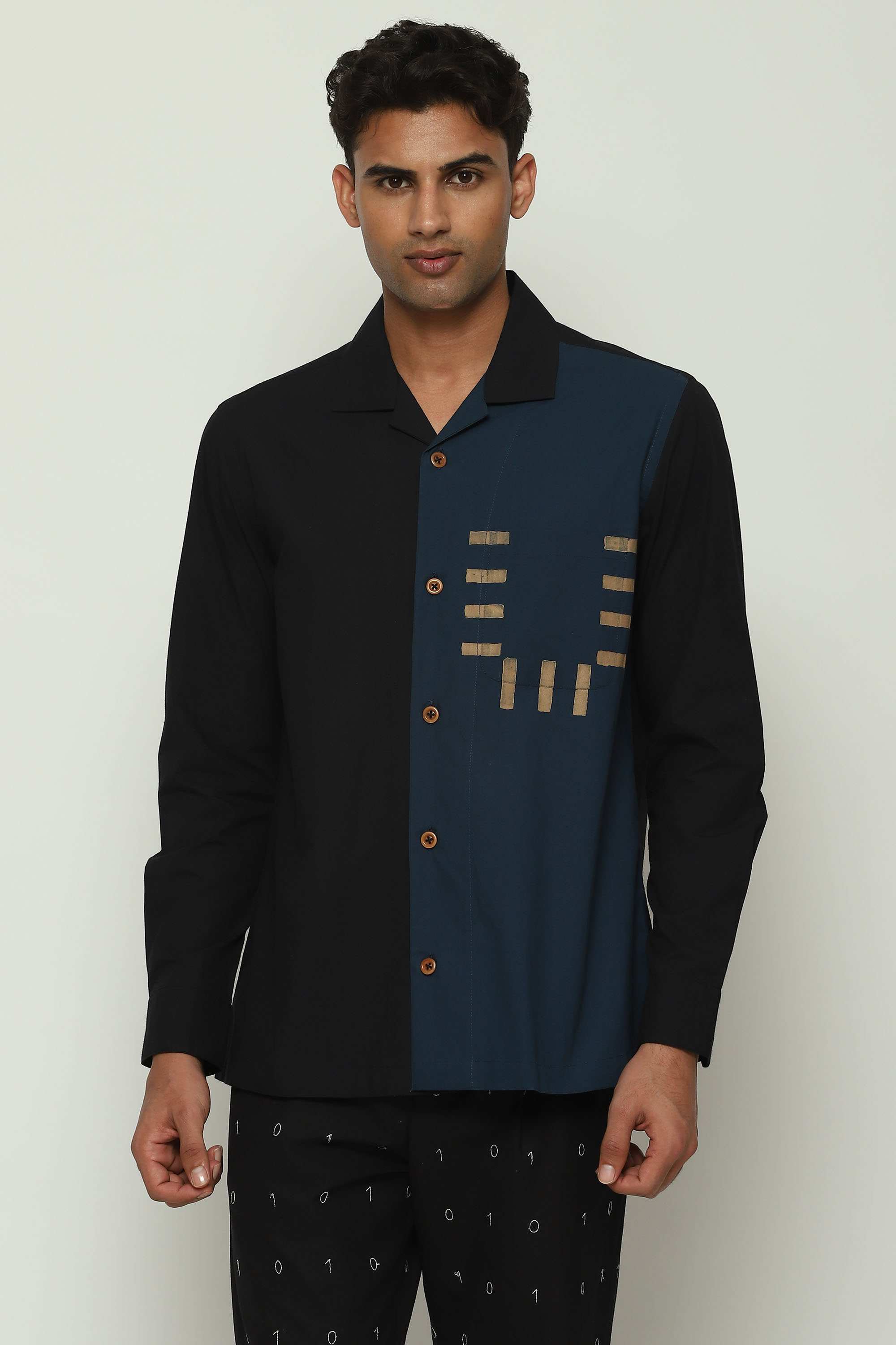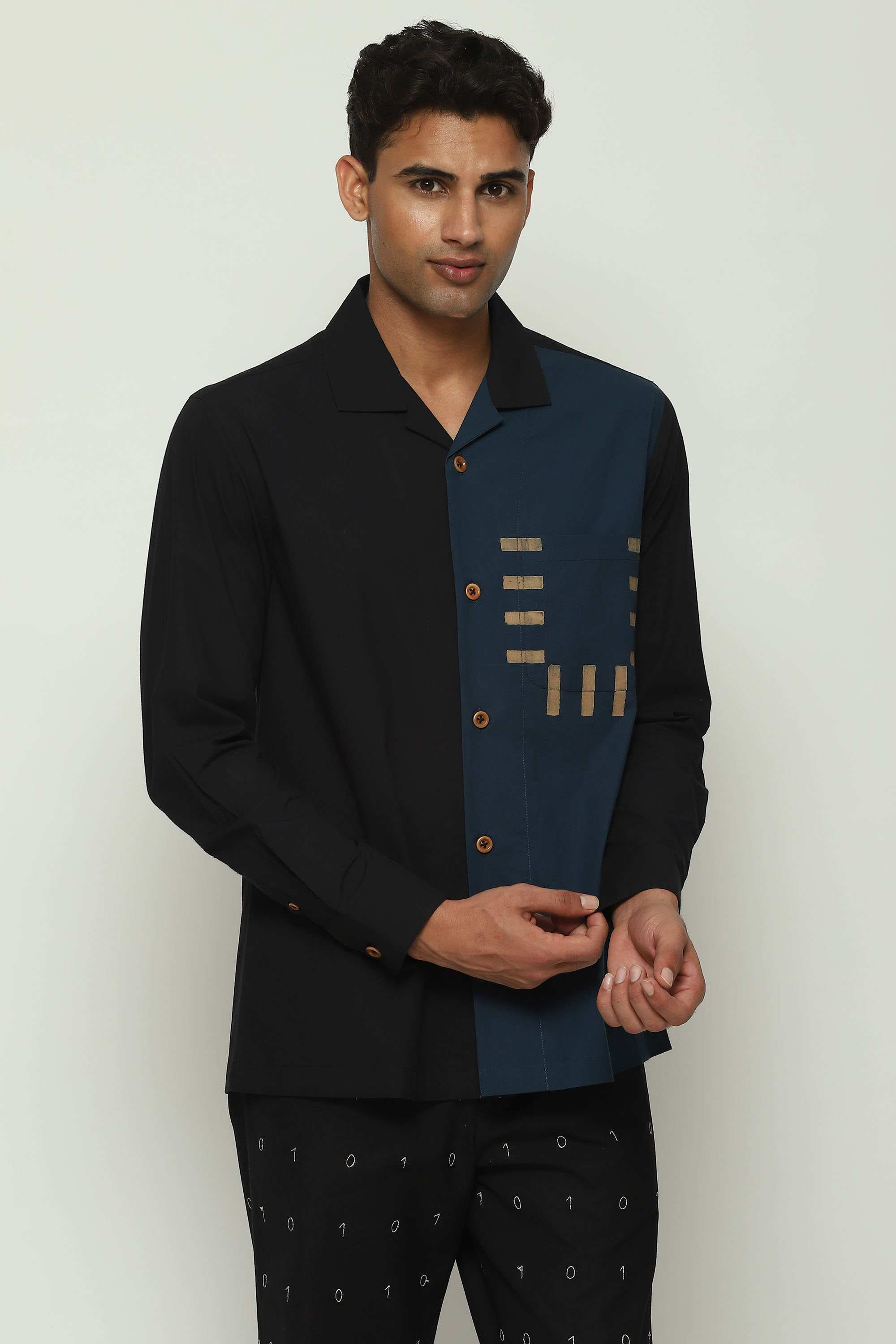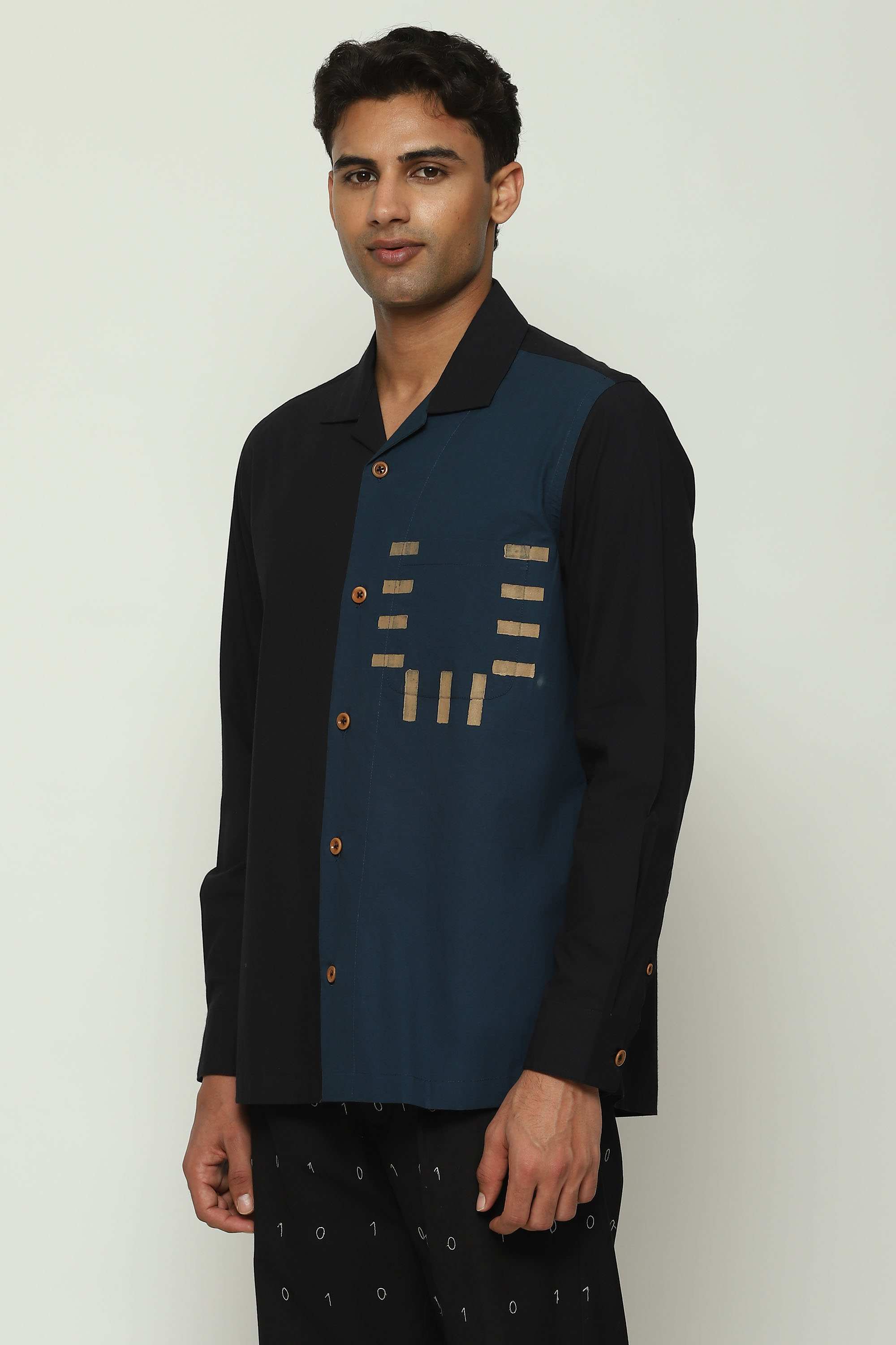 A black and blue shirt. Part of Body Language — a collection that seeks to collapse the binaries of formal and casual — this creation is crafted from cotton and block-printed with arcane symbols. Best paired with idle desire.