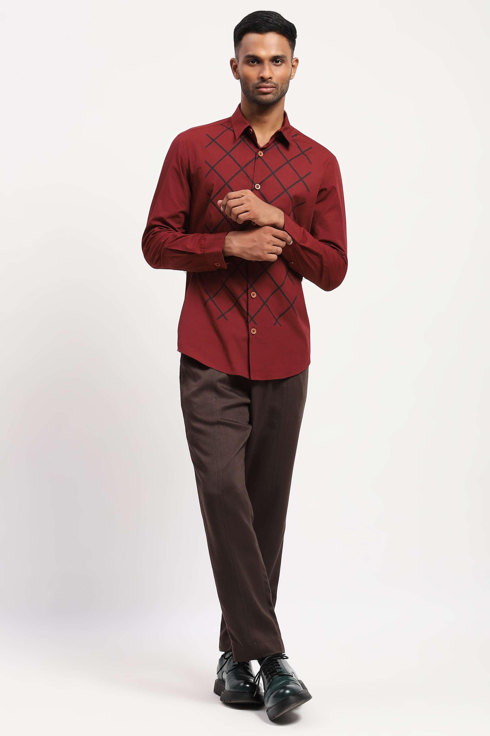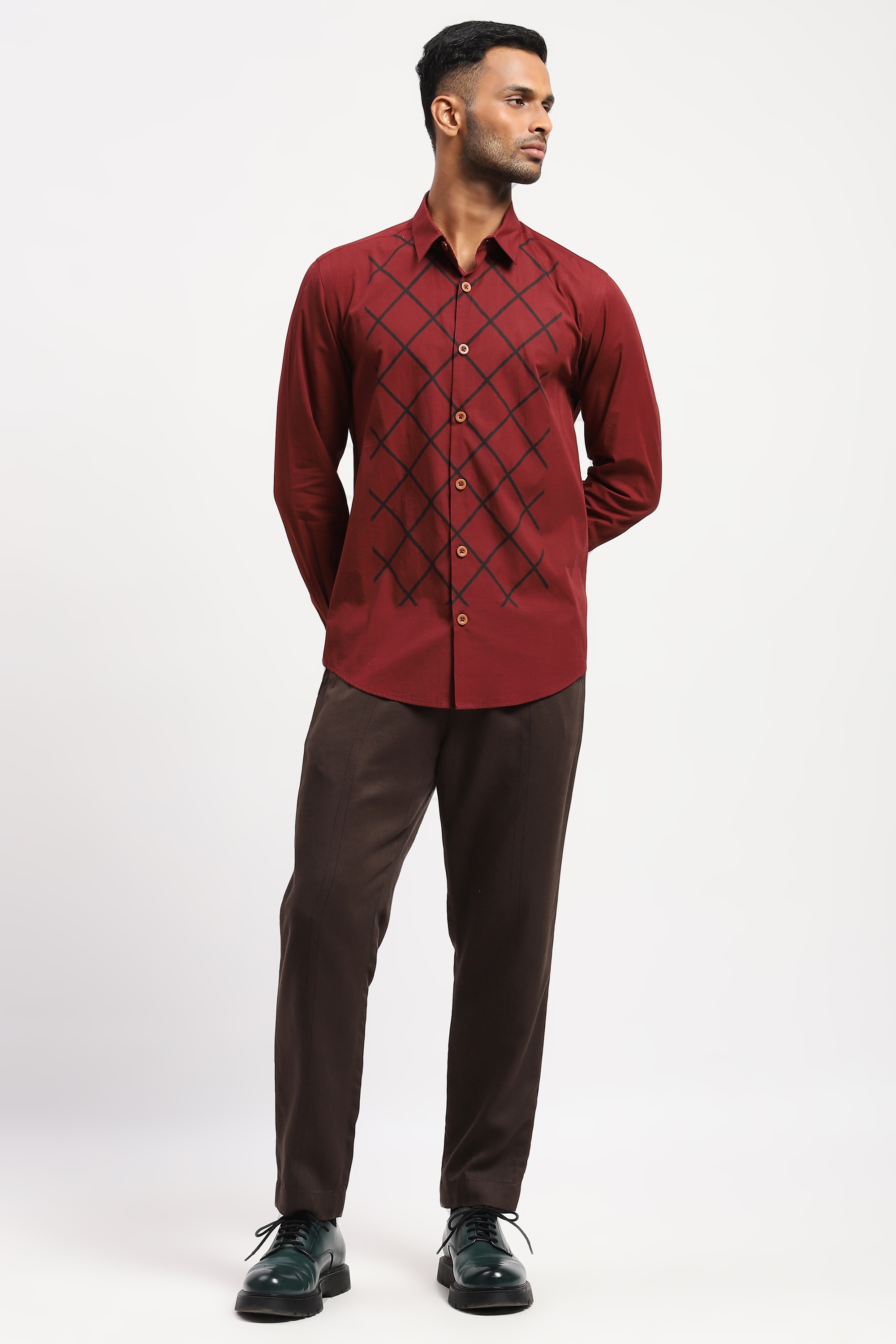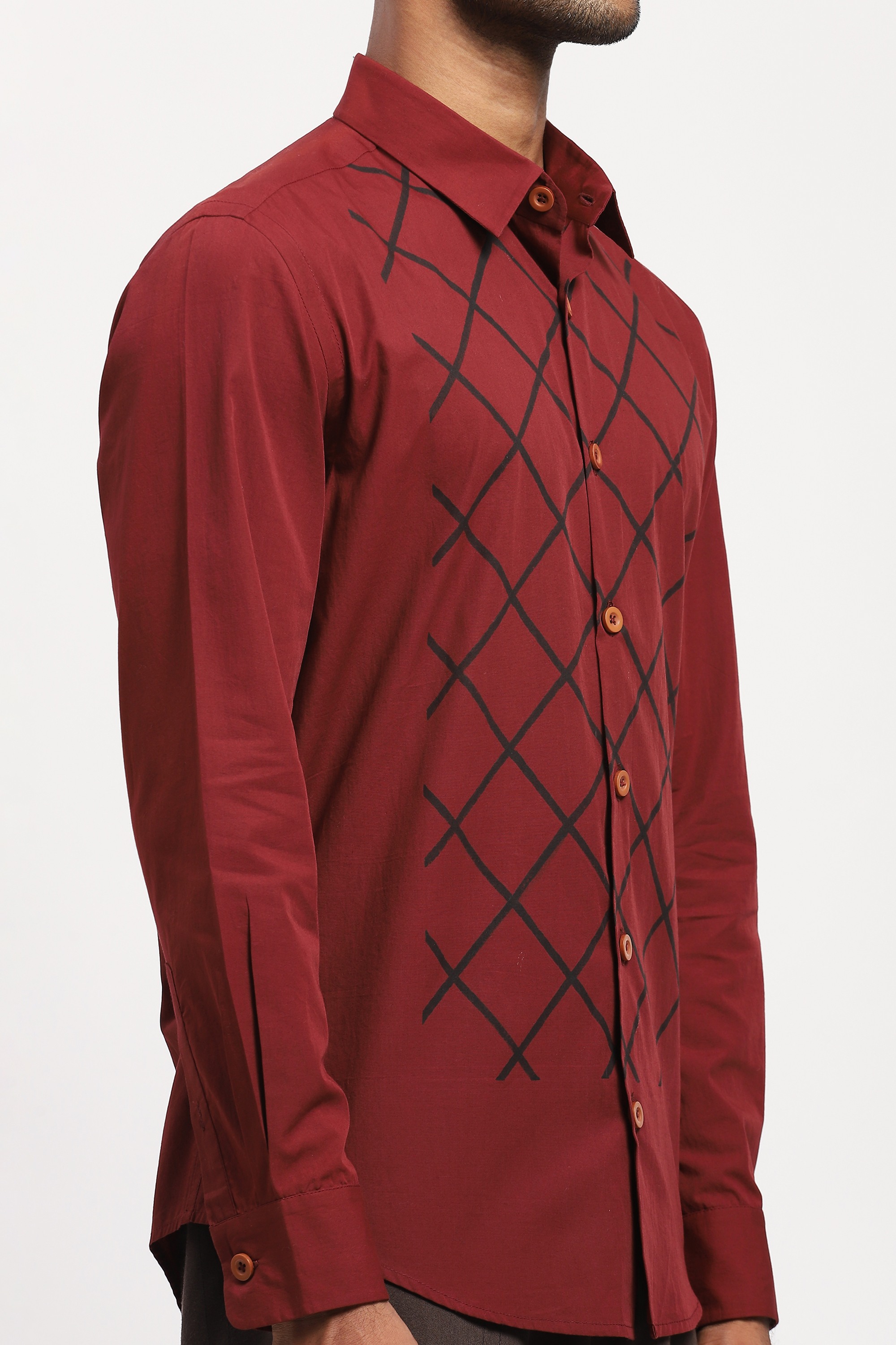 Crafted in 60s poplin, this red shirt is blockprinted with a trellis pattern.