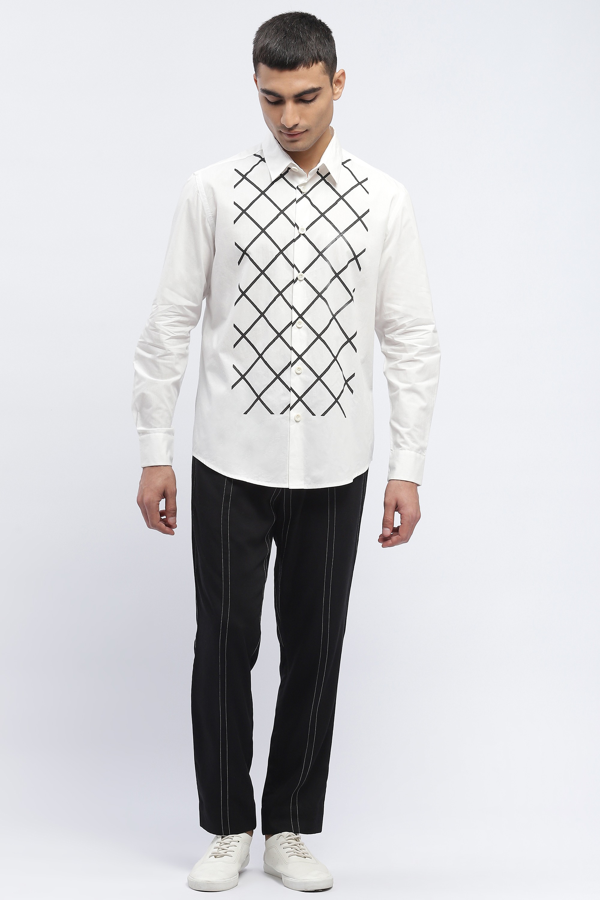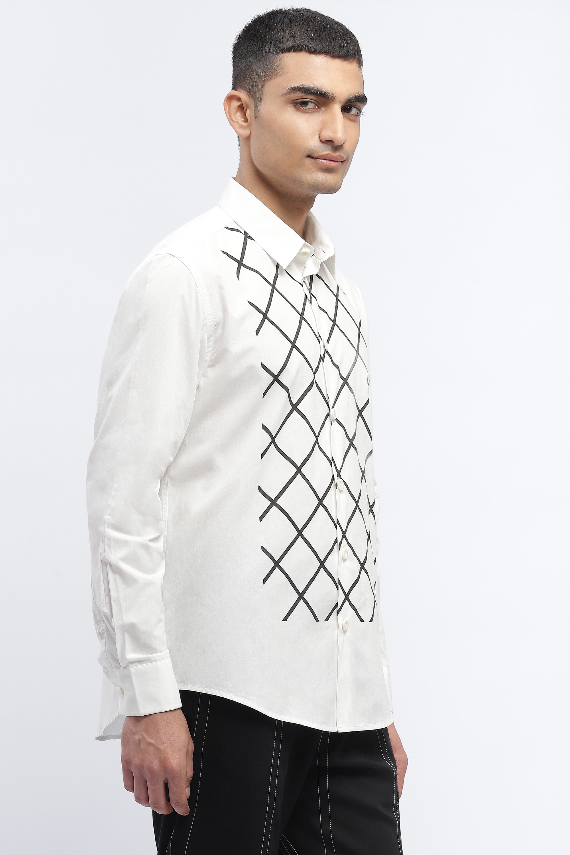 Imagine the intesections. Crafted in 60s poplin, this ivory shirt is blockprinted with a trellis pattern.