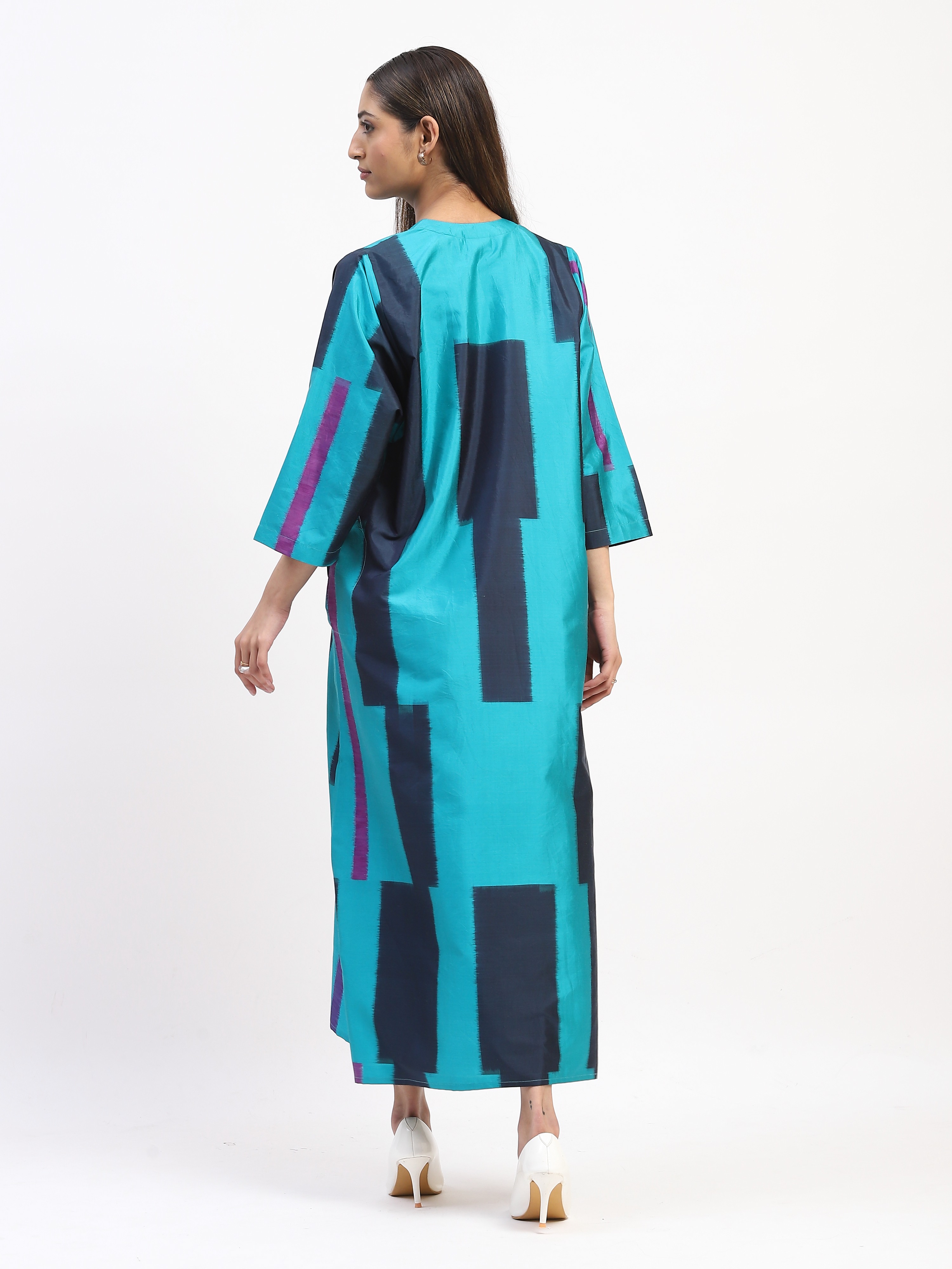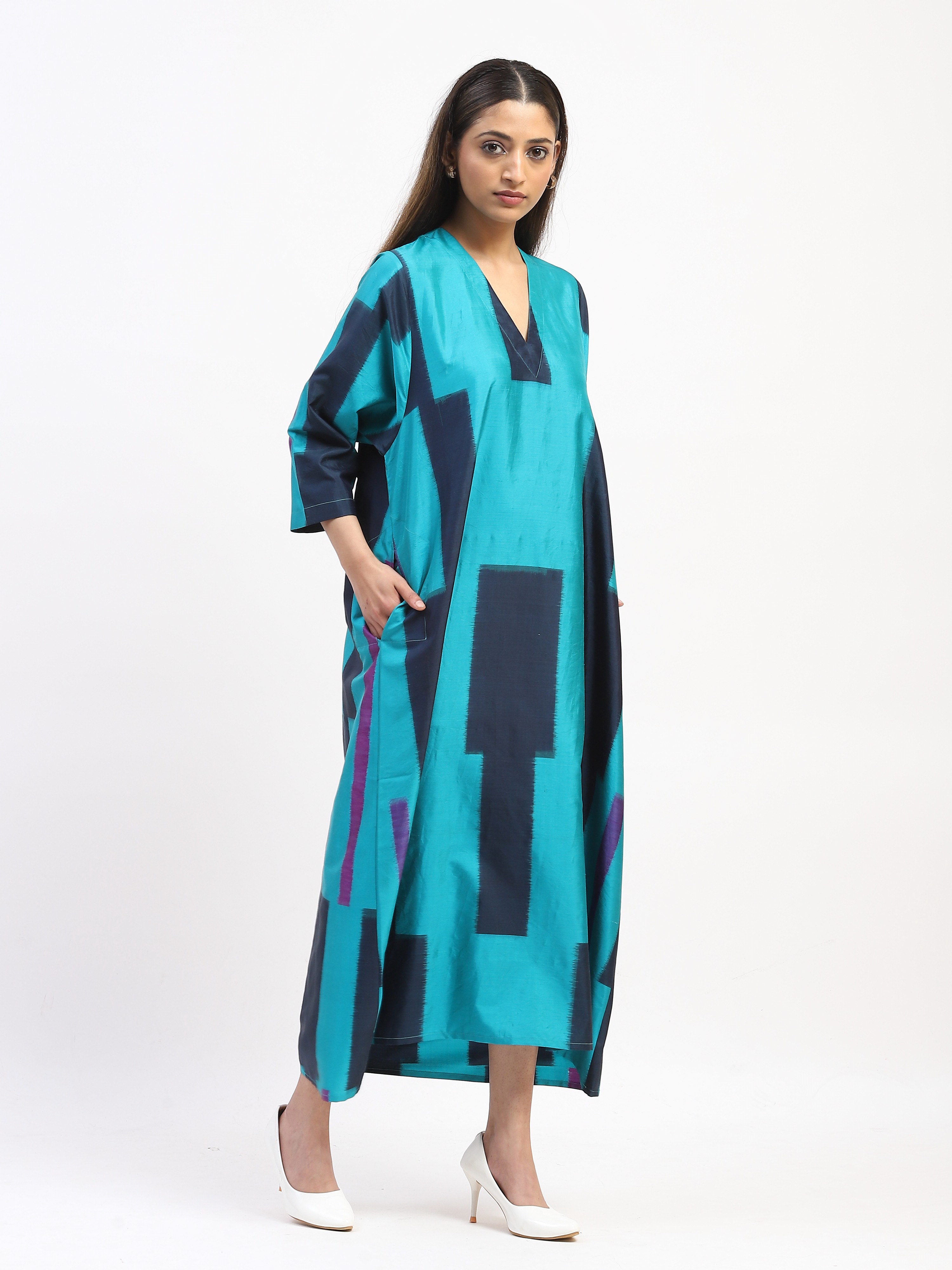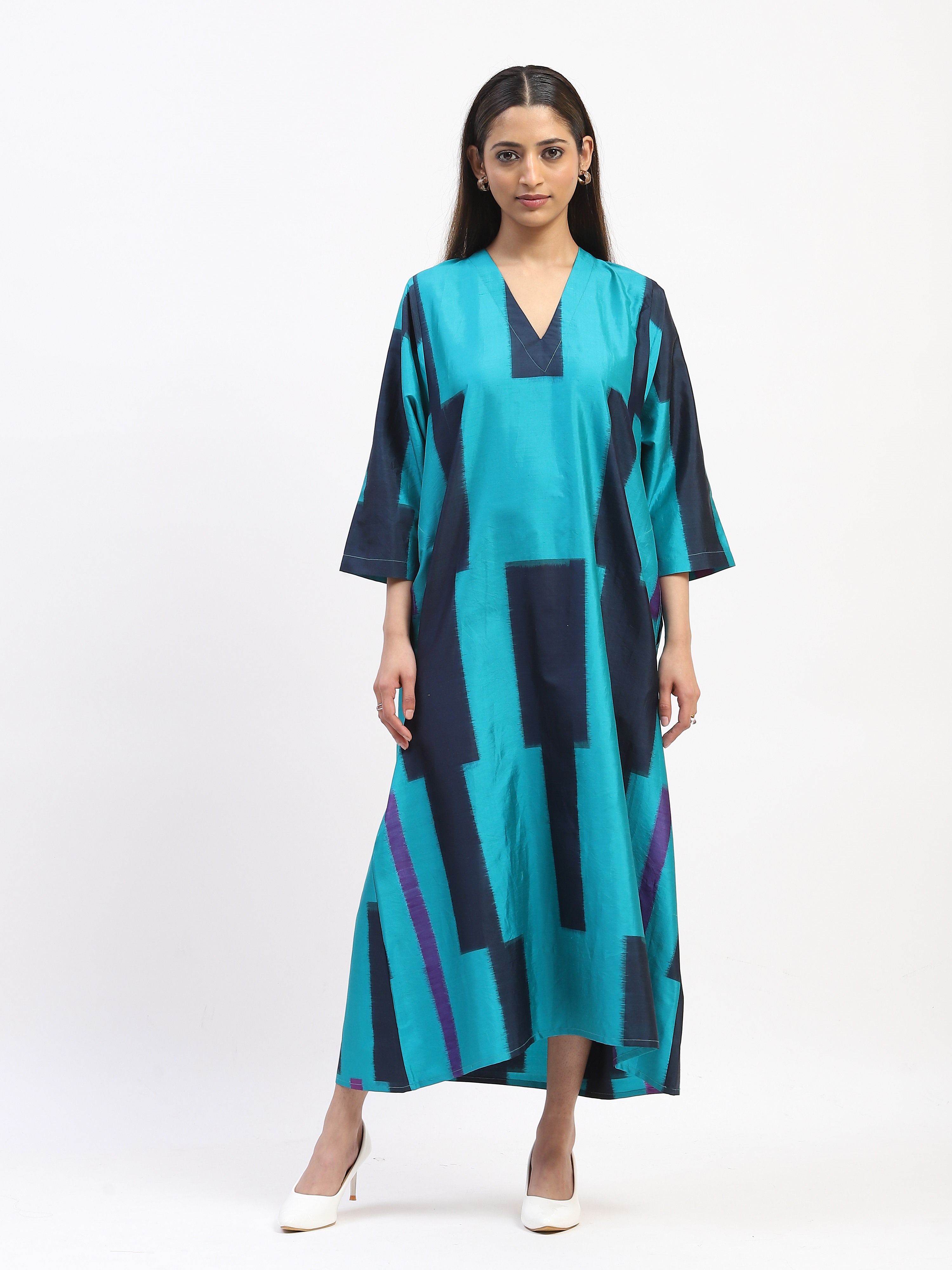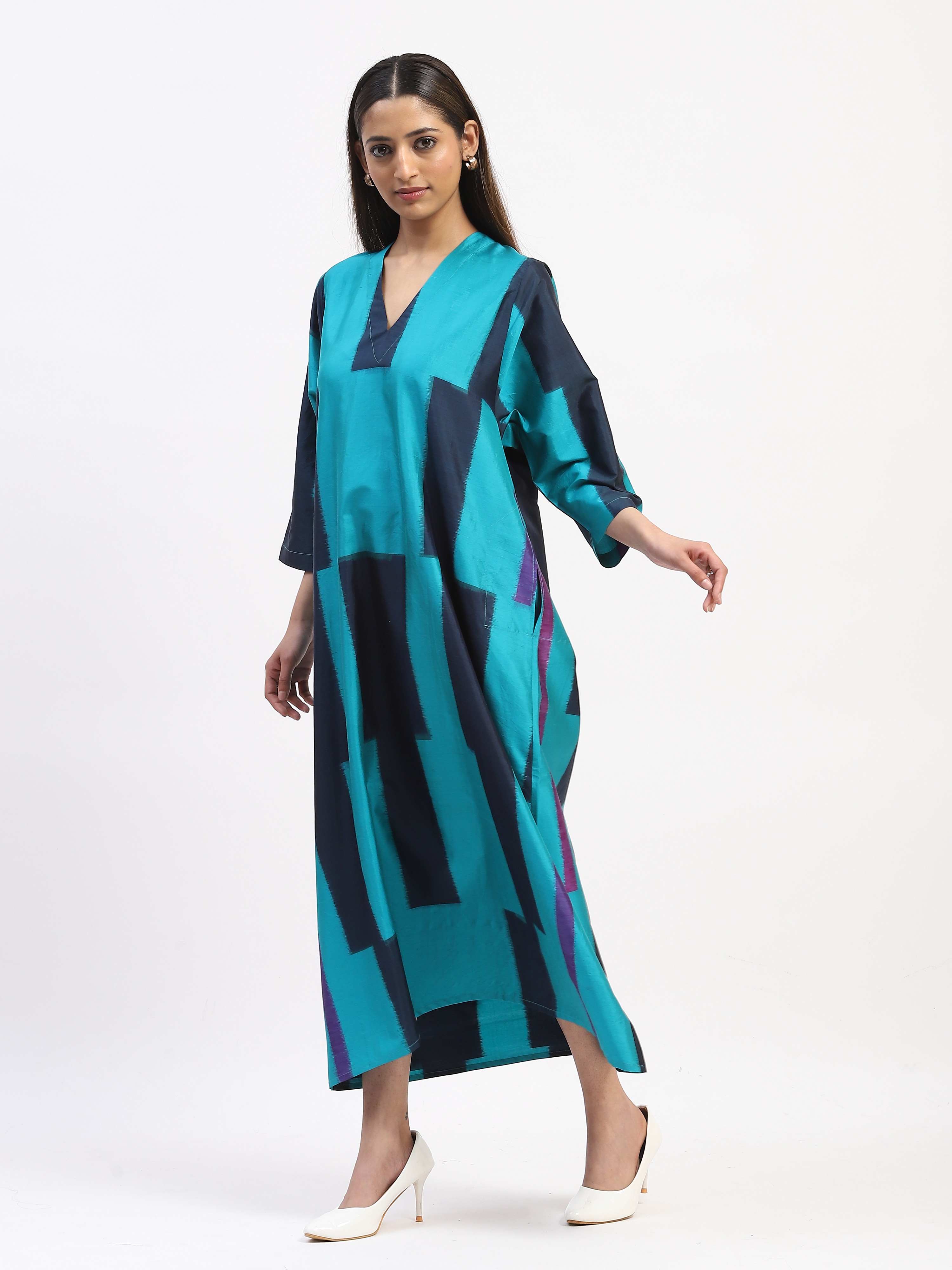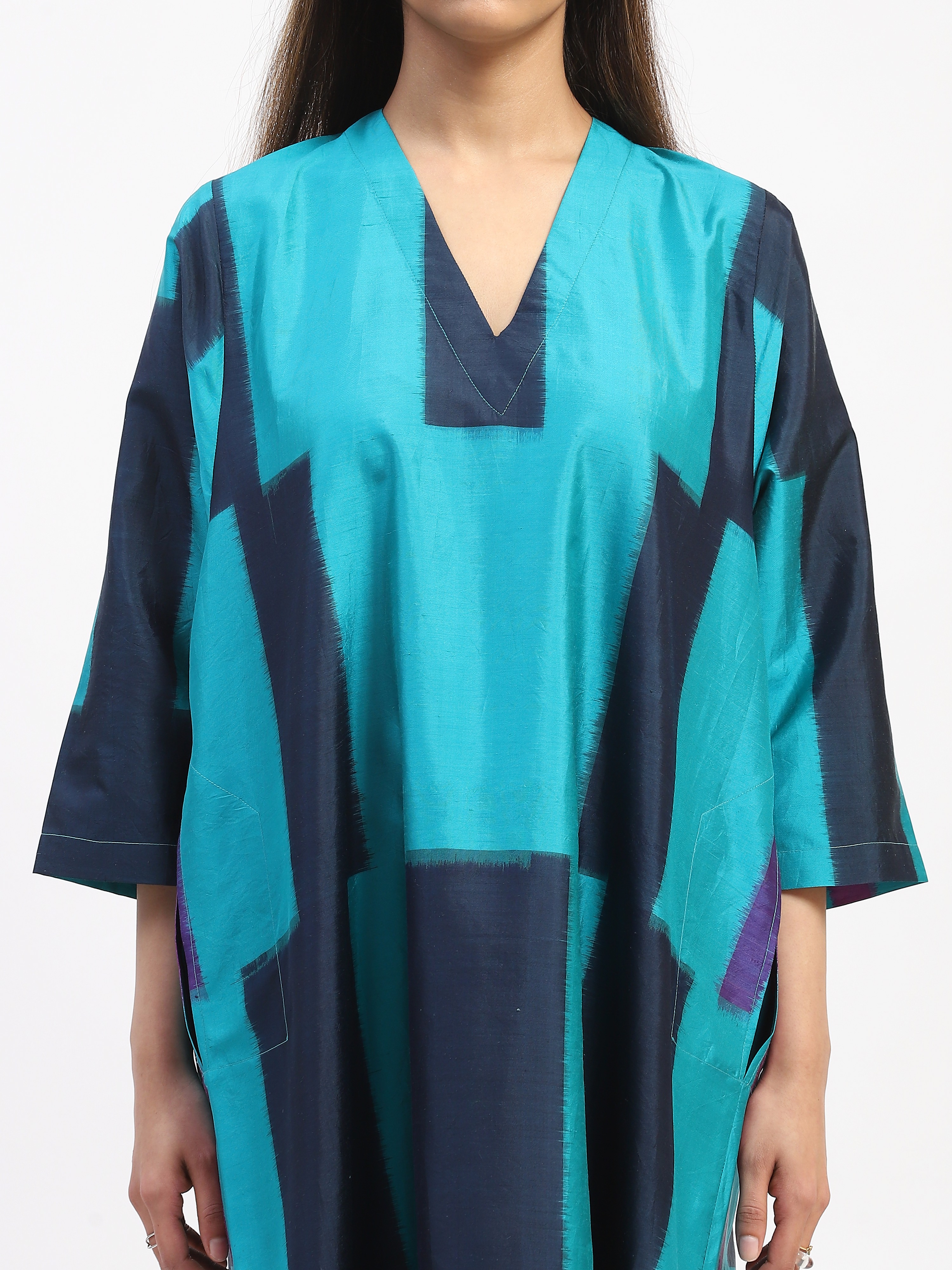 Crafted in luxurious silk, this piece features an intricate form of ikat where both weft and warp of the weave are tie-dyed with distinct patterns.
