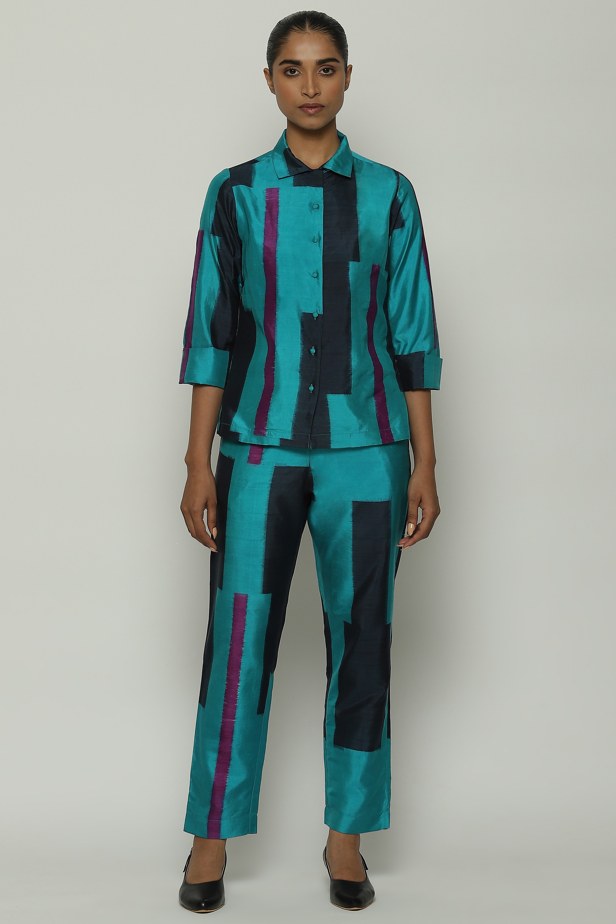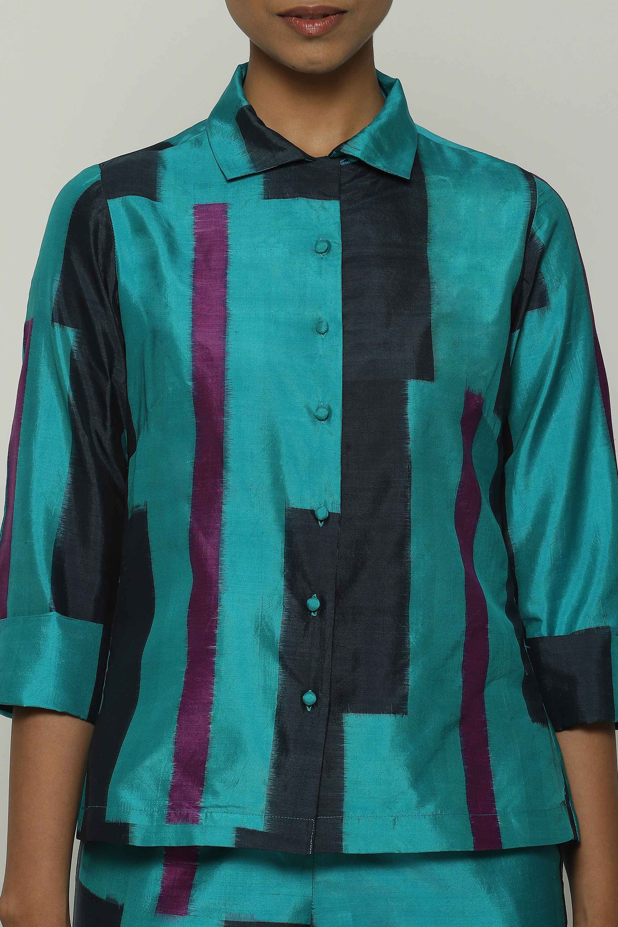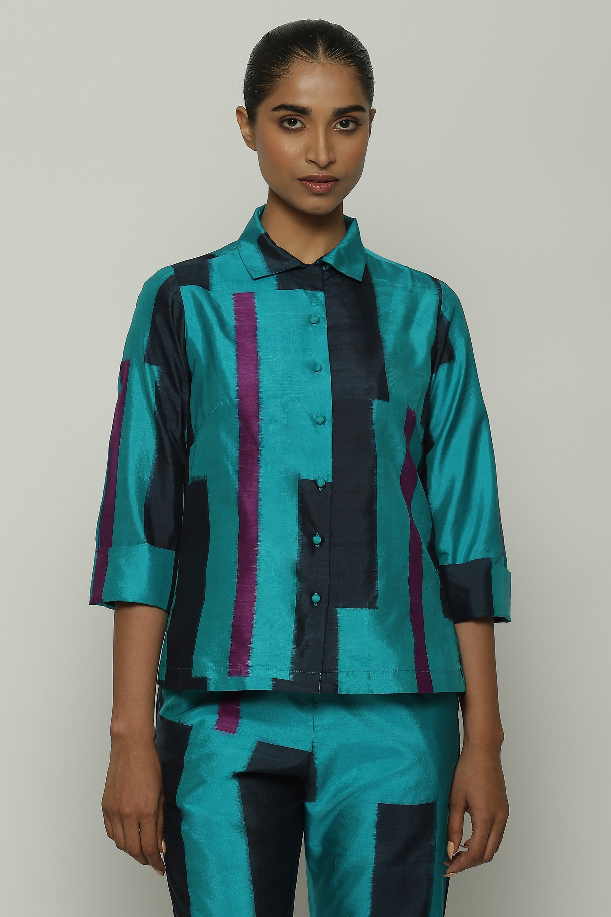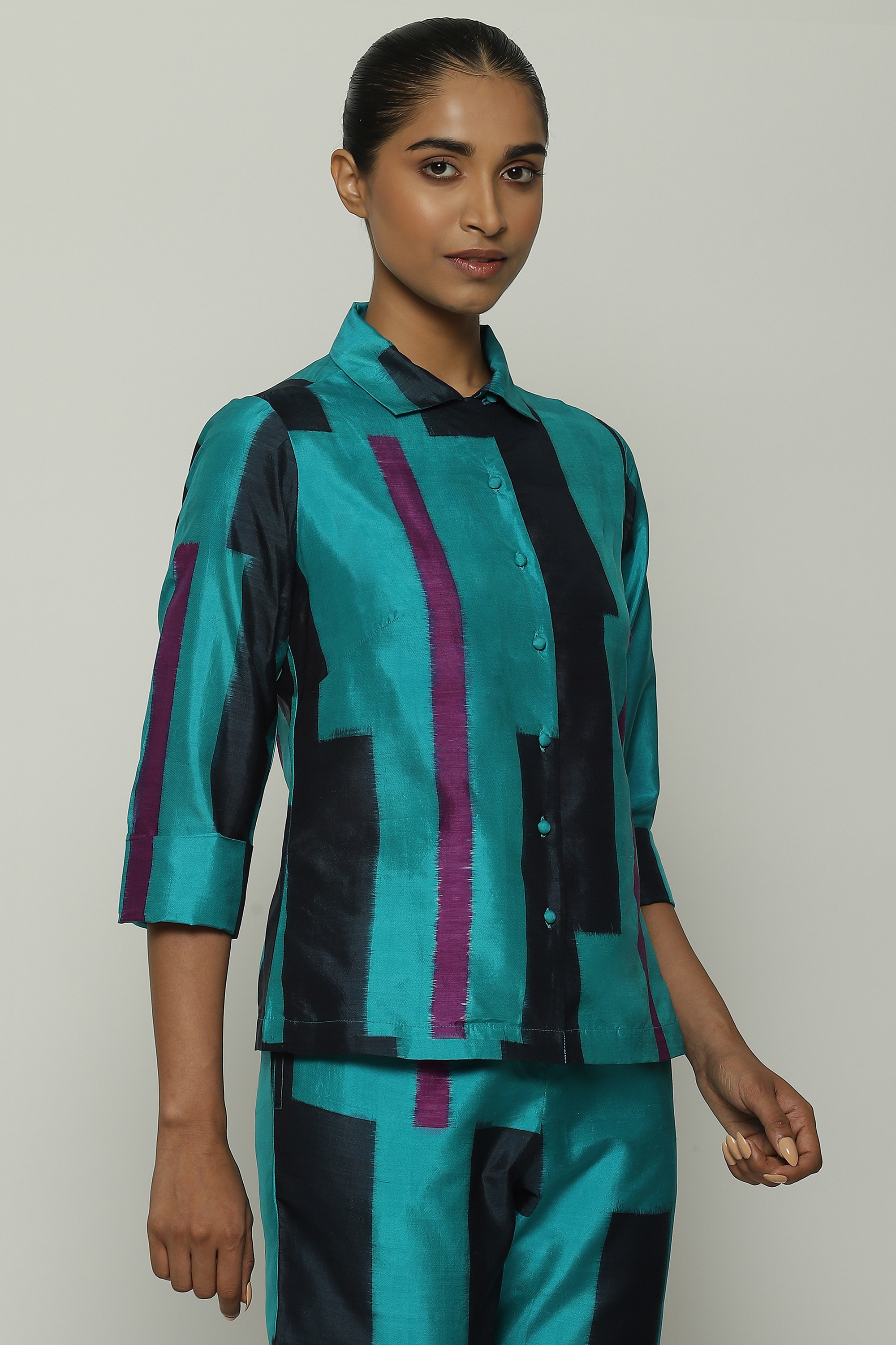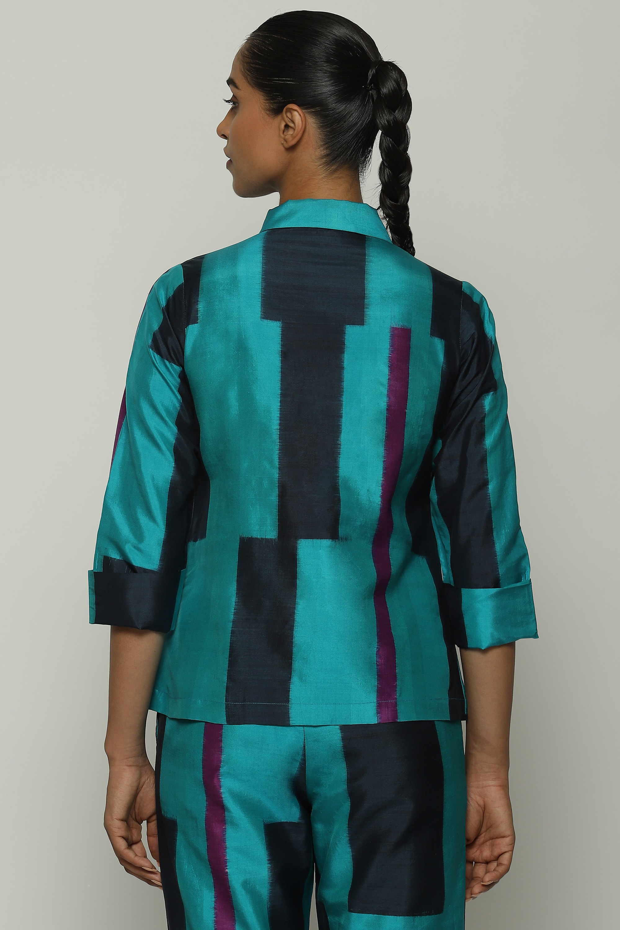 Crafted in luxurious silk, this piece features an intricate form of ikat where both weft and warp of the weave are tie-dyed with distinct patterns.