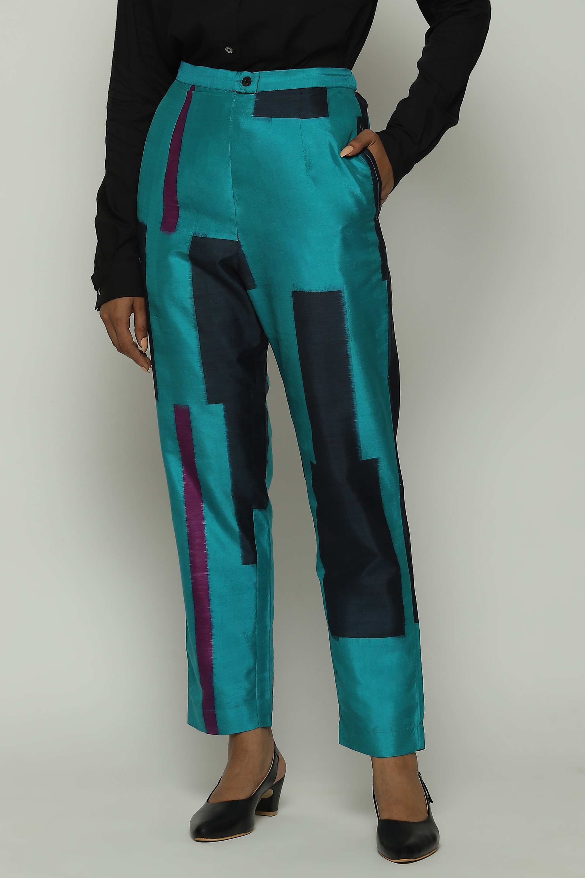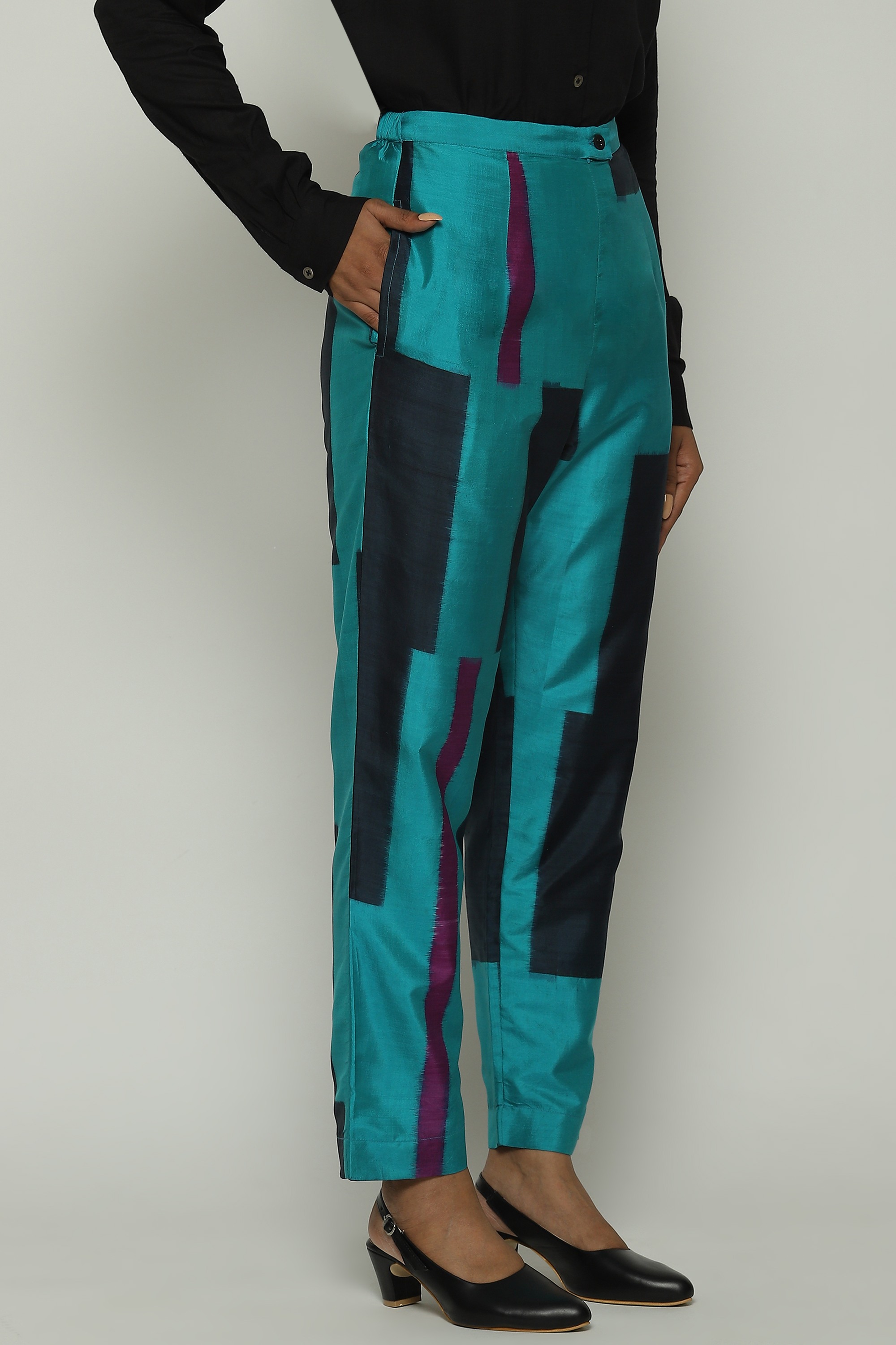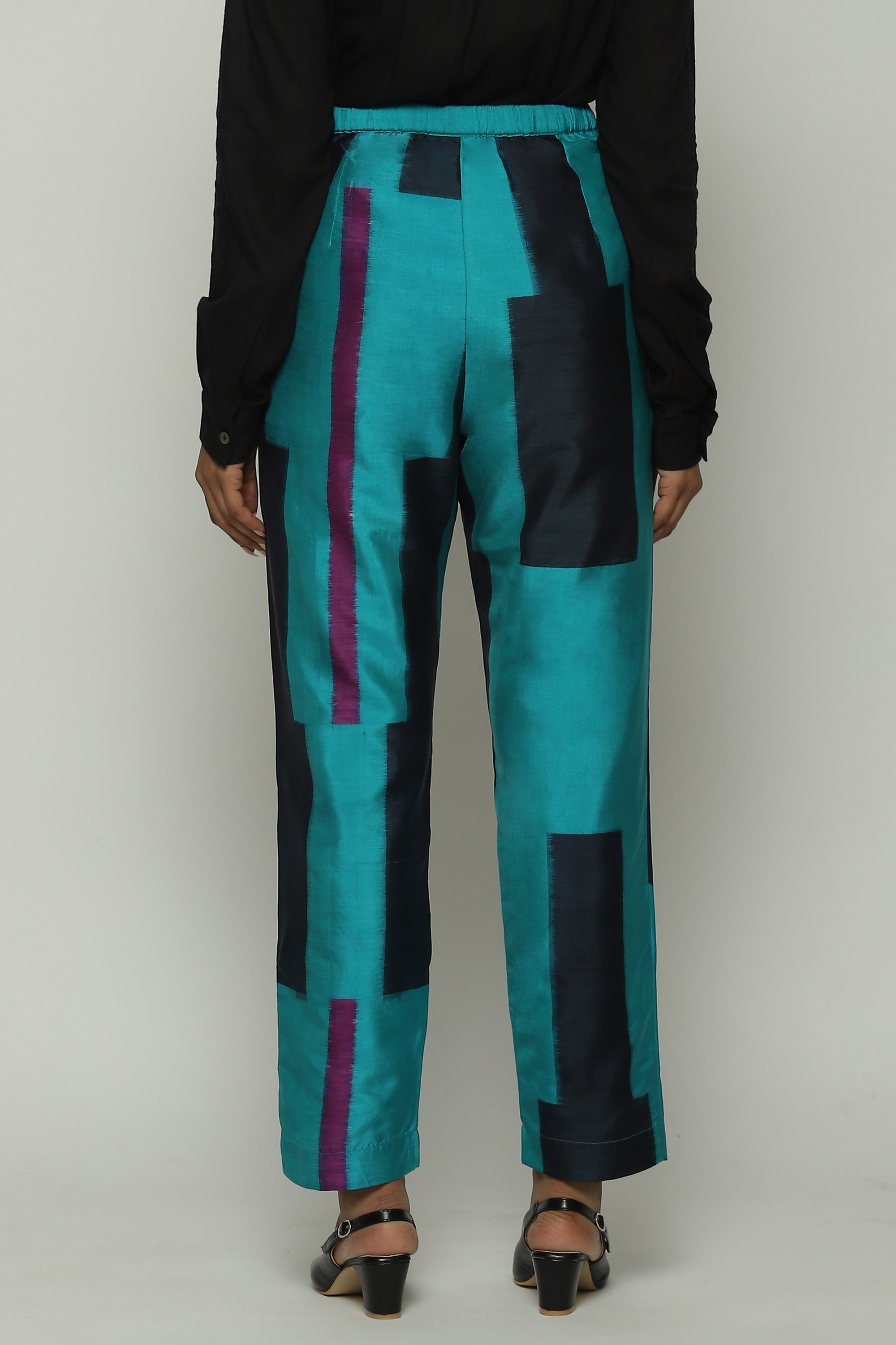 A pair of blue tapered pants dyed in double ikat.
