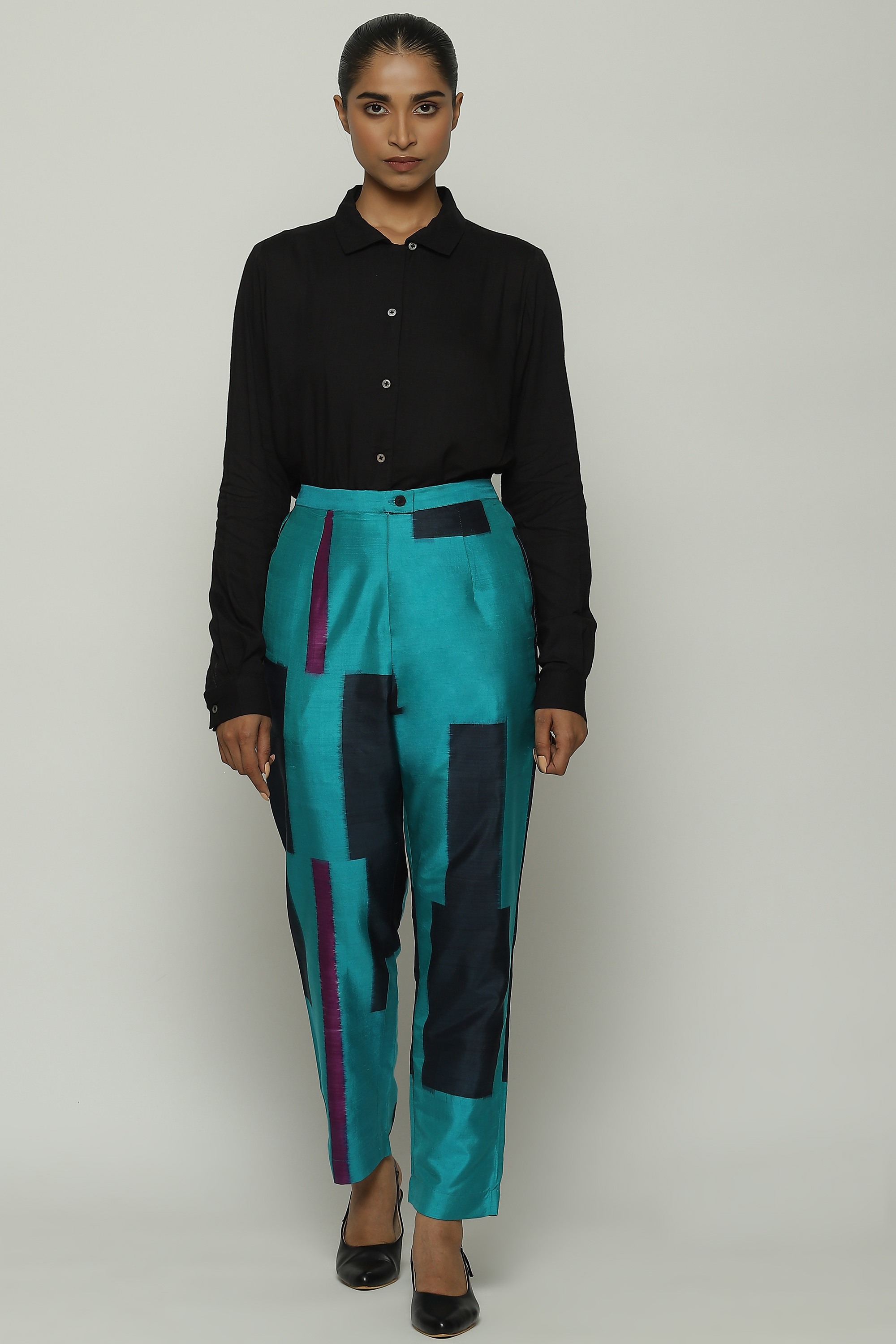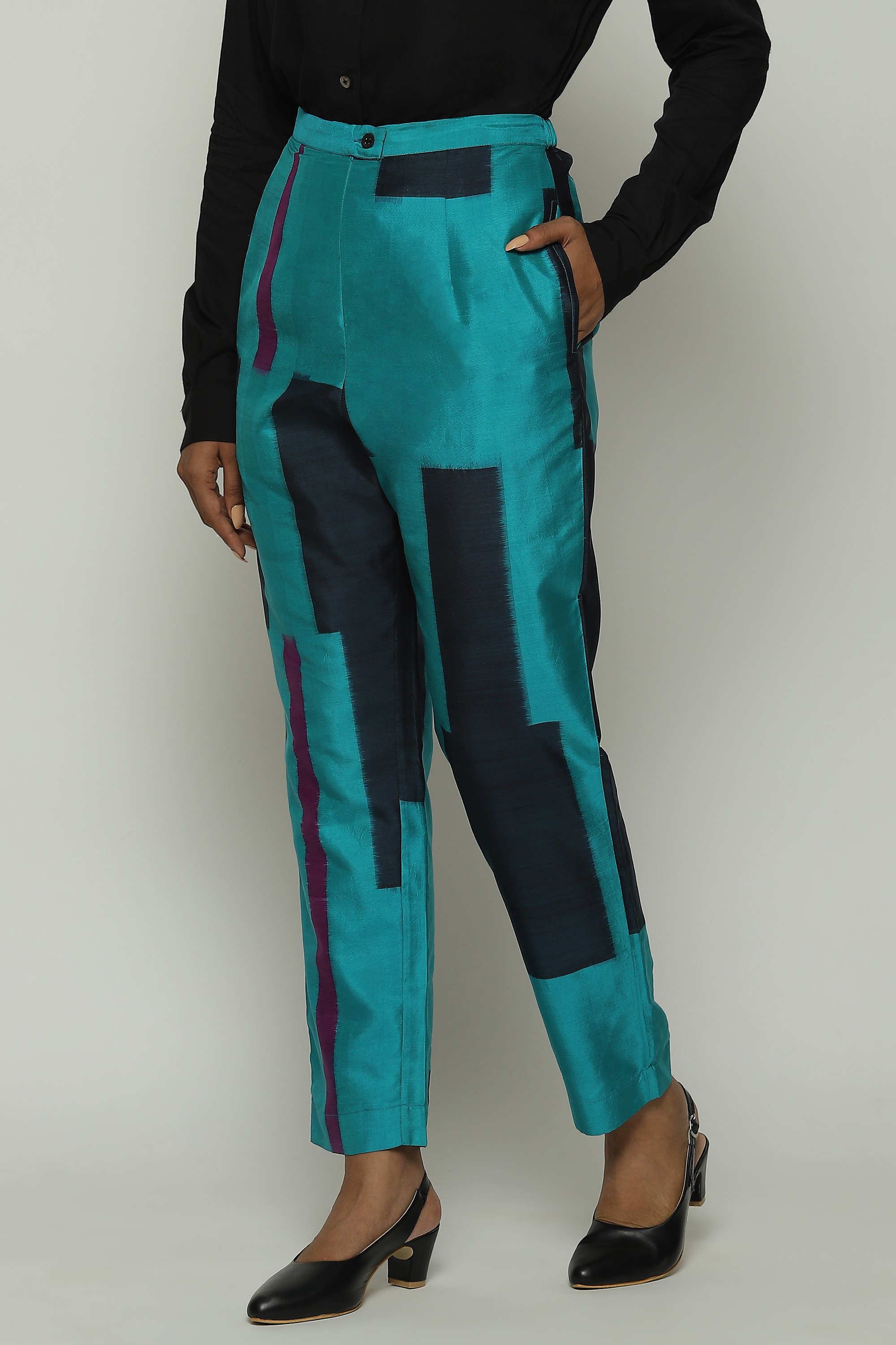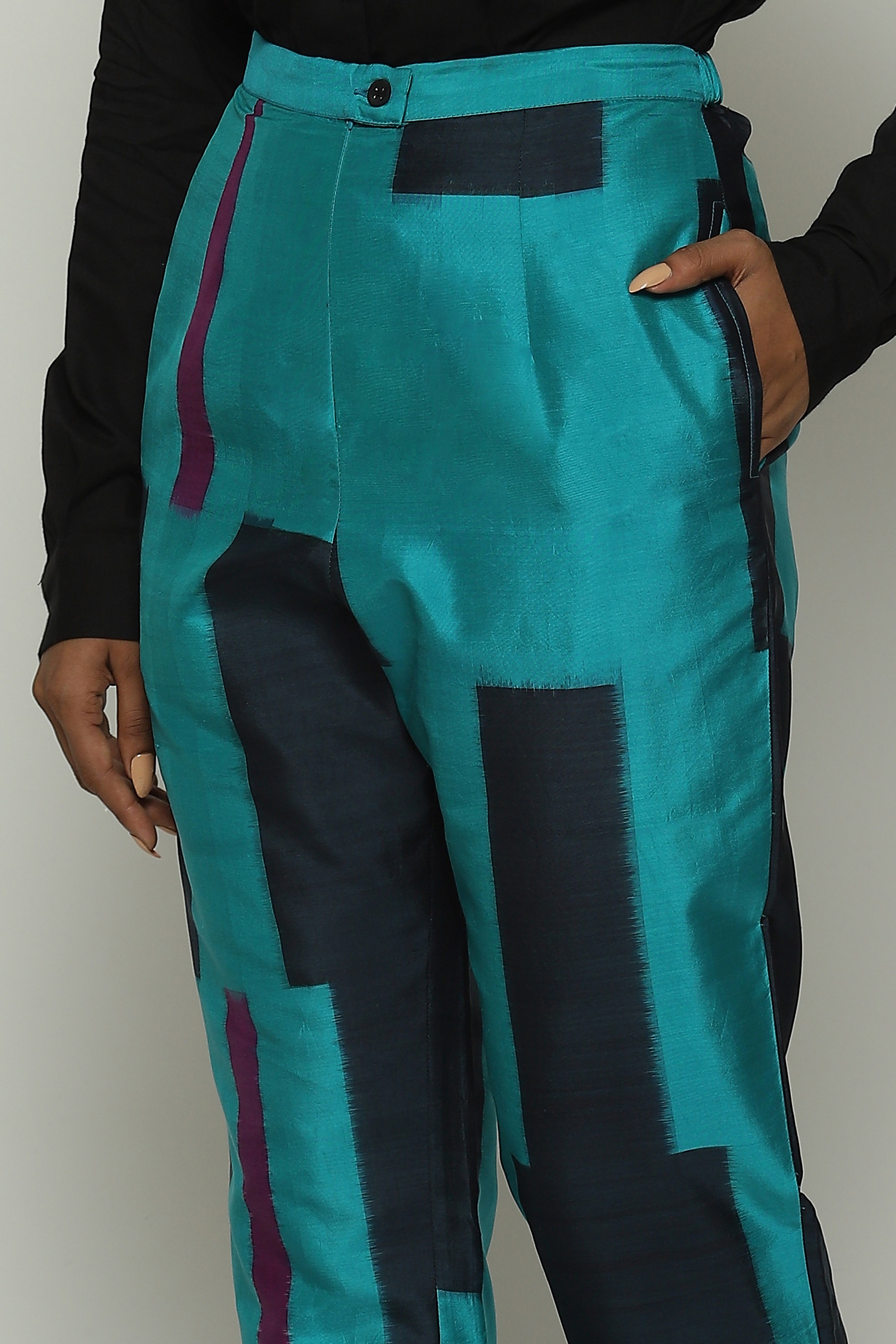 A pair of blue tapered pants dyed in double ikat.