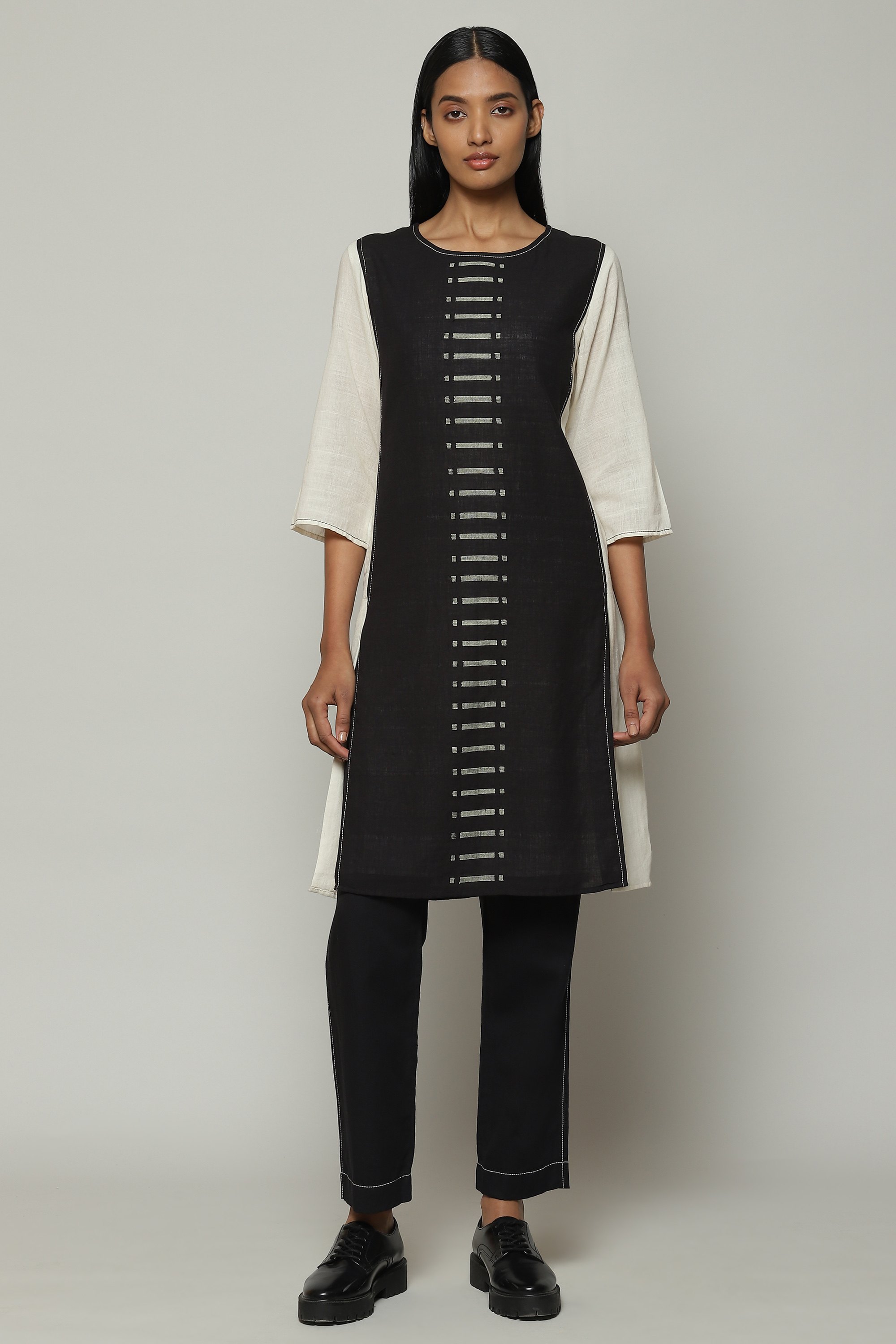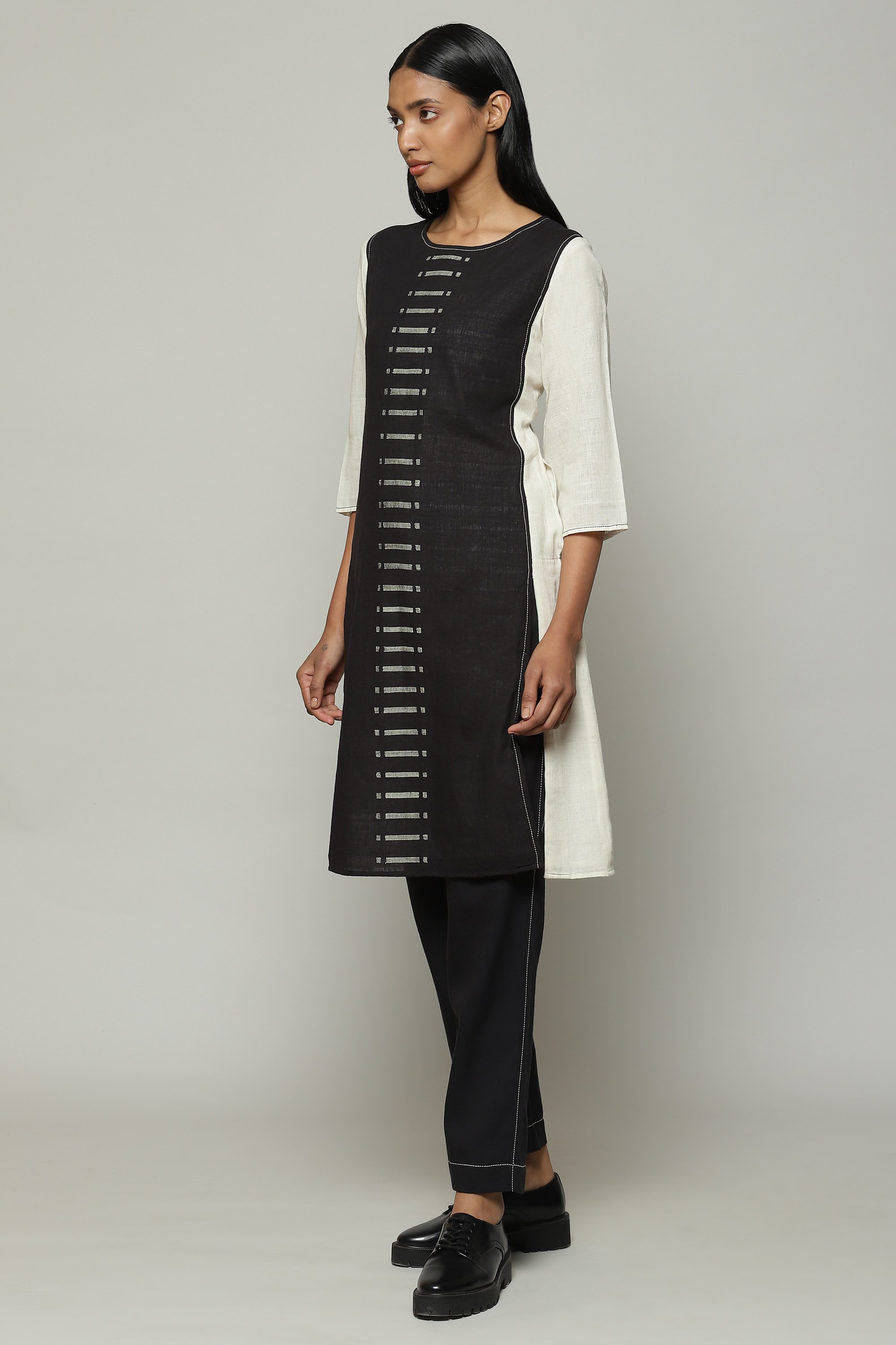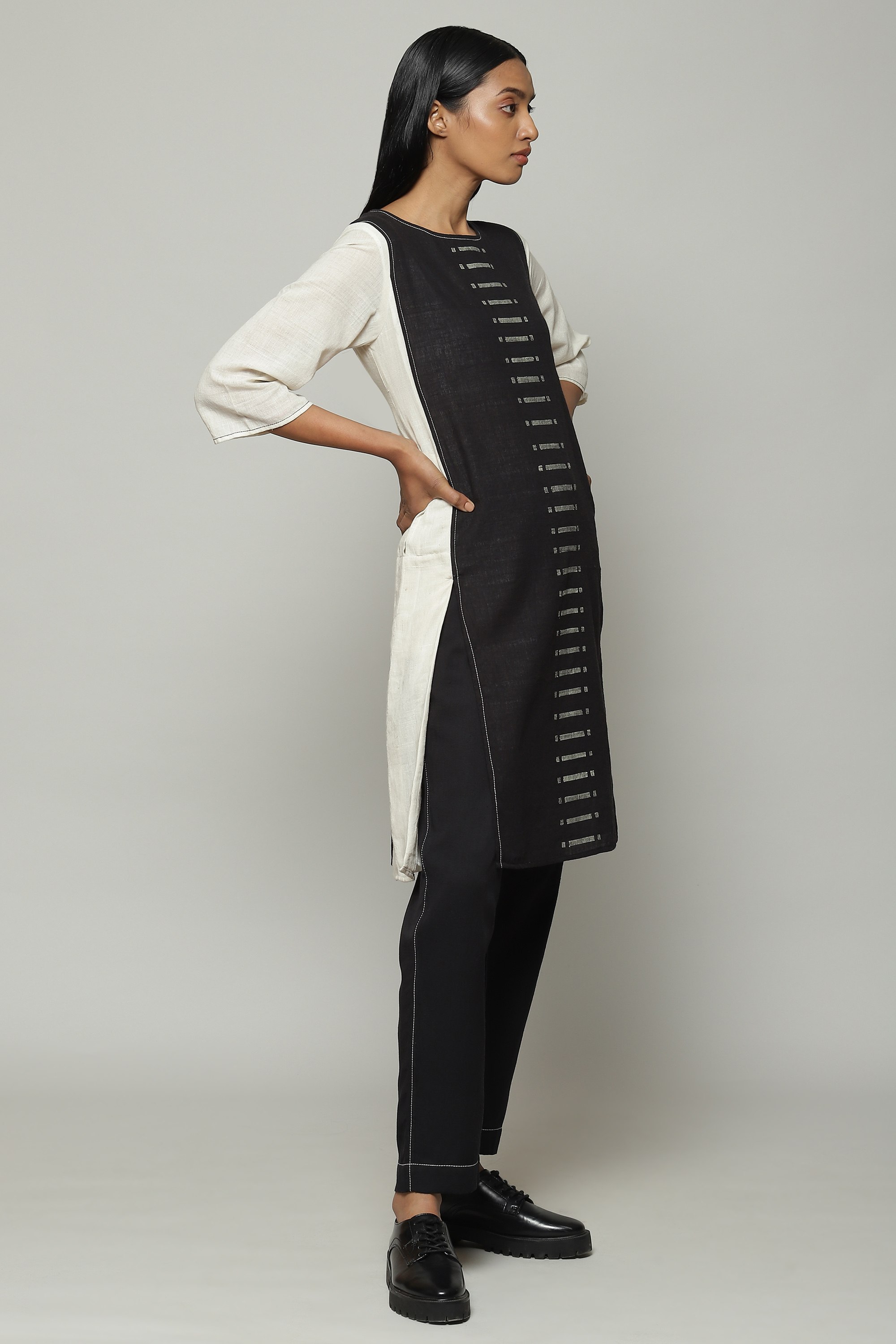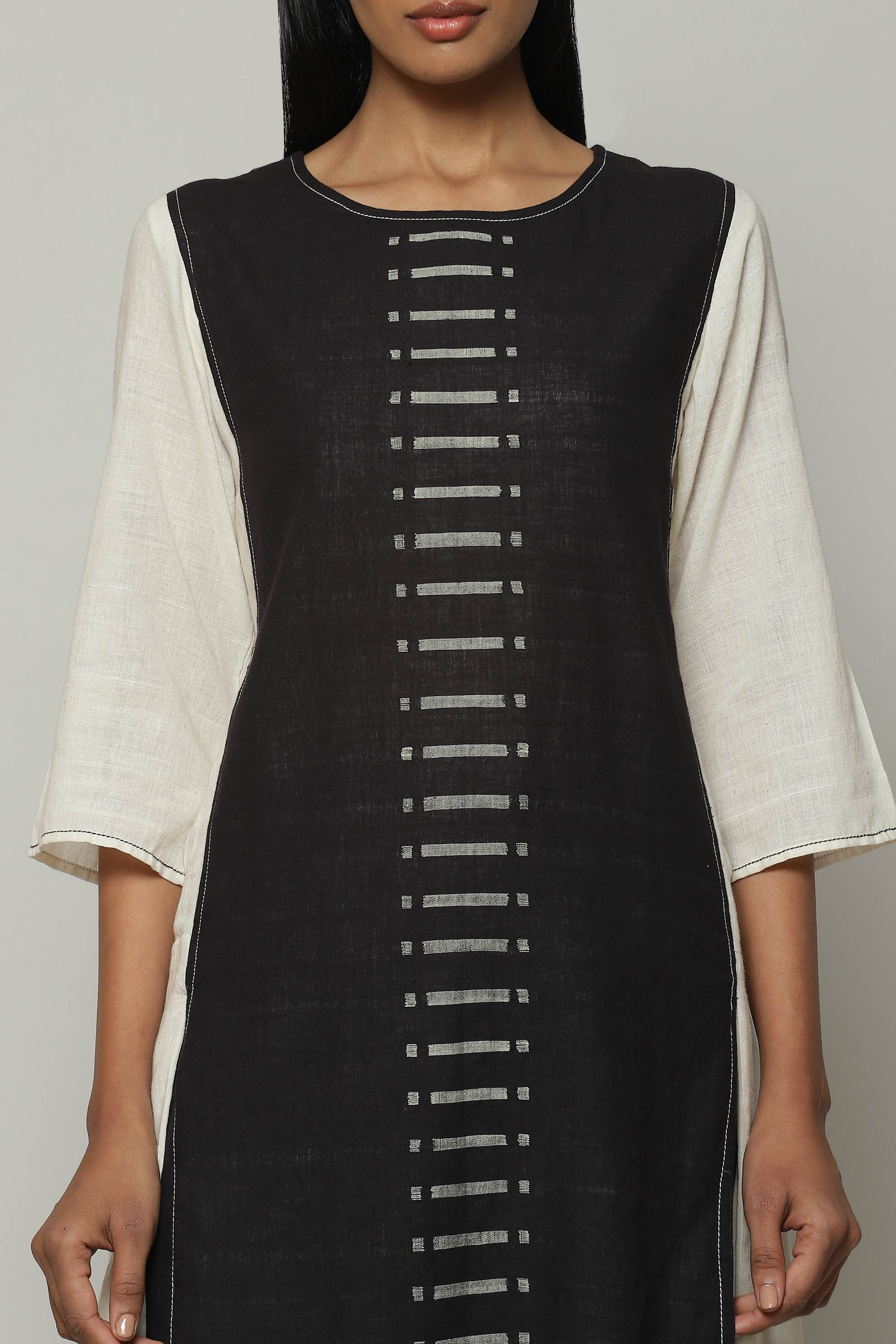 Cotton kurtas are eternal. This ivory and black piece is certainly no different. Woven with a love only reserved for the rarest, the kurta goes a little extra. Its elegant cotton inlay features silk worked into the weft using the kuppadam technique from Andhra Pradesh. Kuppadam commonly appears on beautiful sarees, and has been applied here to embellish the kurta. The result is an understated work of art.
