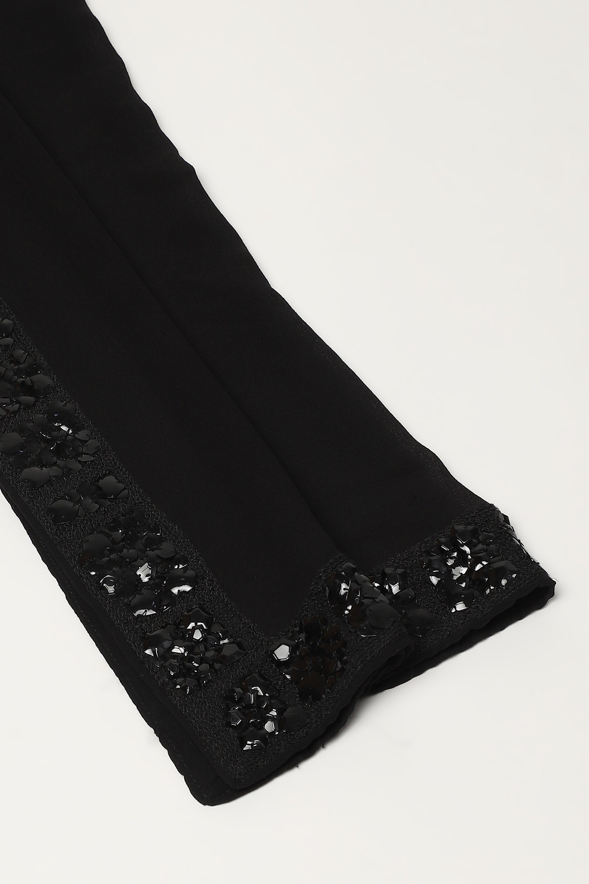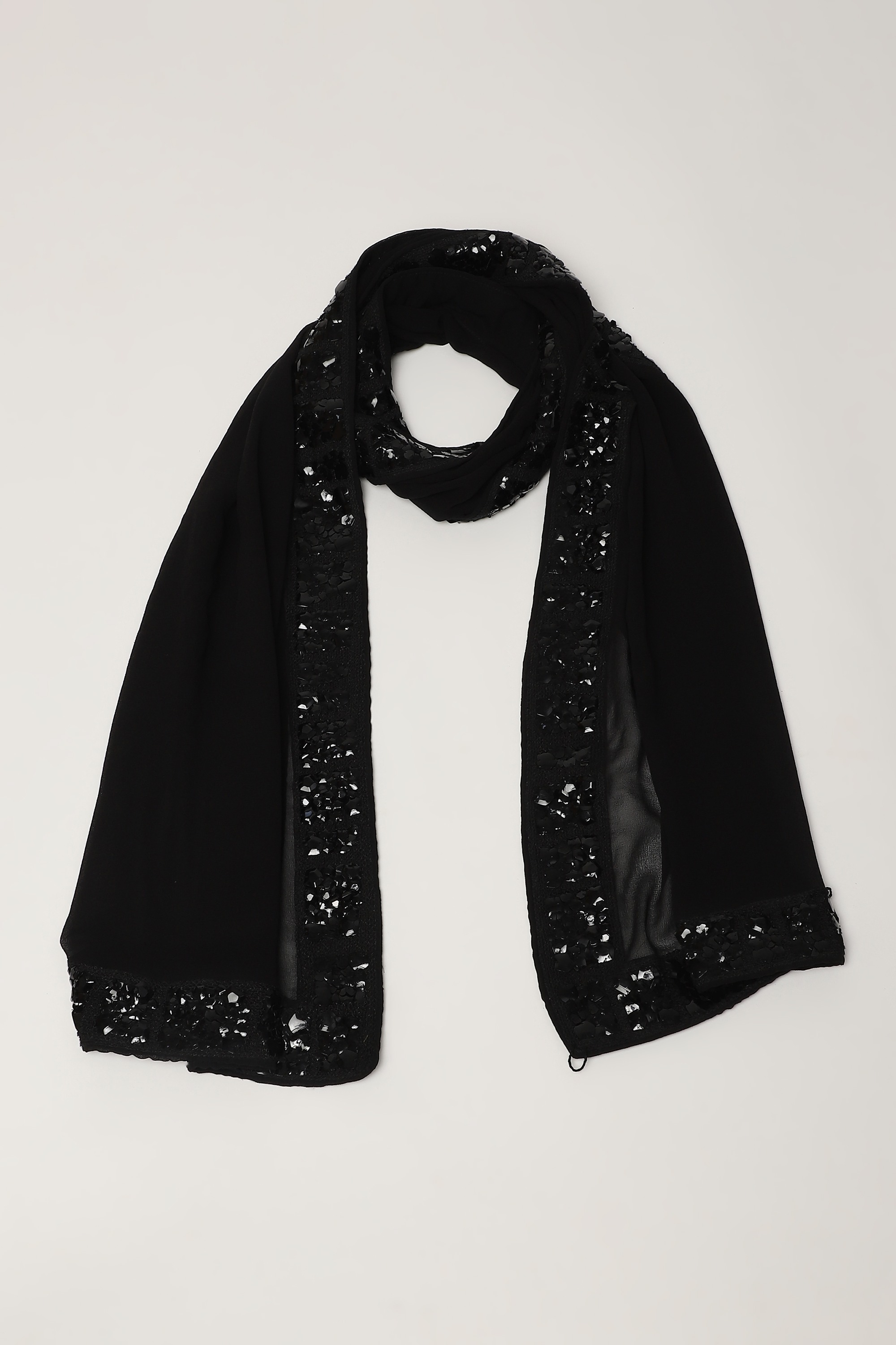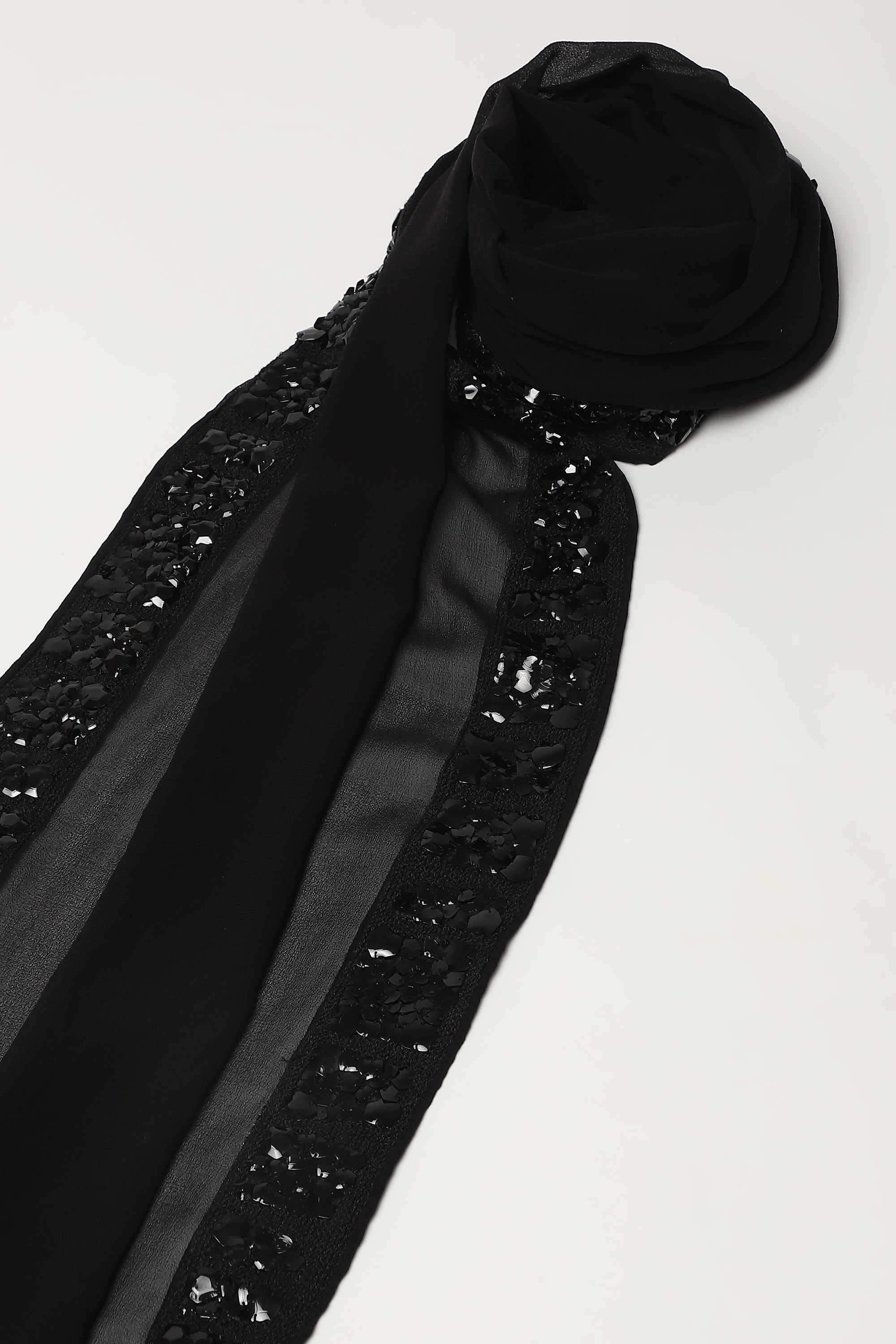 A black scarf adorned in geometric patterns of dori, beads and French-cut sequins.