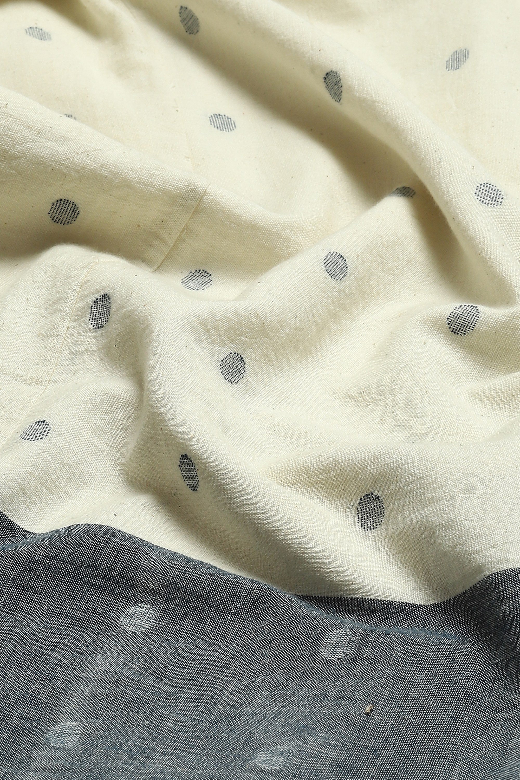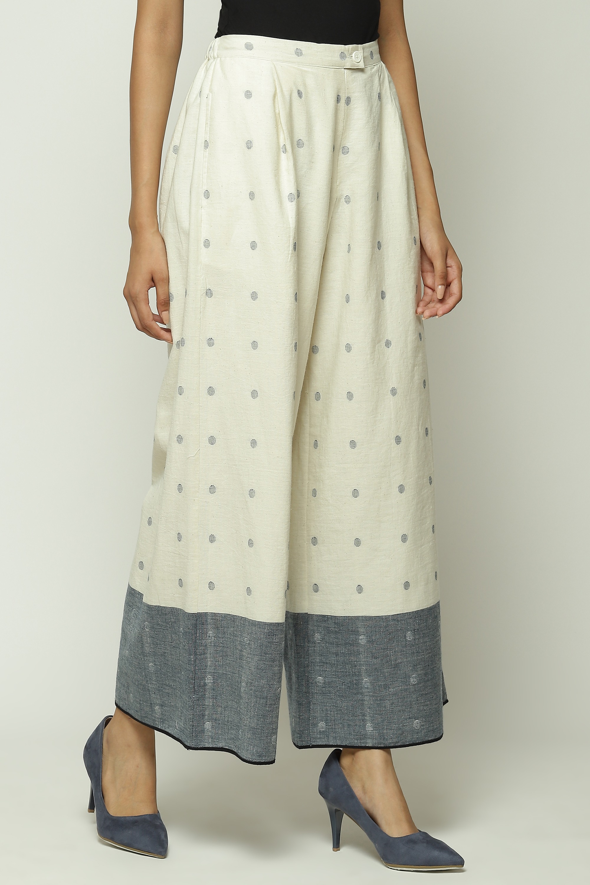 An ivory pair of palazzo pants with navy borders, punctuated with full stops. Body Language — from Abraham & Thakore — explores the building blocks of language on fabric. The patterns on this creation are woven into the cotton itself using the Jamdani technique. While we love it with its co-ord set, this creation pairs well with any ensemble.