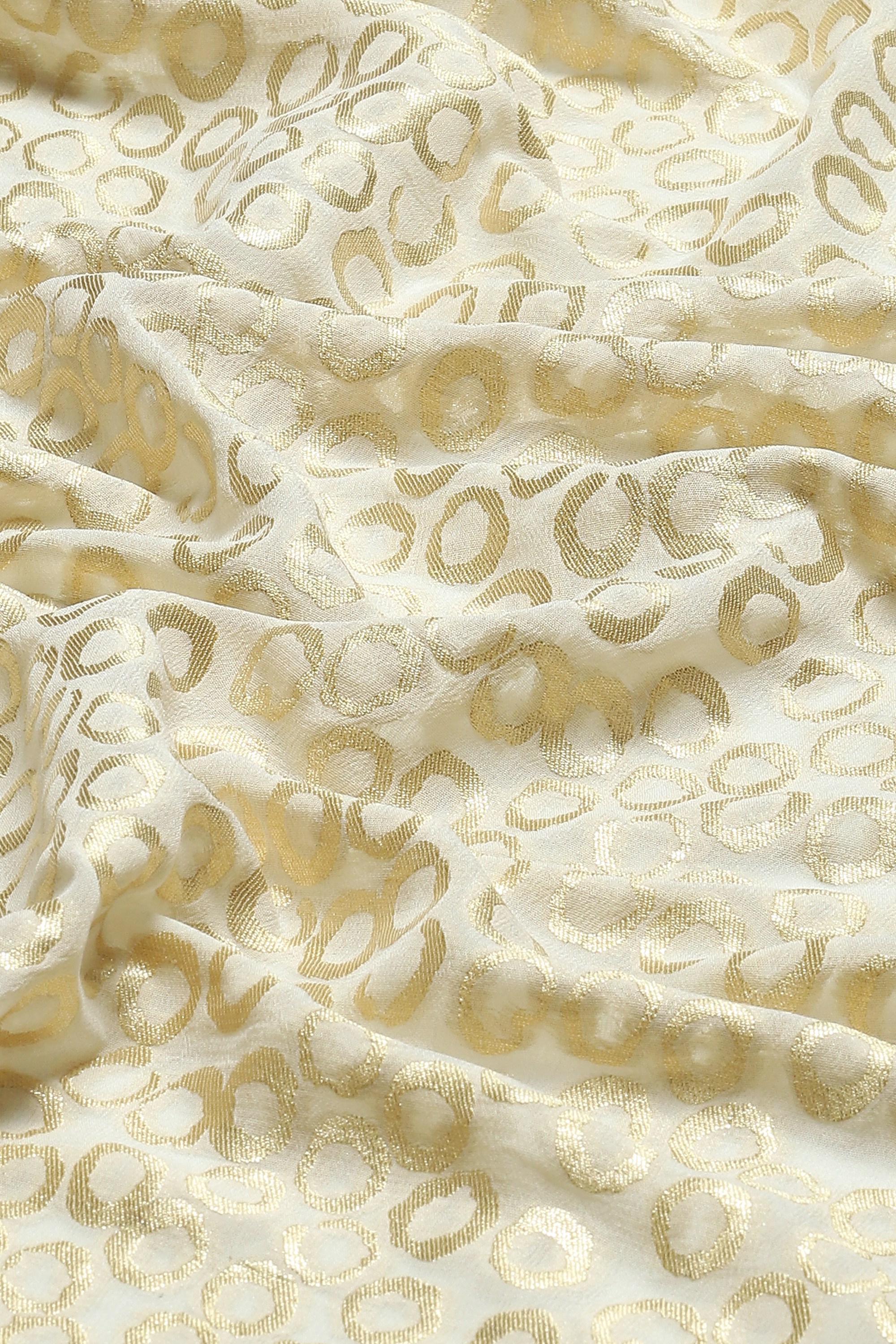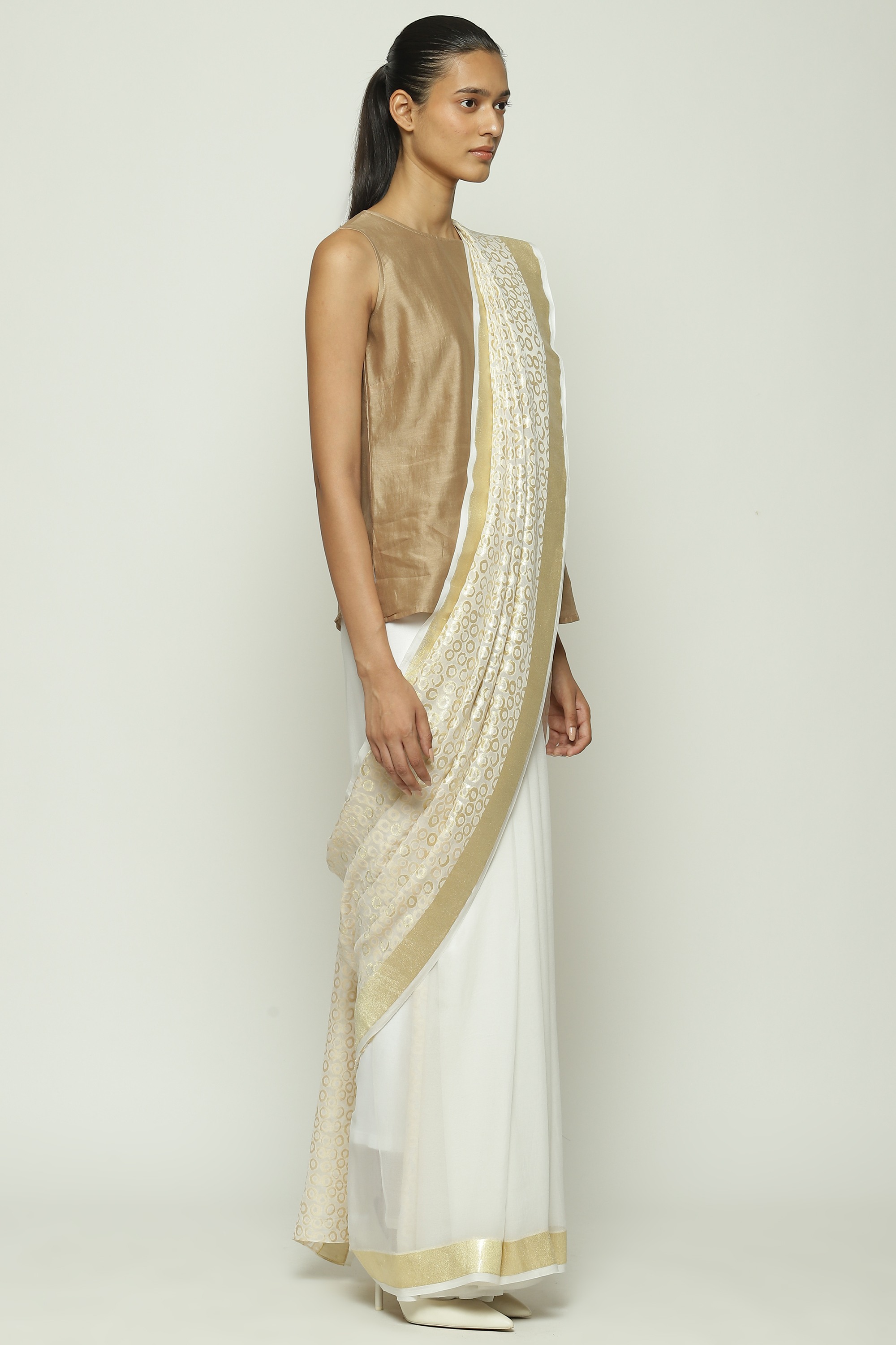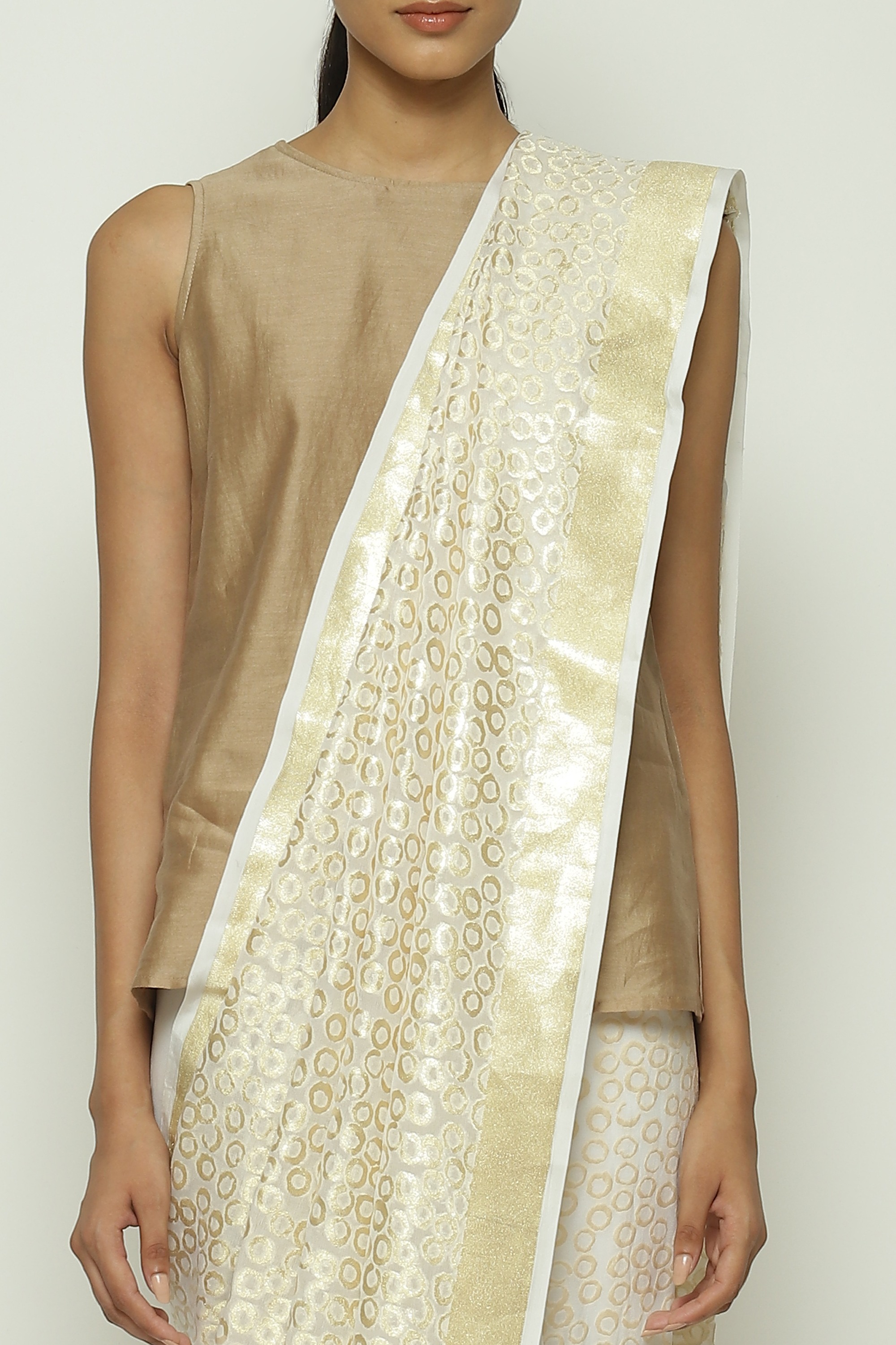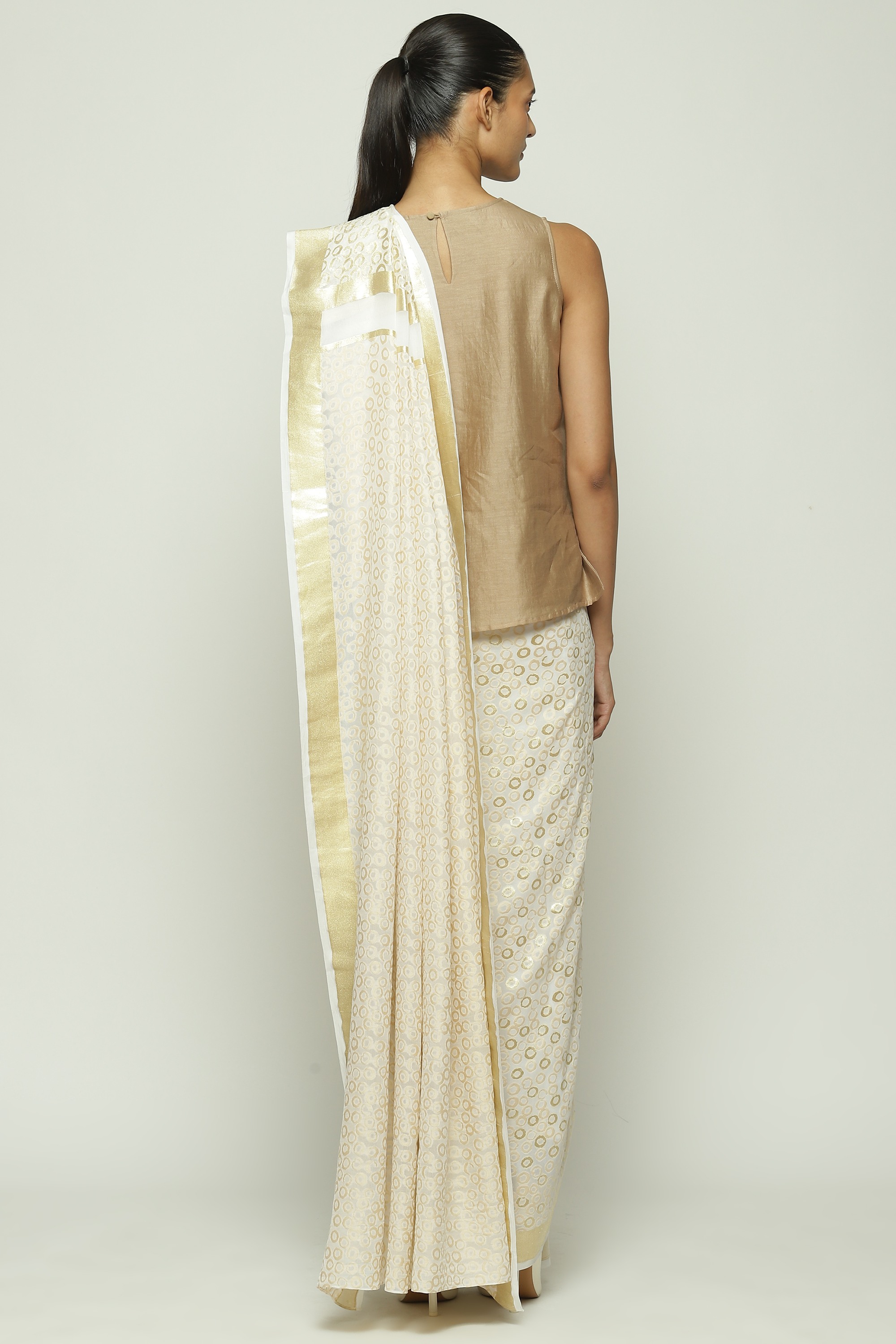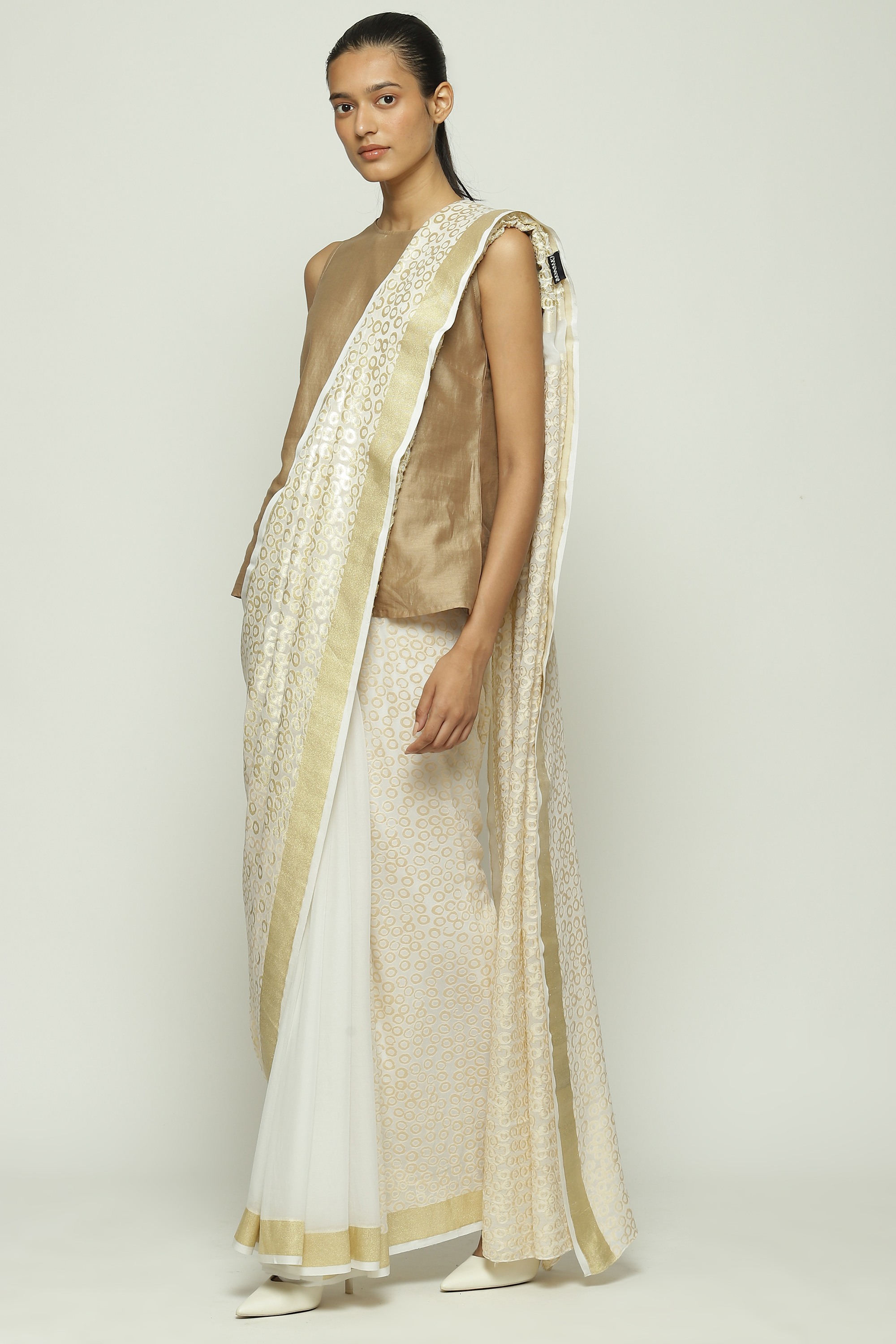 An off-white saree embellished with golden thread.