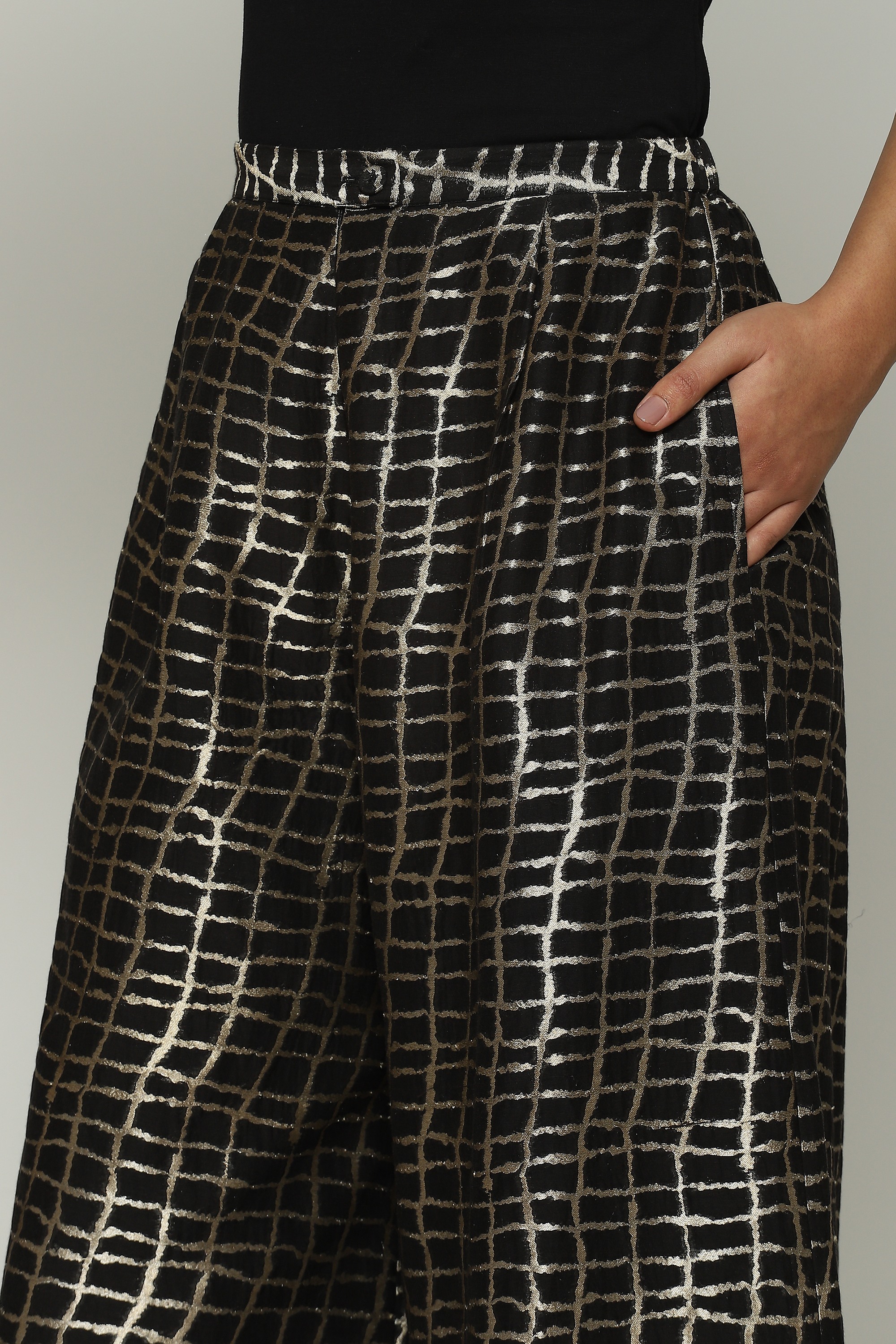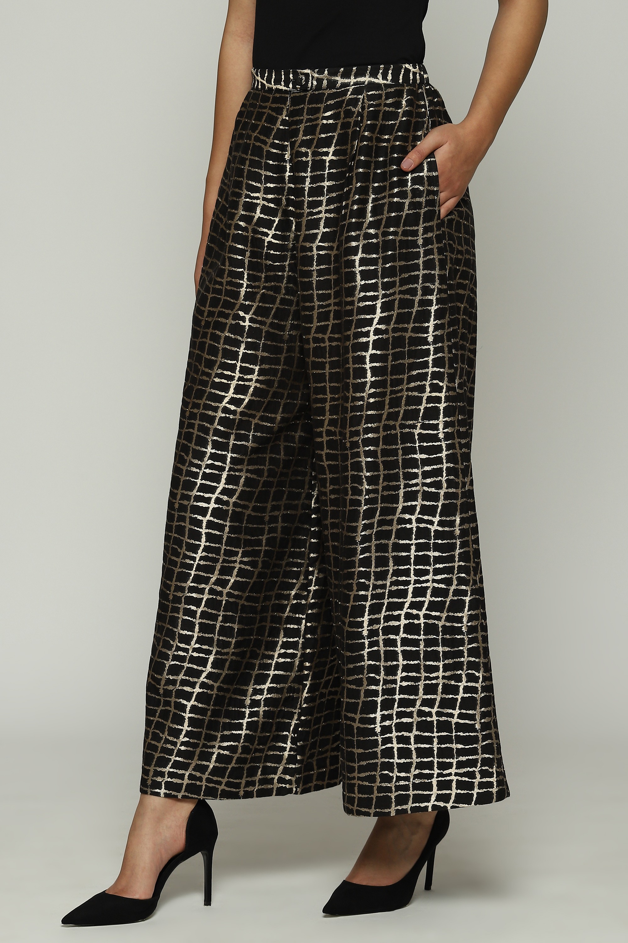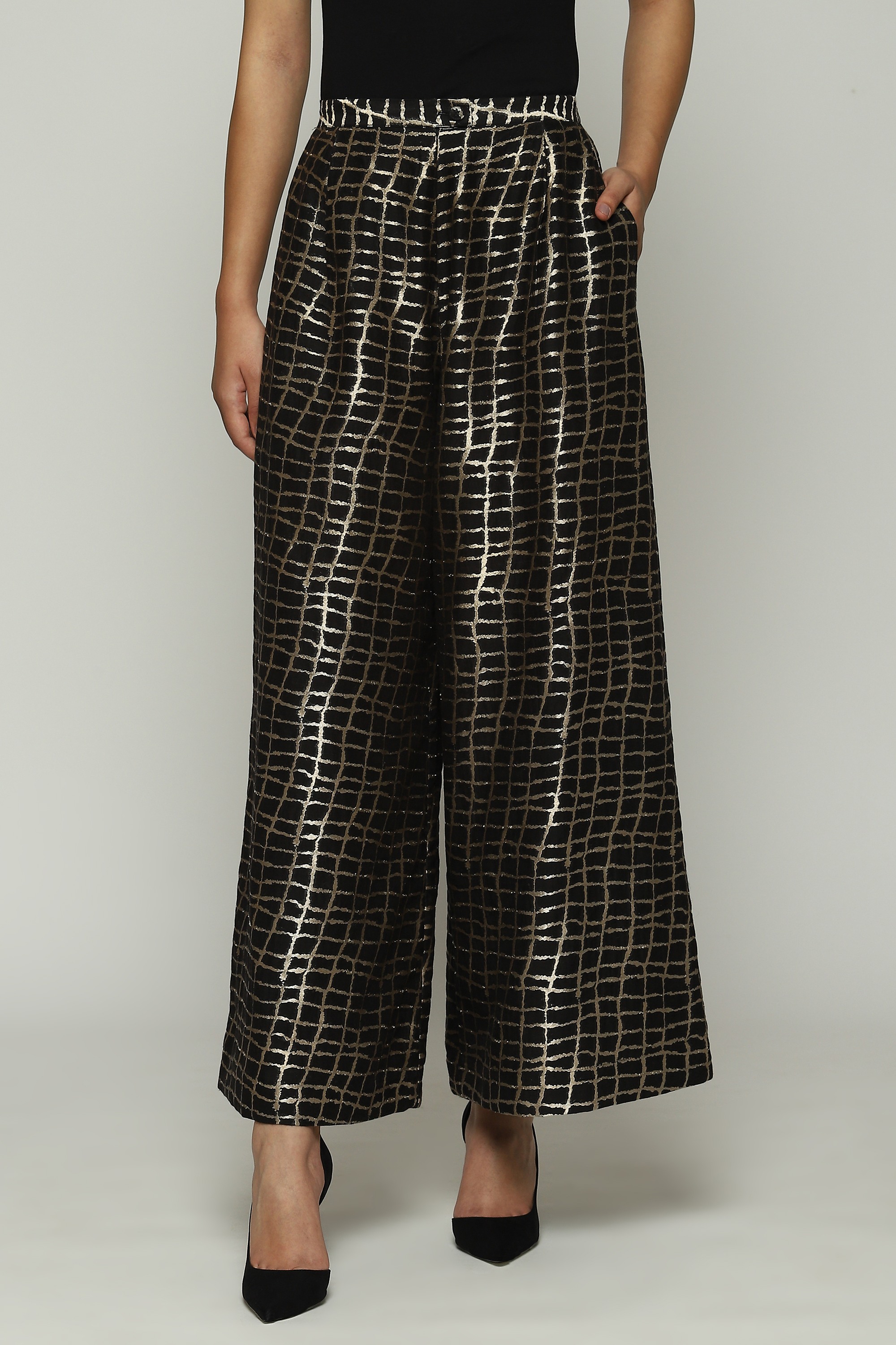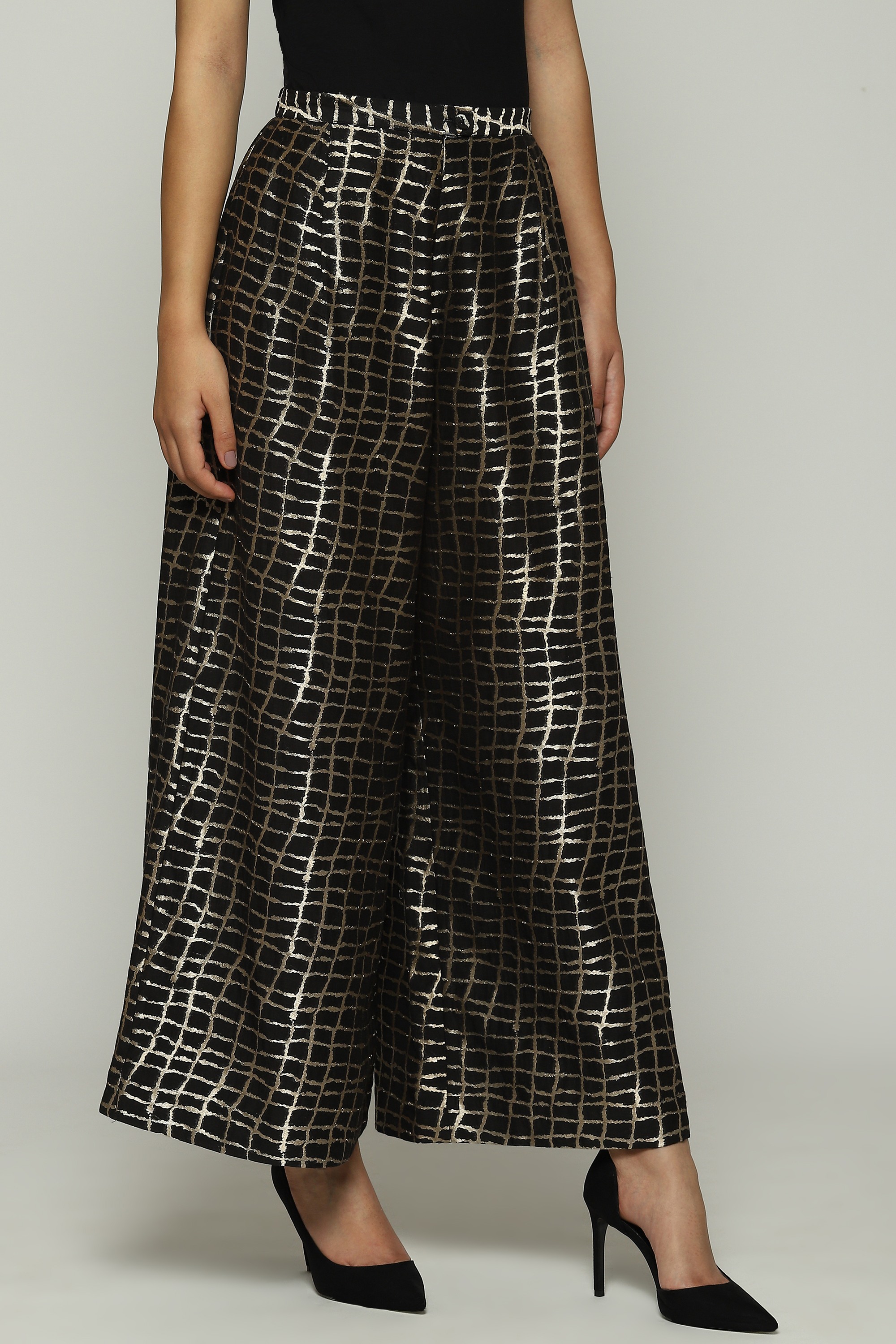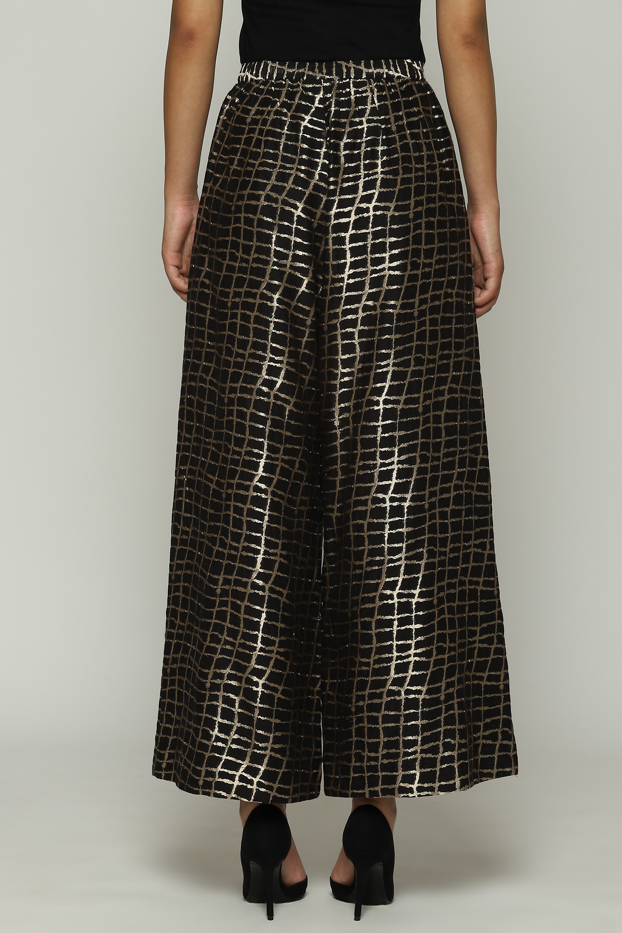A pair of black palazzo pants embellished with metallic gold.